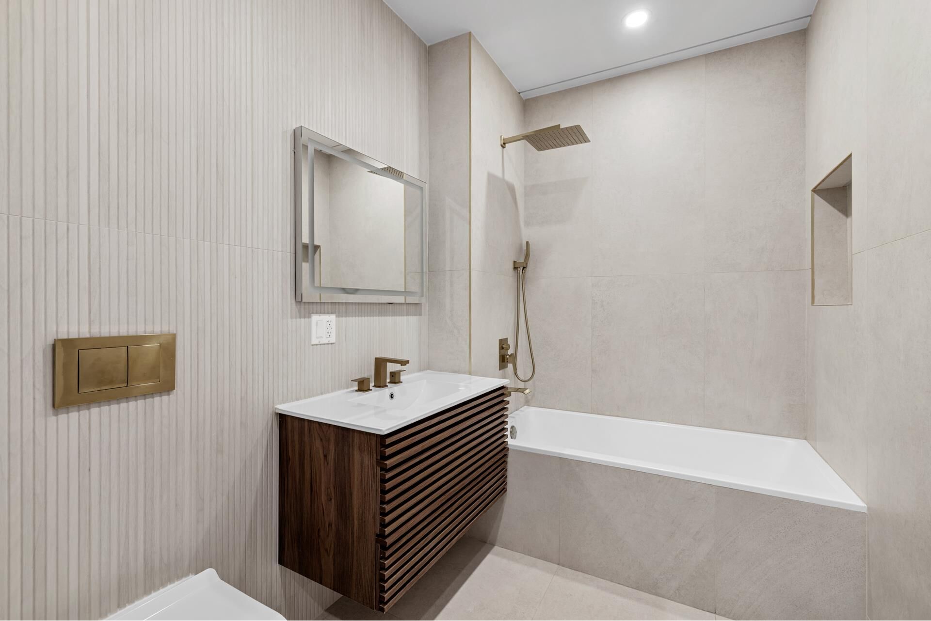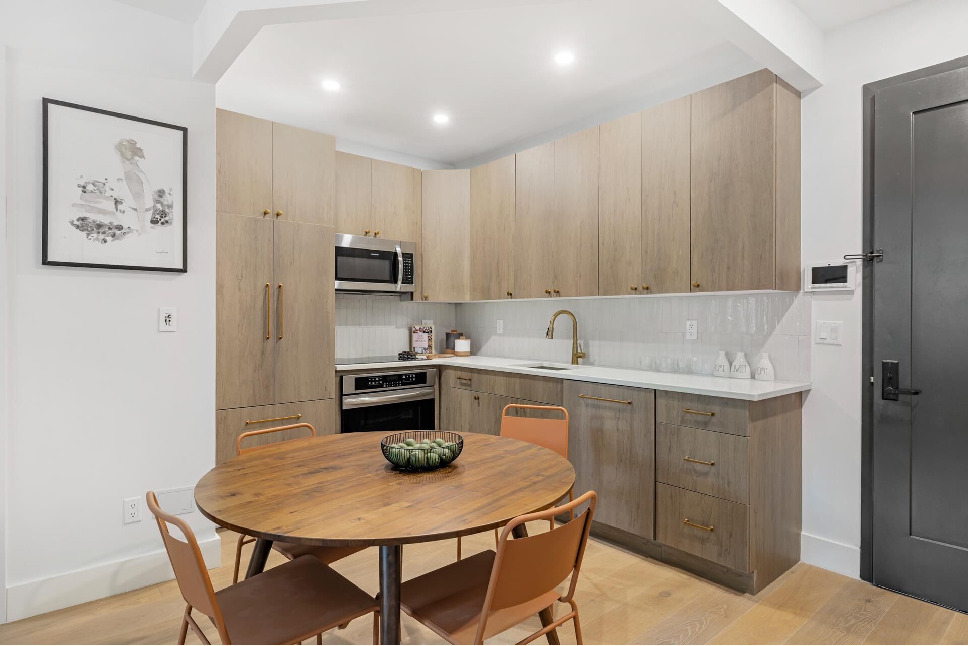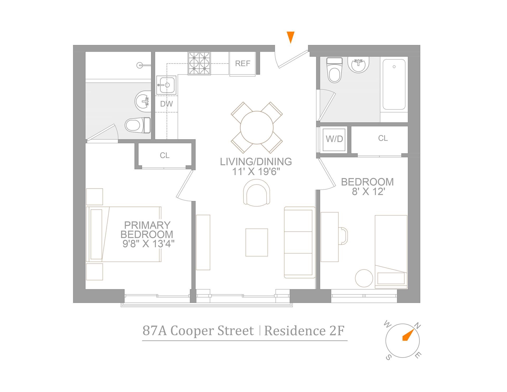 Residence 2F is a 2 bedroom, 2 bath home boasting an open concept floor plan, wide plank flooring, and abundant natural light. The roomy kitchen / living room combo flow beautifully together making entertaining a breeze. Custom wooden cabinets and classic vertical tile work create a warm and clean aesthetic in the kitchen, and the modern stainless steel appliances will delight any home chef. The package includes a Fisher & Paykel French door refrigerator, Beko dishwasher, and Frigidaire electric cooktop and microwave.