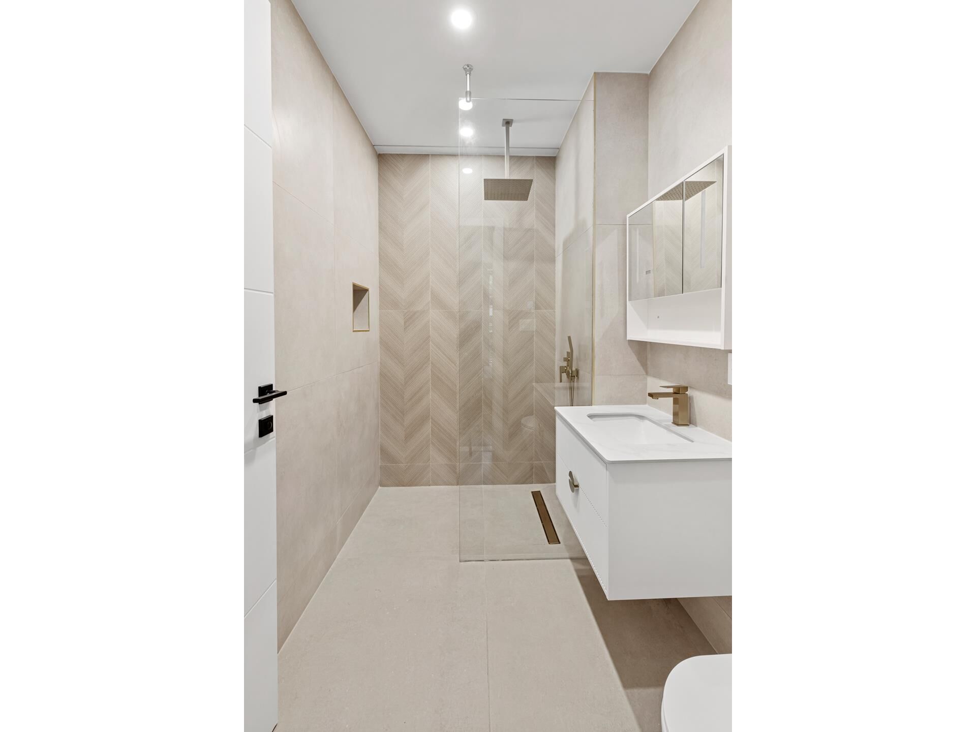 Two sizable bedrooms flank the main living space offering both privacy and convenience. The spacious master bedroom has its own en suite bathroom beautifully outfitted with herringbone tile, a floating vanity, and a glorious rain shower head. The full bath is just as elegantly appointed featuring calming neutral tile work and warm woodwork on the vanity. Shiny fixtures add a touch of sparkle to the space.