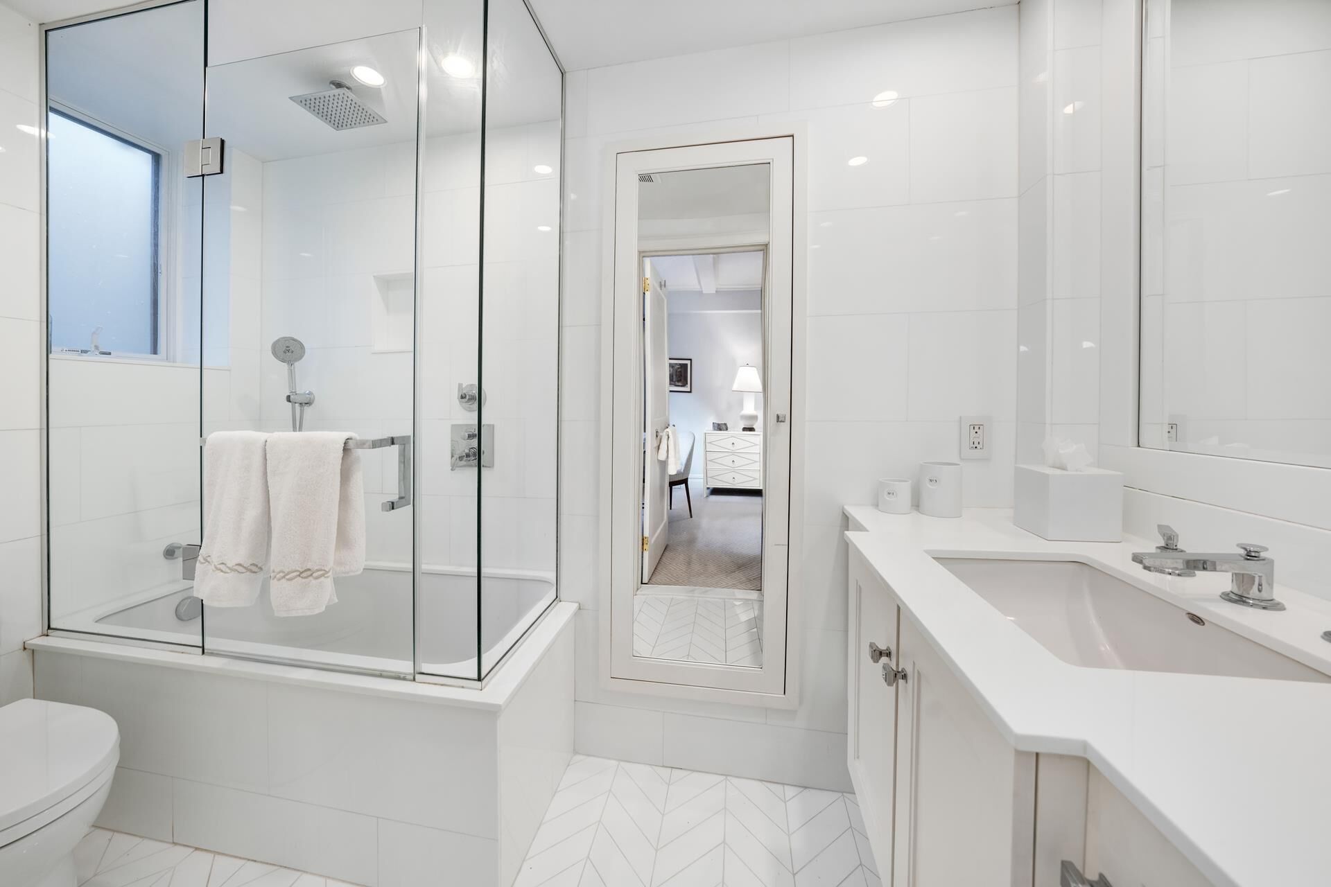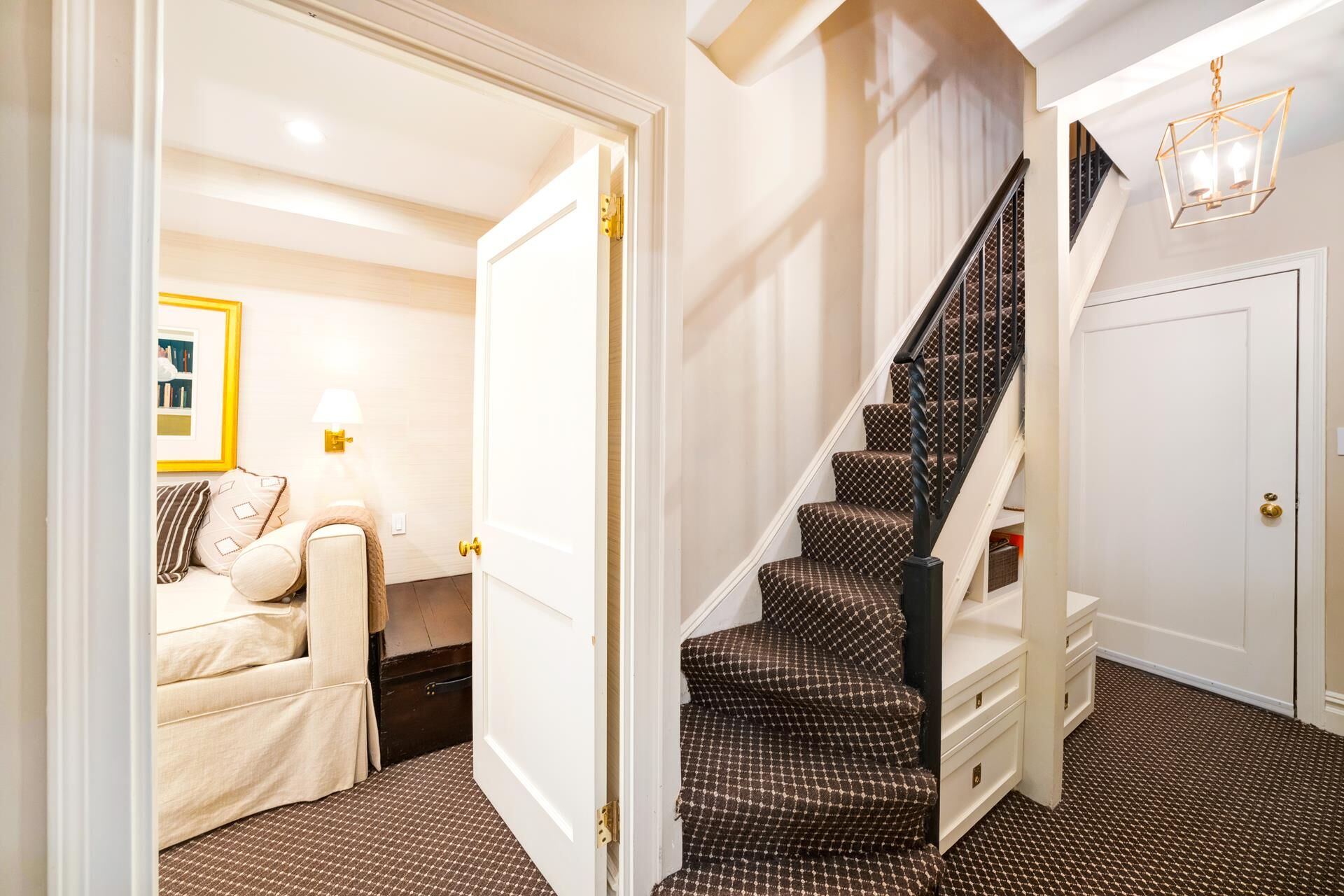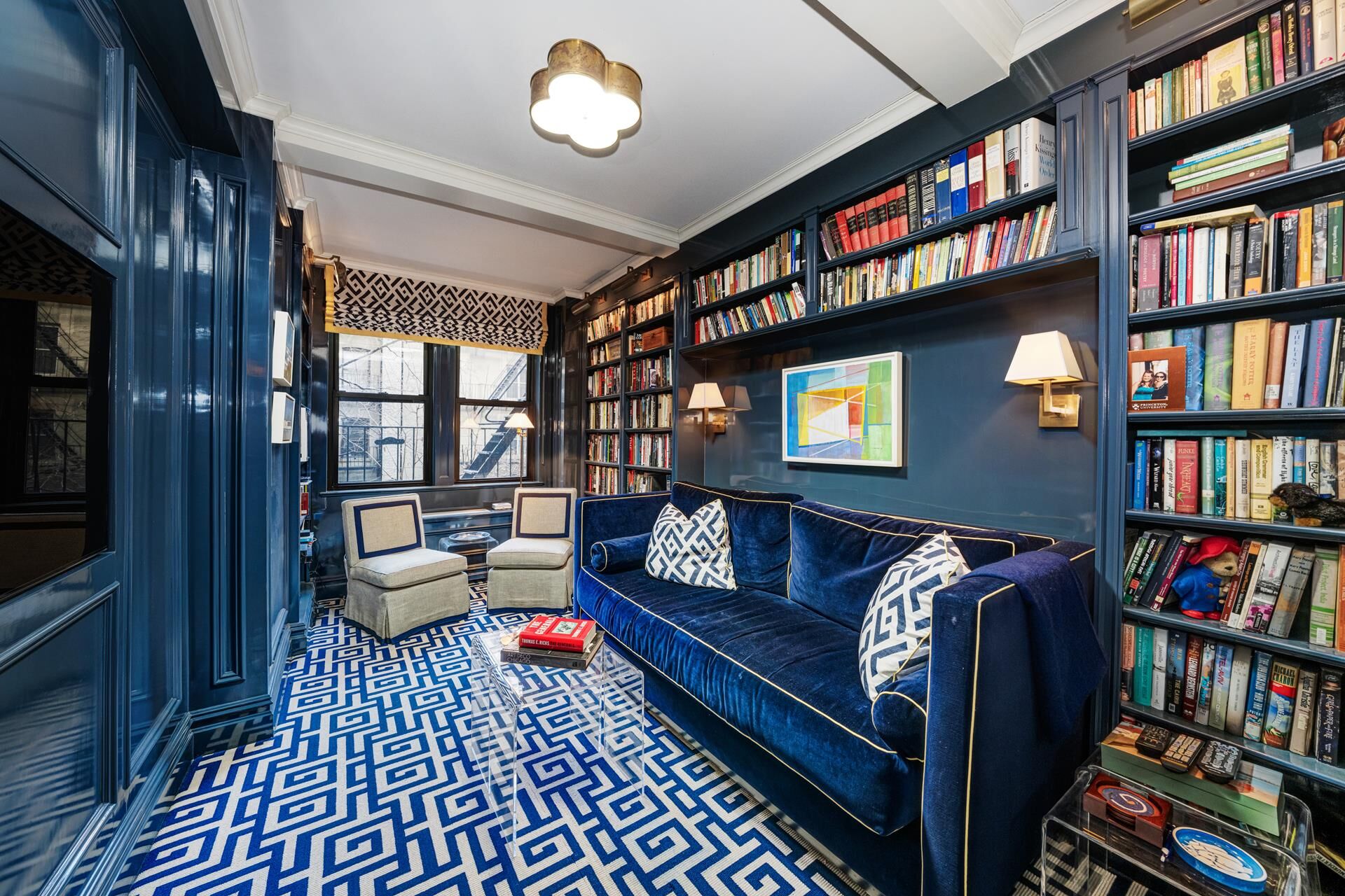 Spacious Primary Suite exudes tranquility overlooking the building's garden with a soothing water sound from its fountain. A windowed marble Bath and abundant closet space are en-suite. Versatile Second Bedroom with charming arched doors, currently used as a Den, impresses with exquisite lacquered walls and custom built-in shelves. Chic powder room and stylish staircase complete this level.