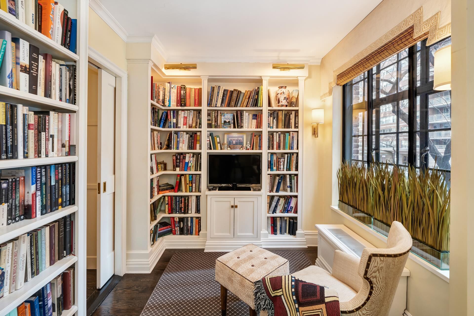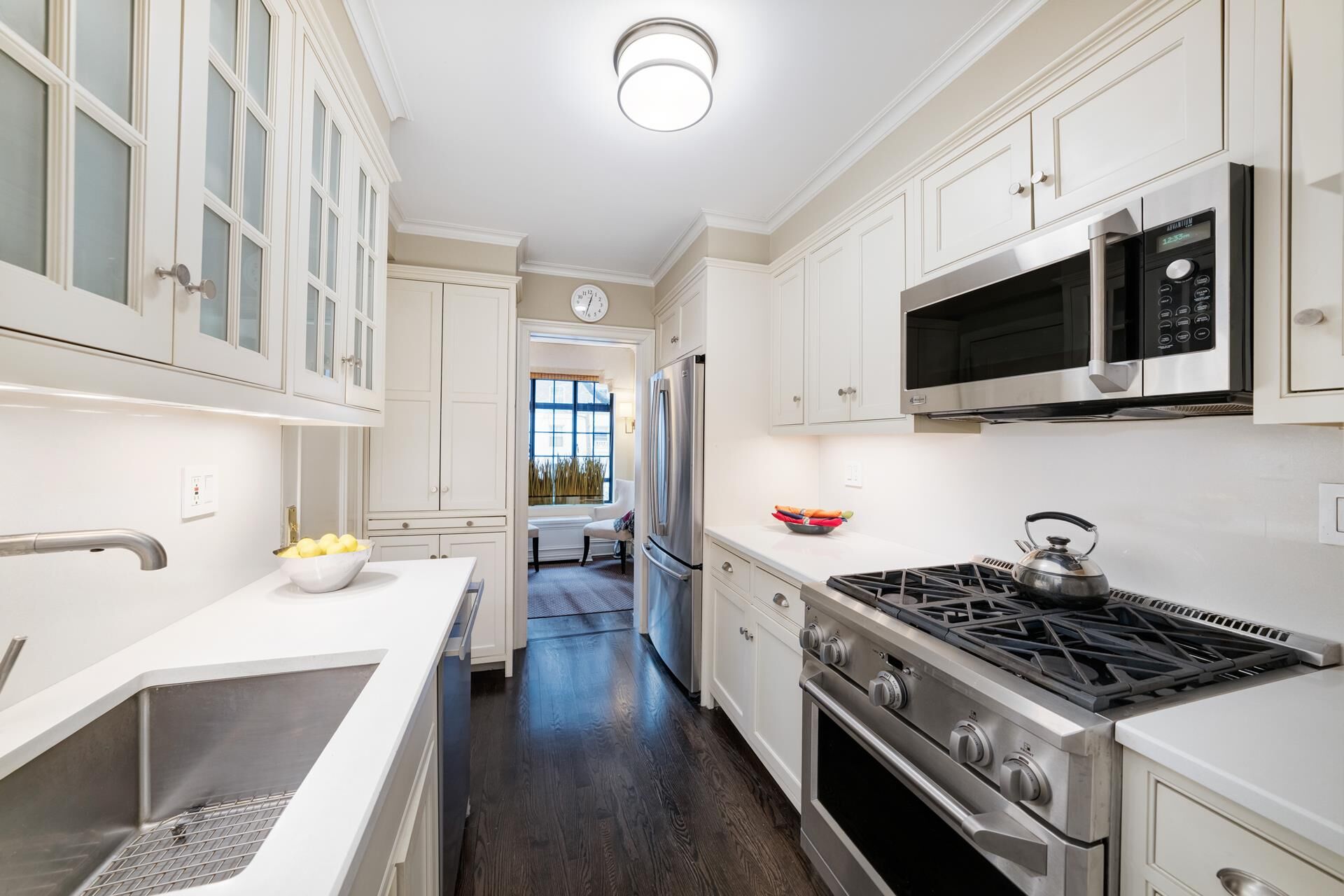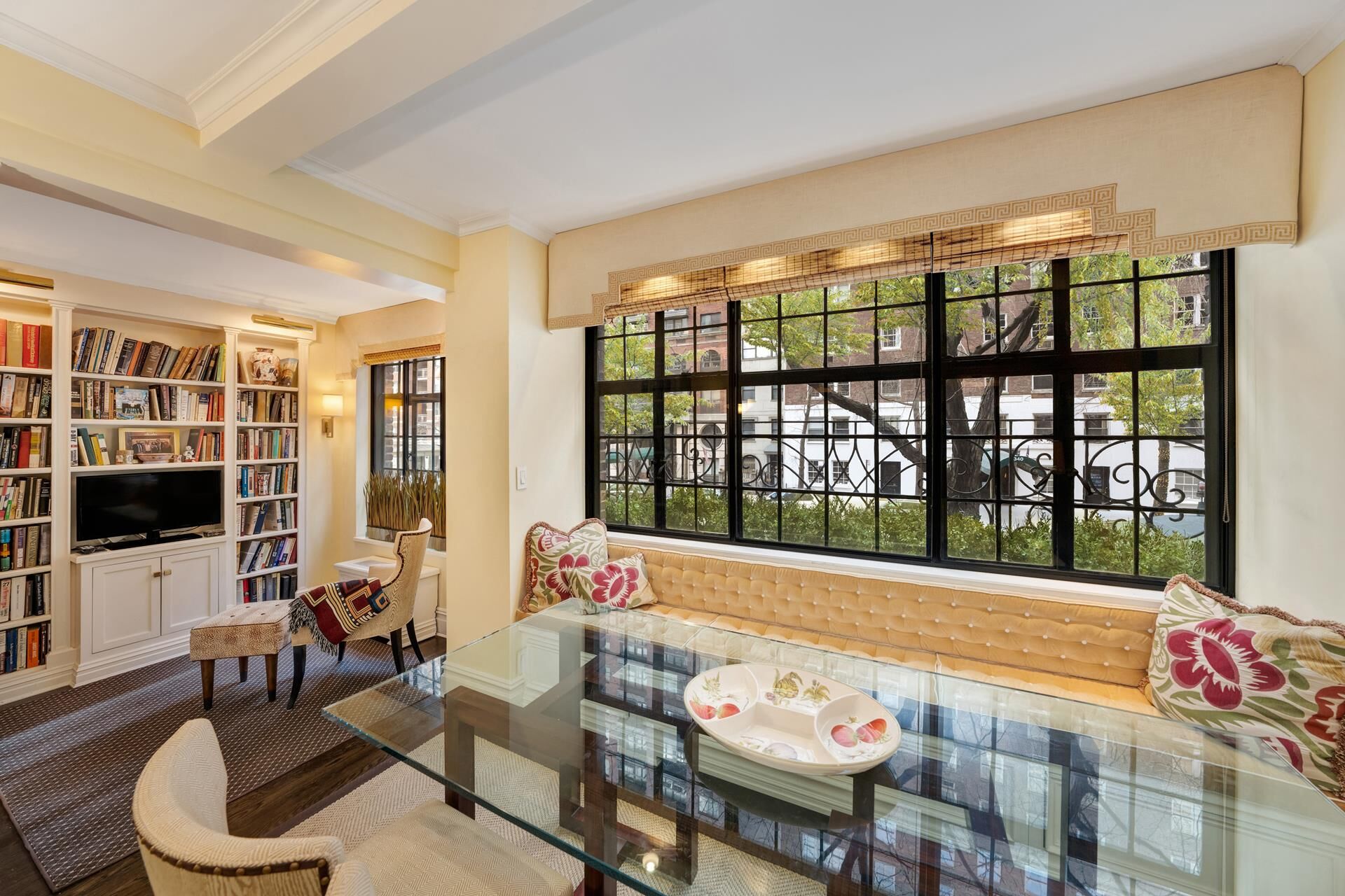 The main floor showcases a gracious Foyer opening into a stunning Park-Avenue-sized Living Room bathed in natural Southern light, complete with a working wood-burning fireplace, crown moldings, spectacular casement windows, and a built-in window seat. Adjacent is a windowed Dining-L, currently set-up as a Library/Media Room which opens into a true chef's kitchen with top-of-the line stainless-steel appliances, and a separate coffee-station for your morning indulgence.
