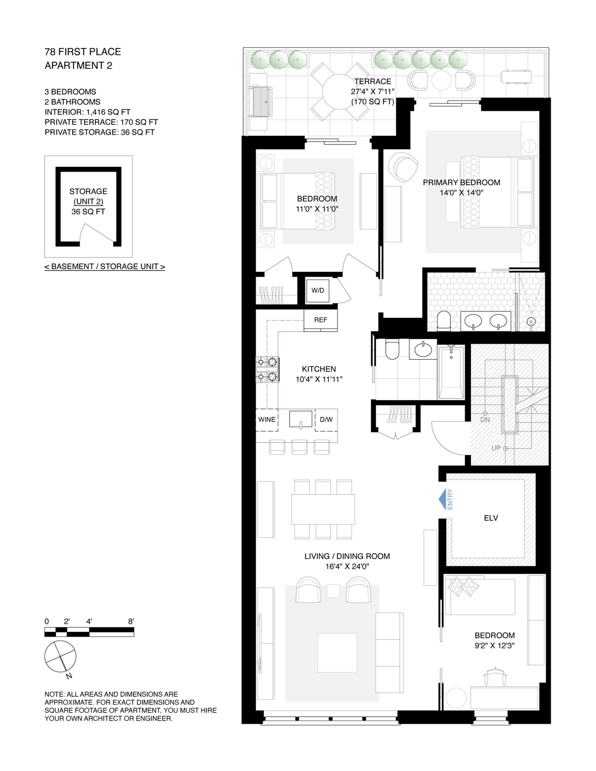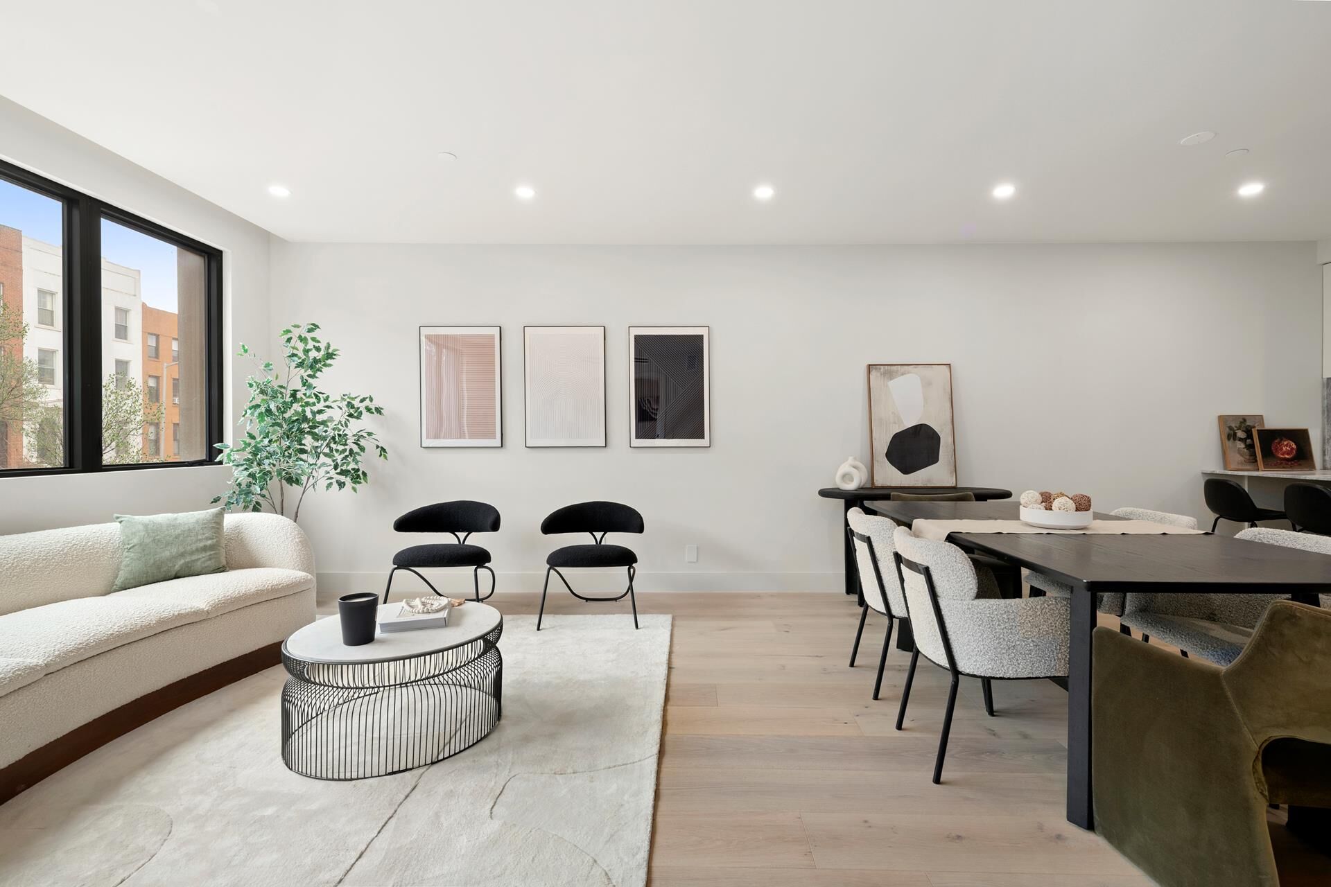 Residence No. 2 is an expansive three-bedroom, two-bathroom home occupying the entire second floor. A private keyed elevator opens directly into the sunlit great room, where oversized windows and an open layout create an inviting, airy ambiance. Designed for both relaxation and entertaining, this home boasts a large private rear terrace-spanning the full width of the building at 170 square feet-perfect for al fresco dining or quiet moments outdoors.