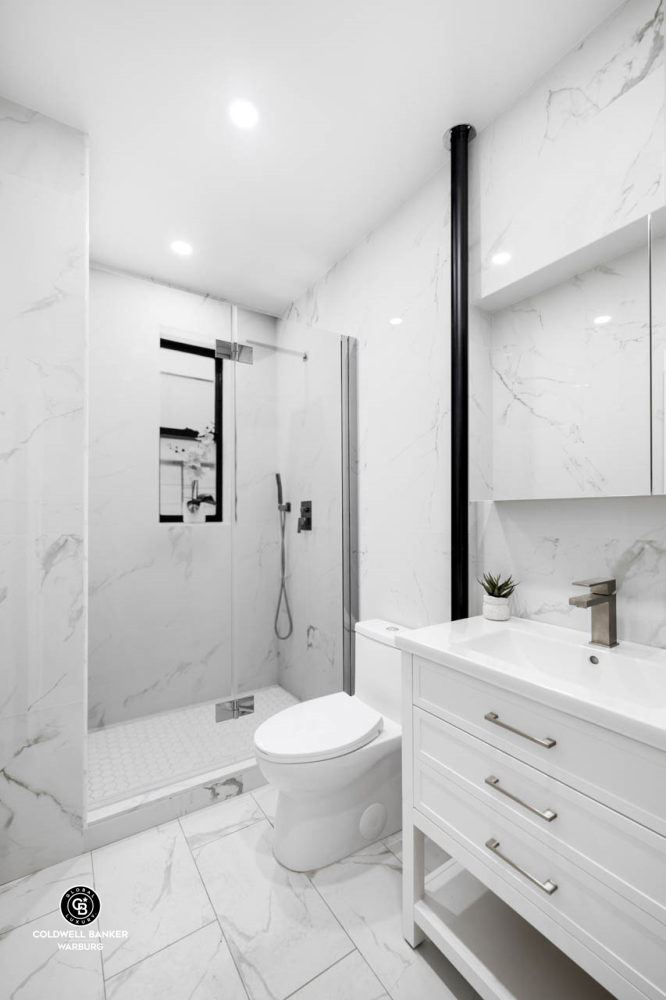 The gut-renovated windowed bathroom features porcelain tile and a glass-enclosed shower with a modern aesthetic. Washer/dryers are permitted in the building, and while the views in the unit are interior, the apartment gets great natural light! New hardwood floors throughout complete this lovely home.