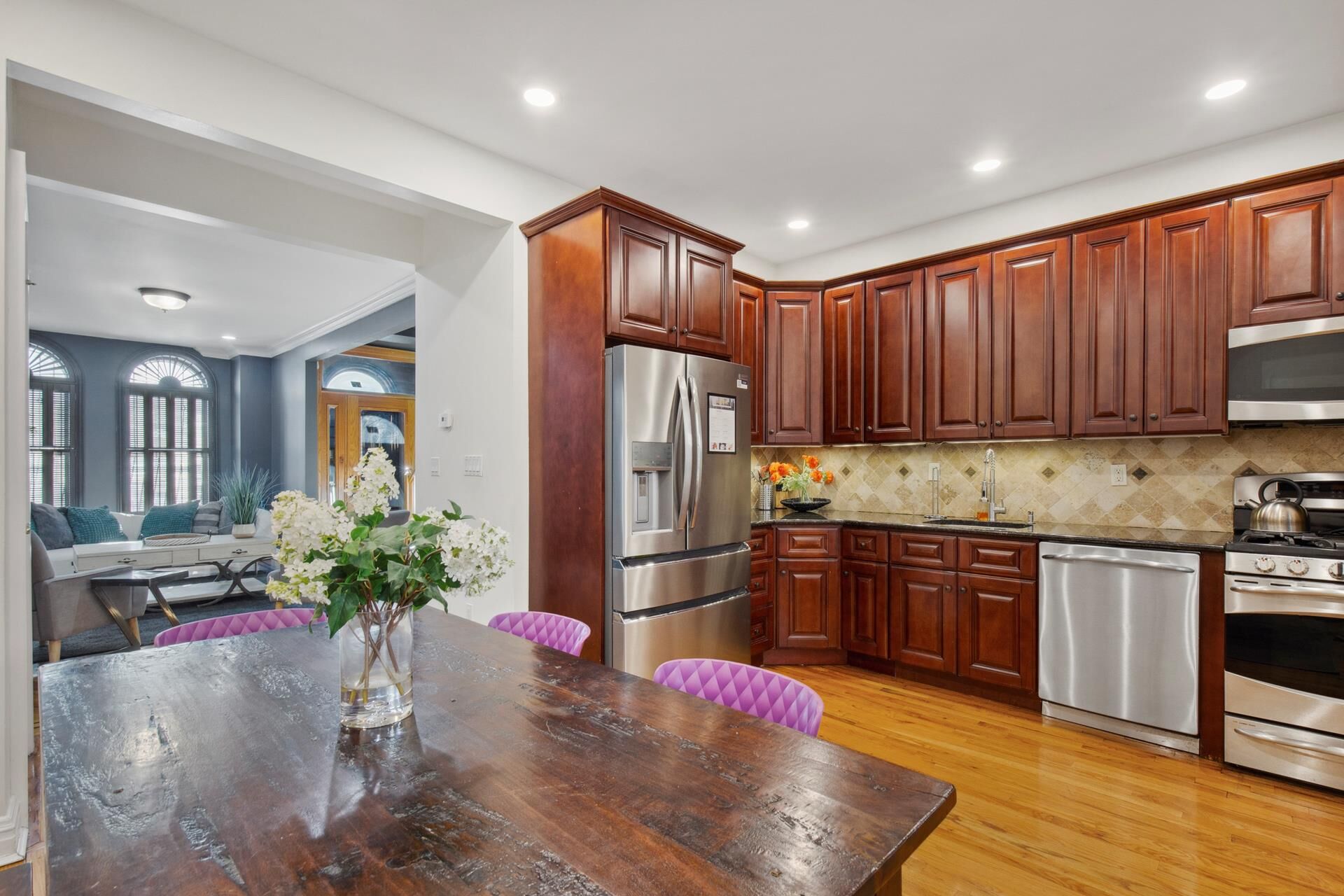- Welcoming living room with gleaming hardwood floors and soaring ceilings