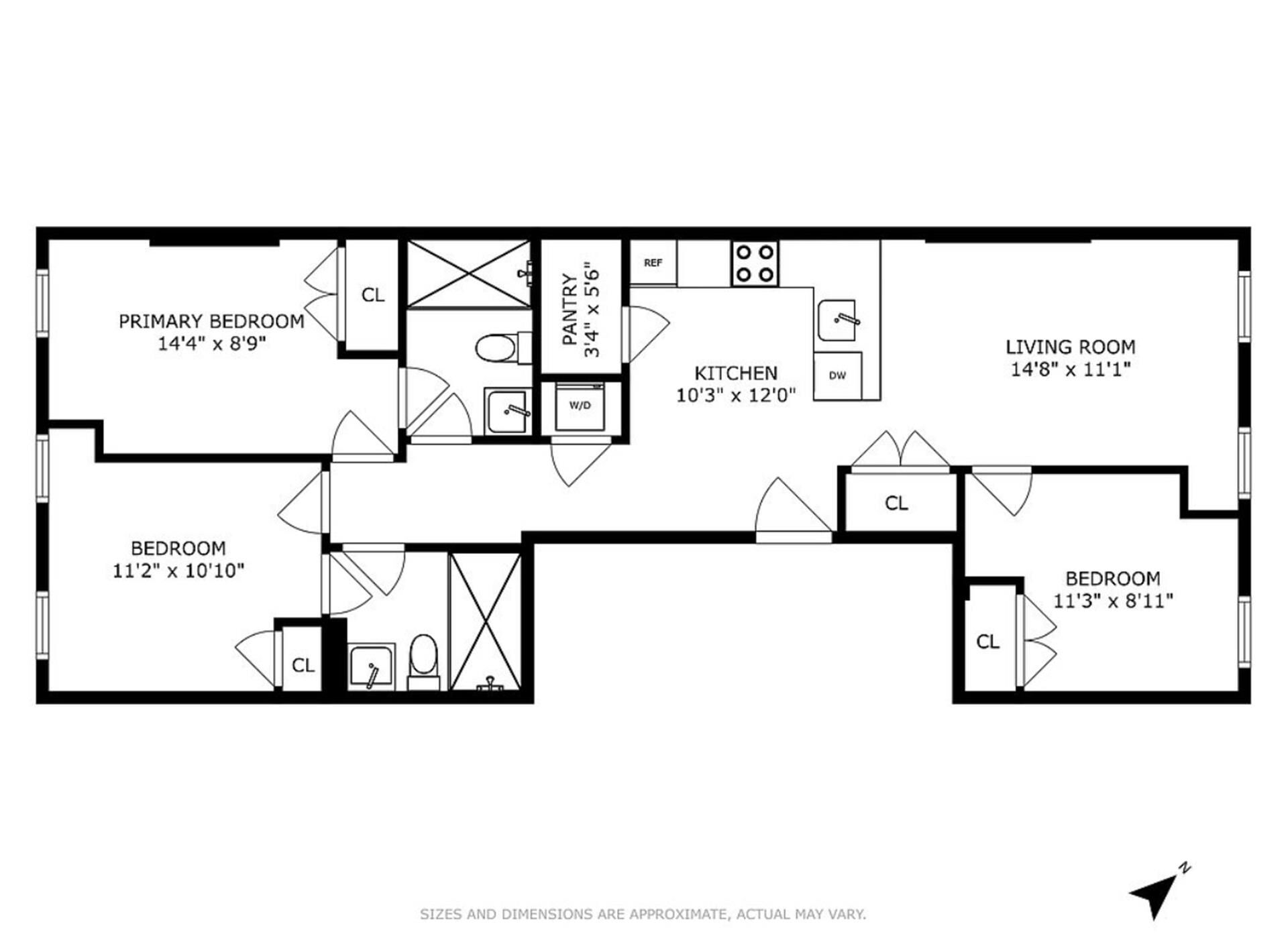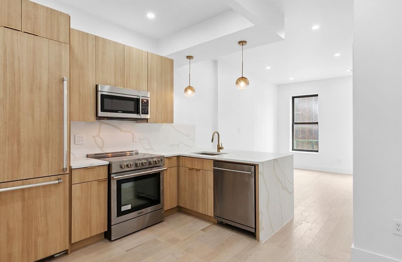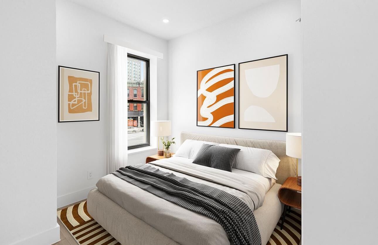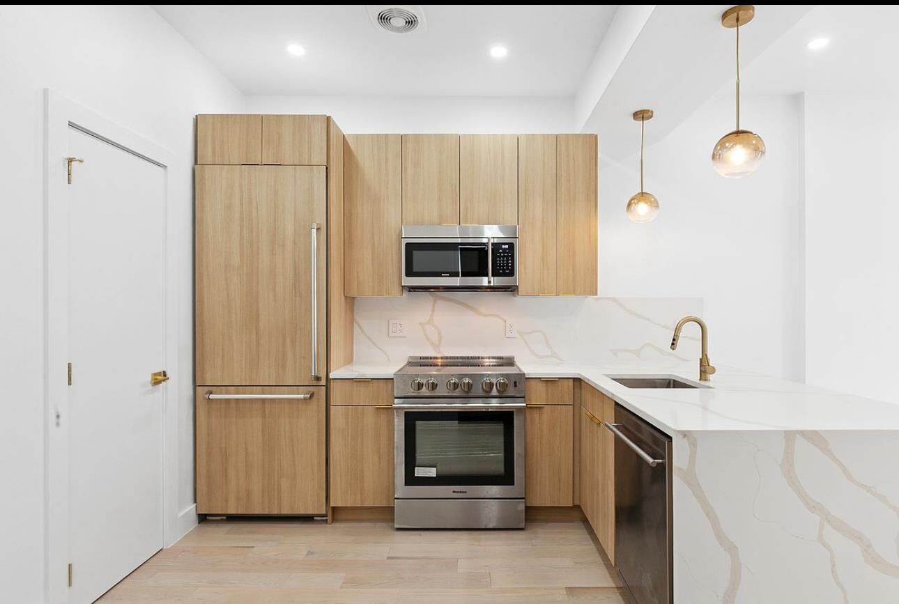 Upon entering the gracious foyer, you'll appreciate wide-plank white oak, hard wood flooring that extends throughout the apartment. Oversized windows bathe the interiors in natural light-even on the cloudiest of days. The kitchen features a full suite of stainless-steel appliances, sleek modern custom cabinetry, and pristine caesarstone countertops with waterfall edge, all accented by brushed brass hardware for a contemporary touch. All bedrooms can accommodate queen-size beds and dressers. The residence also offers ample closet space.
