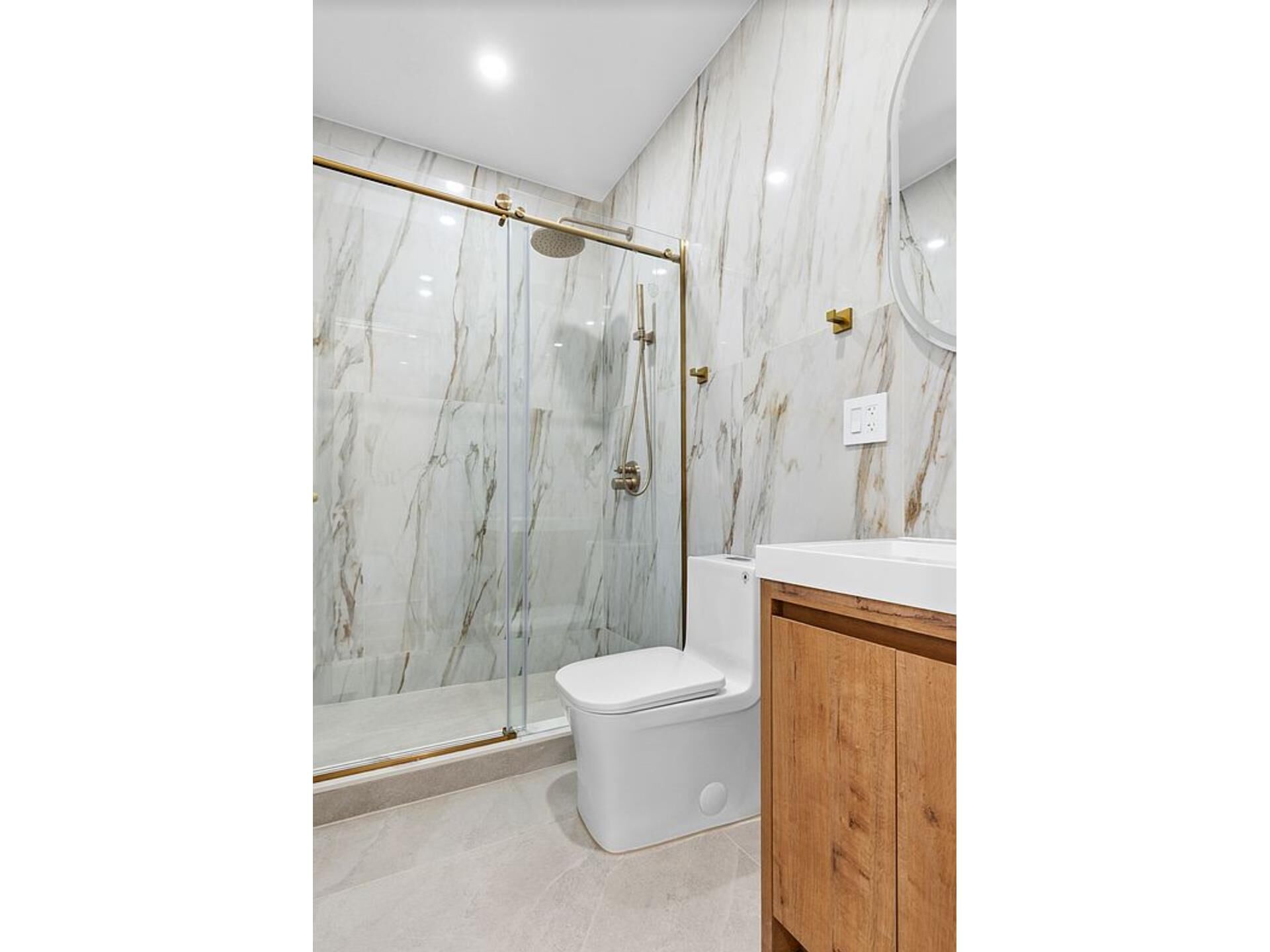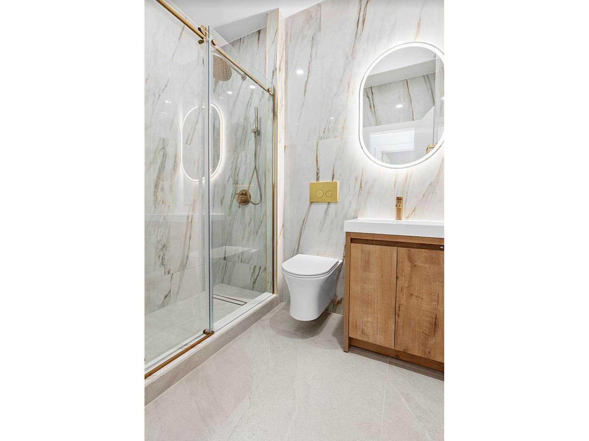 Both bathrooms are appointed with custom tilework, wood vanities with ample storage, walk-in showers, and coordinating brushed brass fixtures. Each room is individually climate-controlled via a split-unit system for year-round comfort through the Nest system. Additionally, a full-size washer and dryer are conveniently located in the unit.
