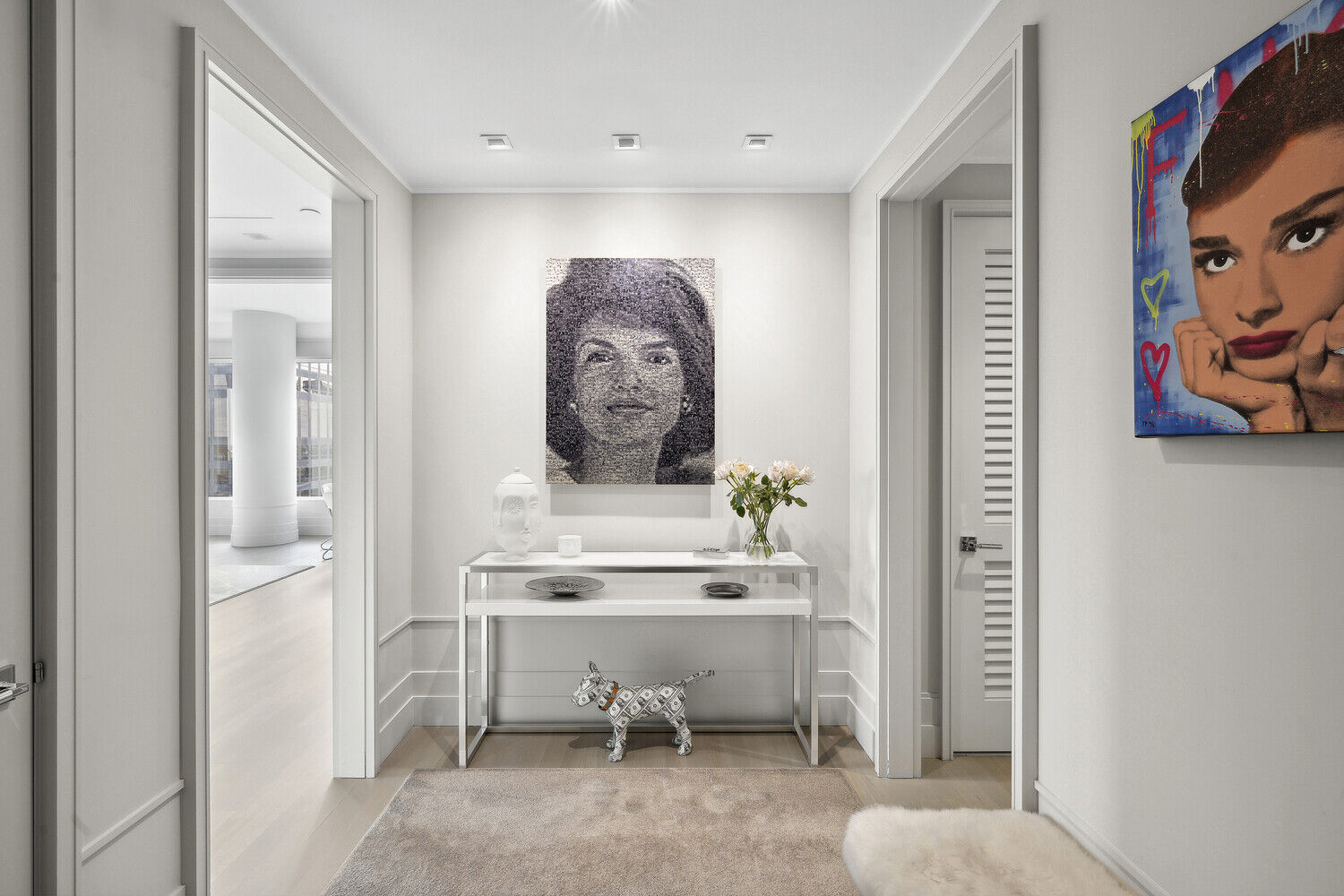 As you make your way down the vast hallway, you will find your primary bedroom with generous-sized closets and the ultimate primary bath with a deep soaking tub, dual marble vanities, and heated flooring. Additionally, the guest bedroom features an ensuite marble bathroom and custom closet with Downtown Skyline and East River views.