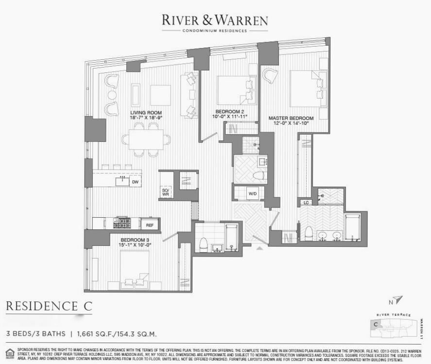 Welcome home to Residence 2C at River and Warren. This breathtaking 1,661 sq. ft. corner apartment features 3 bedrooms / 3 bathrooms. The residence encompasses both South & West Exposures offering views of the dazzling Hudson River, as well as Rockefeller Park. 2C has a gracious layout, perfect for entertaining, and is the epitome of luxury living. Enter 2C and onto 5-inch-wide plank oak flooring with a custom inlaid oversized pattern in the elegant entry gallery. Walkthrough to the main living room you’re greeted with exuberant natural light flowing through the 5 over-sized windows overlooking Rockefeller Park & the Hudson River. The windowed kitchen is an entertainer’s dream which includes a Sub-Zero refrigerator, dual-zone wine refrigerator, Miele gas cooktop, speed oven, dishwasher & an abundance of pantry space. This fully ready-to-entertain kitchen also has gorgeous White Quartz island, Calacatta countertops, Calacatta backsplash, custom millwork around the stove, and garbage disposal. The king-sized primary bedroom is flooded with natural light and features an abundant amount of custom closets. The primary bathroom is appointed with Bianco Puro marble walls and chevron patterned floors, as well as a custom-designed white oak vanity with polished nickel detail and Bianco Sivic marble top, waterworks fixtures, oversized standing shower, and deep soaking tub. The south-facing second bedroom is outfitted with custom closets. The third bedroom that faces the Hudson River can be used as a proper nursery, home office, kids bedroom, or proper guest bedroom. The second bathroom has been beautifully appointed with high-end fixtures and a deep-soaking tub. The third bathroom has a gorgeous marble finish and a standing stall shower. The unit has a great utility closet that is equipped with a Bosch washer/dryer. There is an additional storage locker available for sale. The apartment is located in one of the finest parts in all of New York; quintessential suburbia of NYC at your fingertips. 212 River & Warren is surrounded by Rockefeller & Teardrop park. This white-glove condominium is conveniently located within minutes of Tribeca and all it has to offer, including Brookfield Place, Le District, The Oculus, Whole Foods, cinemas, fine dining, gourmet markets, art galleries, social venues, and so much more to explore in this vibrant neighborhood. Exploring and commuting is made simple by the close proximity to the A, C, E, 1, 2, 3, Ferry, and PATH train lines. River & Warren designed by CetraRuddy, who are known for their sophisticated architectural design, have meticulously reimagined all of the residences and amenities from the ground up. This white-glove condominium features top of the line amenities such as a full-time doorman/concierge, fitness center, children’s playroom, and the direct Hudson River view landscaped rooftop equipped with BBQ grills.