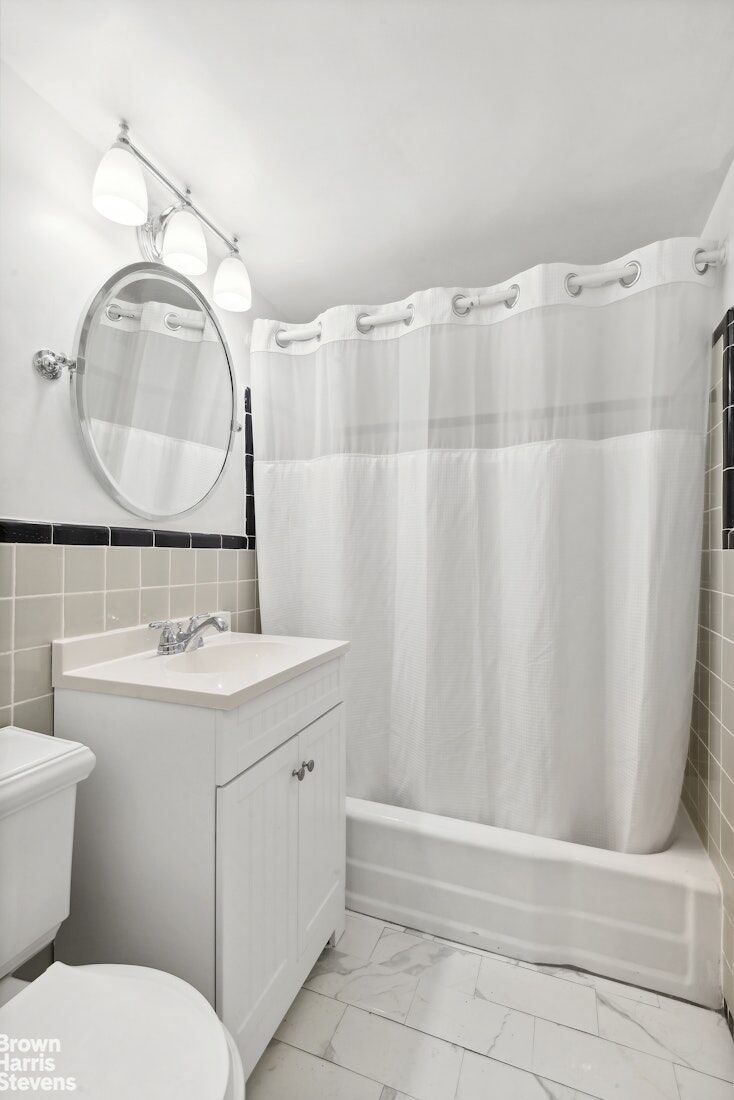 Updated Bathroom: A contemporary oasis with elegant fixtures, floating mirror, storage vanity, full-sized tub and hidden medicine cabinet.