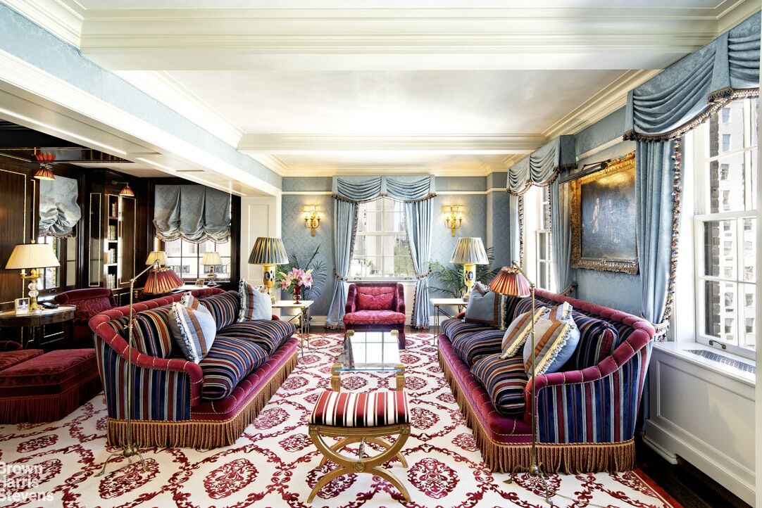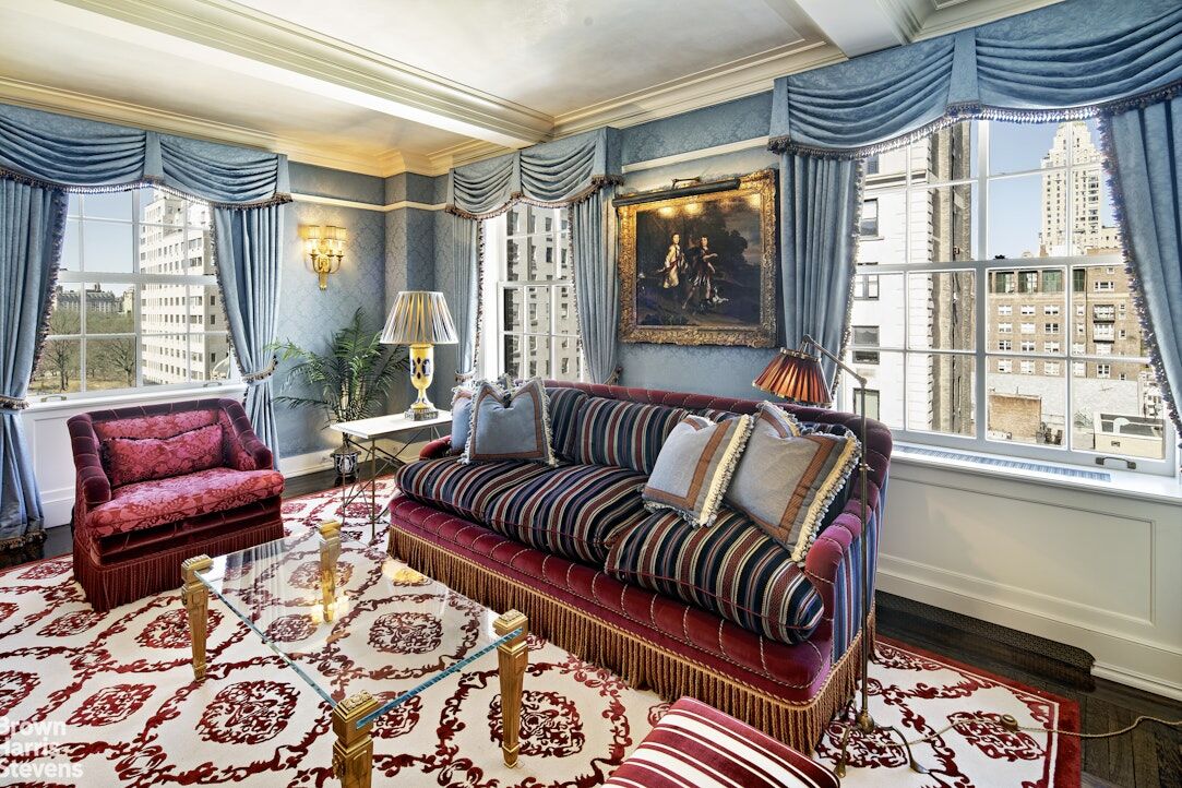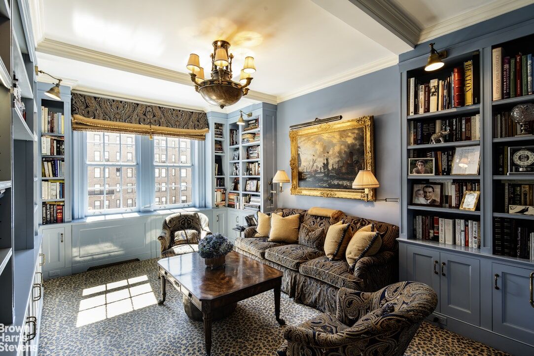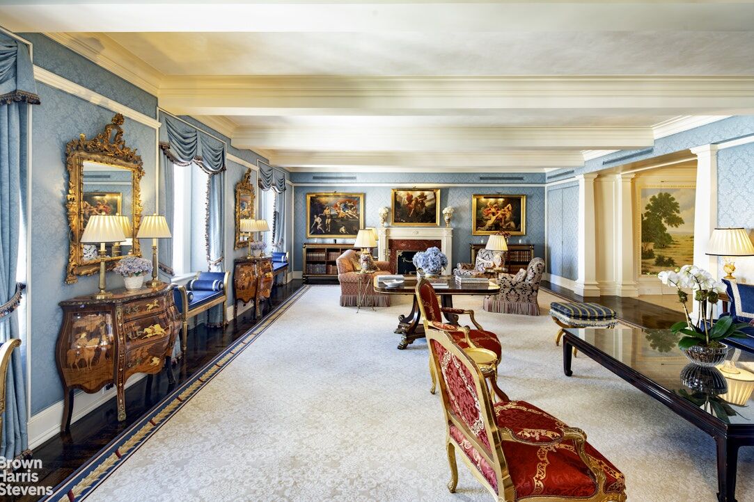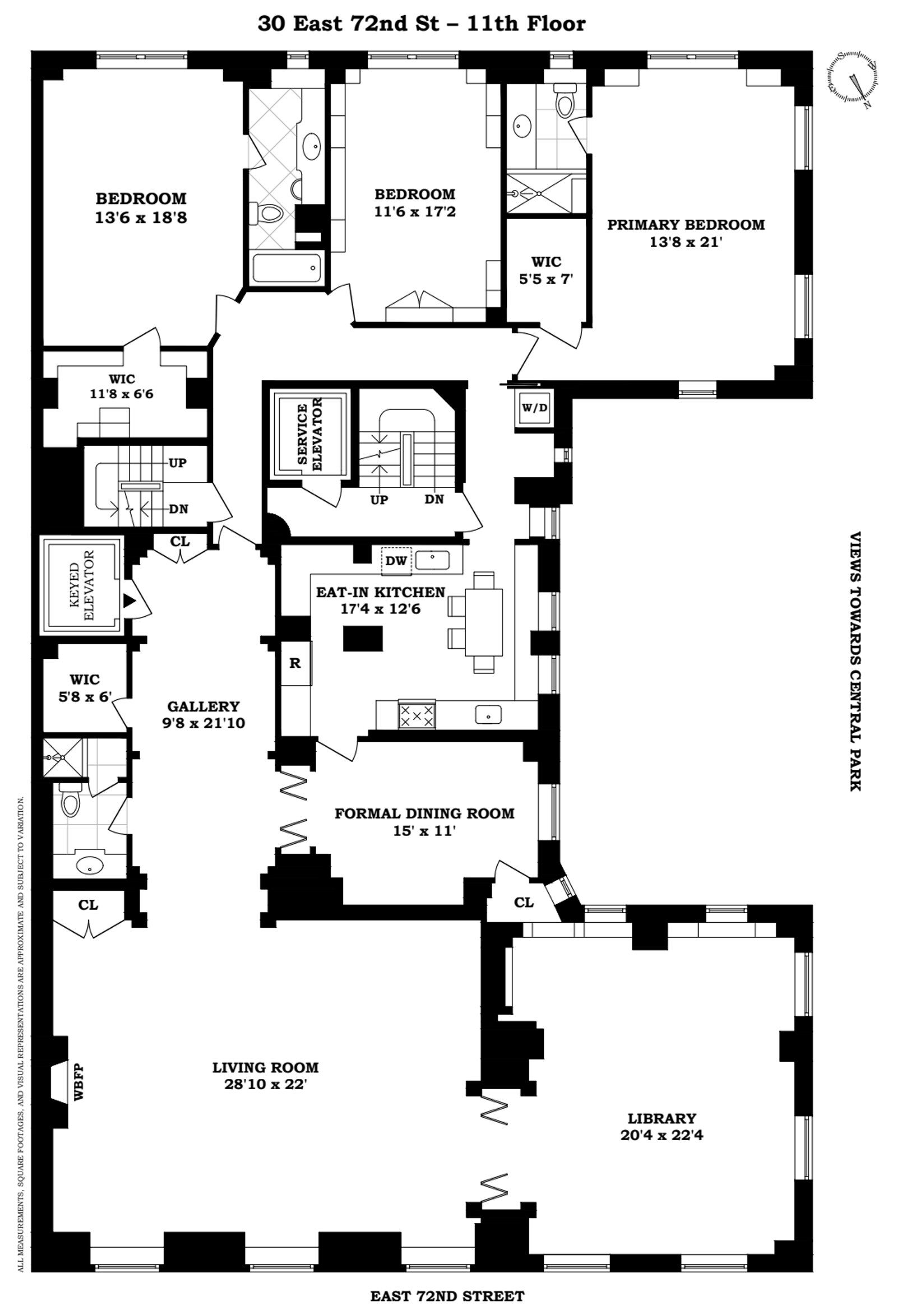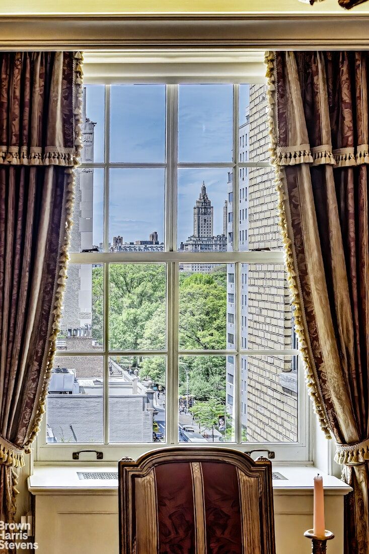 The stunning 22 x 10 entrance gallery leads to an impressive 60 foot enfilade of entertaining space which includes an exceptionally grand living room with a wood burning fireplace and an adjacent triple-exposure library with captivating views of Central Park in the distance. The formal dining room also faces west and has views of Central Park. The adjacent oversized chef's eat-in-kitchen has been fully renovated with top-of- the-line appliances and is flooded with natural light throughout the day. A large table can seat as many as six. It too faces west and captures Central Park views in the distance.