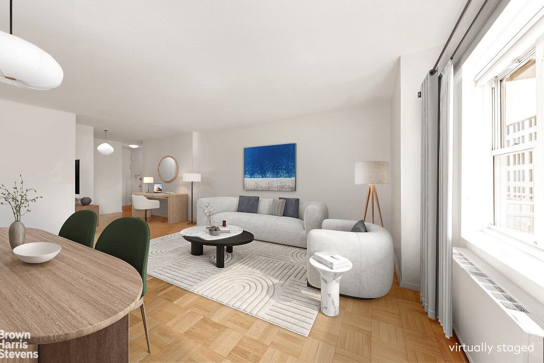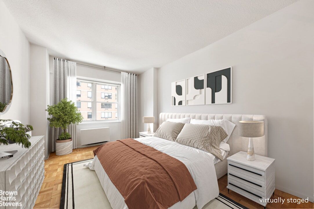This bright, airy corner Jr 4 unit with expansive, windowed exposure to south and east is connected to the sky and the streets in one of New York's most lively quarters. Approximately 1,000 square feet with 9' ceilings throughout, this apartment offers a rare invitation to breathe deep and relax in the heart of Greenwich Village. The abundant closets (including a bedroom walk in) add spacious appeal. Well maintained, this Jr 4 is turnkey ready for easy living in mid Century comfort while allowing extraordinary opportunity for remodeling to either add an extra room or to create the open space of your dreams with building approval. Central HVAC keeps the space toasty warm in winter and cool in summer with the help of all double-glazed windows that also shield against city noise. It comes with all the unseen benefits of a CONDOP, making it a great opportunity as a home or as an investment. Fulltime building staff maintain facilities in peak condition and provide 24/7 lobby coverage. On the 35th floor the gorgeous planted roof is a great place to relax or entertain with spectacular city views and boasts an open swimming pool with adjacent gym (fully equipped). The building is pet friendly. Special features include laundry facilities on every floor, a basement parking garage with direct passenger elevator access, quick access to N, R, W and 6 trains and best of all, as a CONDOP no board approval necessary. Located 2 short blocks from Washington Square Park and University Place the neighborhood is rich with dining, retail and other cultural opportunities.