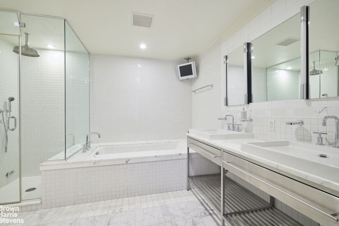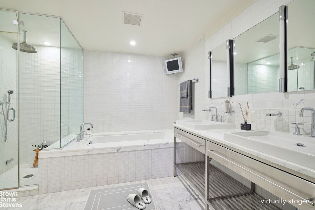 Down the bedroom hallway you'll find a GE washer and dryer, full bathroom, and storage closets. The generously sized primary bedroom has a private dressing room and en-suite 5 piece marble bathroom.