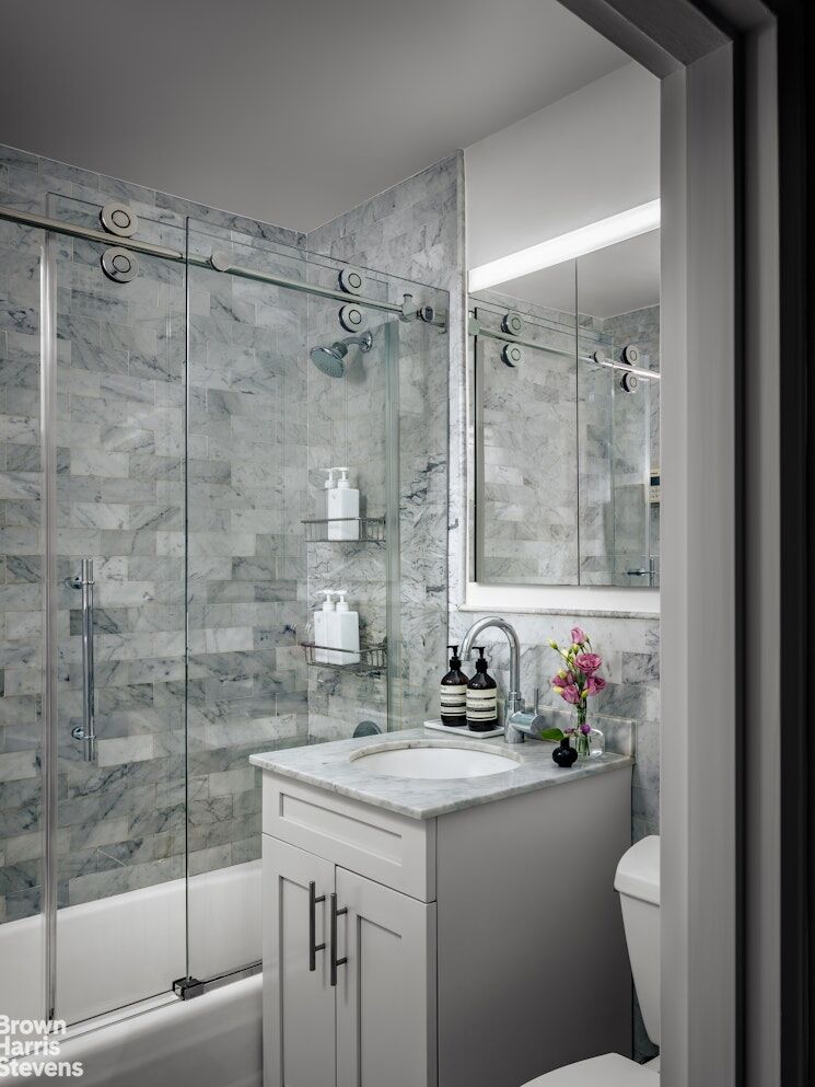 Similarly, the charming marble bathroom was thoughtfully enhanced with a sliding glass shower door, a deep vanity and a generous recessed medicine cabinet.