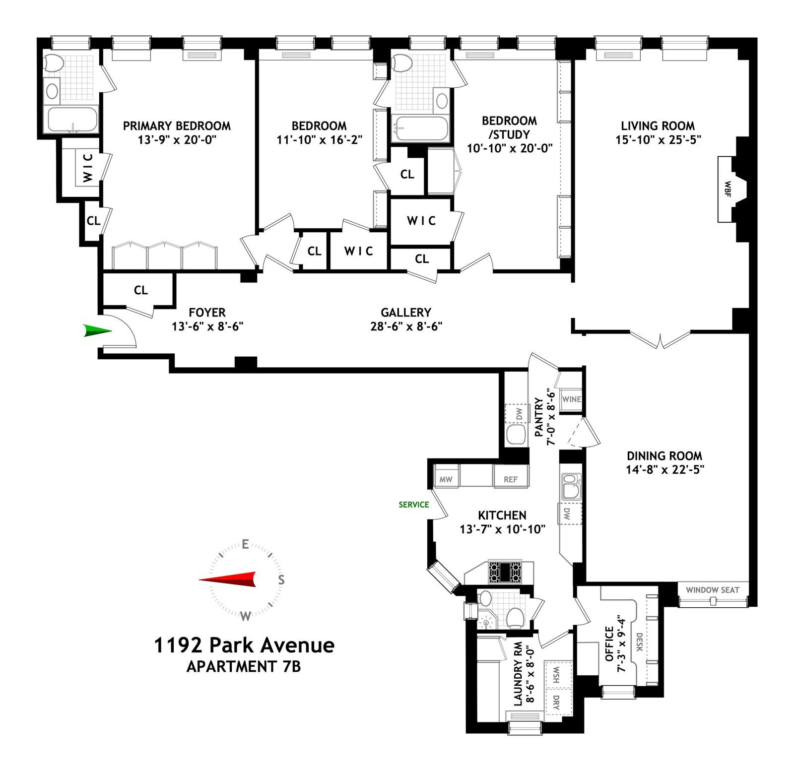 The windowed, eat-in-kitchen features beautiful wood cabinetry, granite countertops and Miele, Viking and Subzero appliances, as well as a butler’s pantry with second dishwasher, mini-fridge and large wine storage. Two former staff rooms have been renovated for use as an office and separate laundry room, with a neighboring full staff bath. There is through-wall air conditioning throughout the apartment.