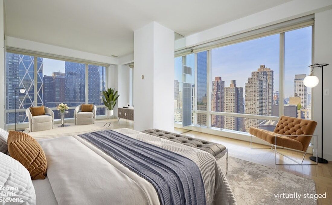 The home's grand 26-foot living room directly overlooks Central Park, providing a breathtaking natural panorama. The impressive, double primary bedroom spans 27 feet by 15 feet, featuring two full baths and four walk-in closets, including a full-size safe. The South rooms offer views over Columbus Circle, while the West rooms face the Hudson River, delivering stunning sunset vistas. Floor-to-ceiling windows throughout the apartment, with some ceiling heights reaching up to 11 feet, are perfect for natural light, with electric shades allowing for privacy with ease. A high-end sound system integrated into all rooms is included in the purchase.
