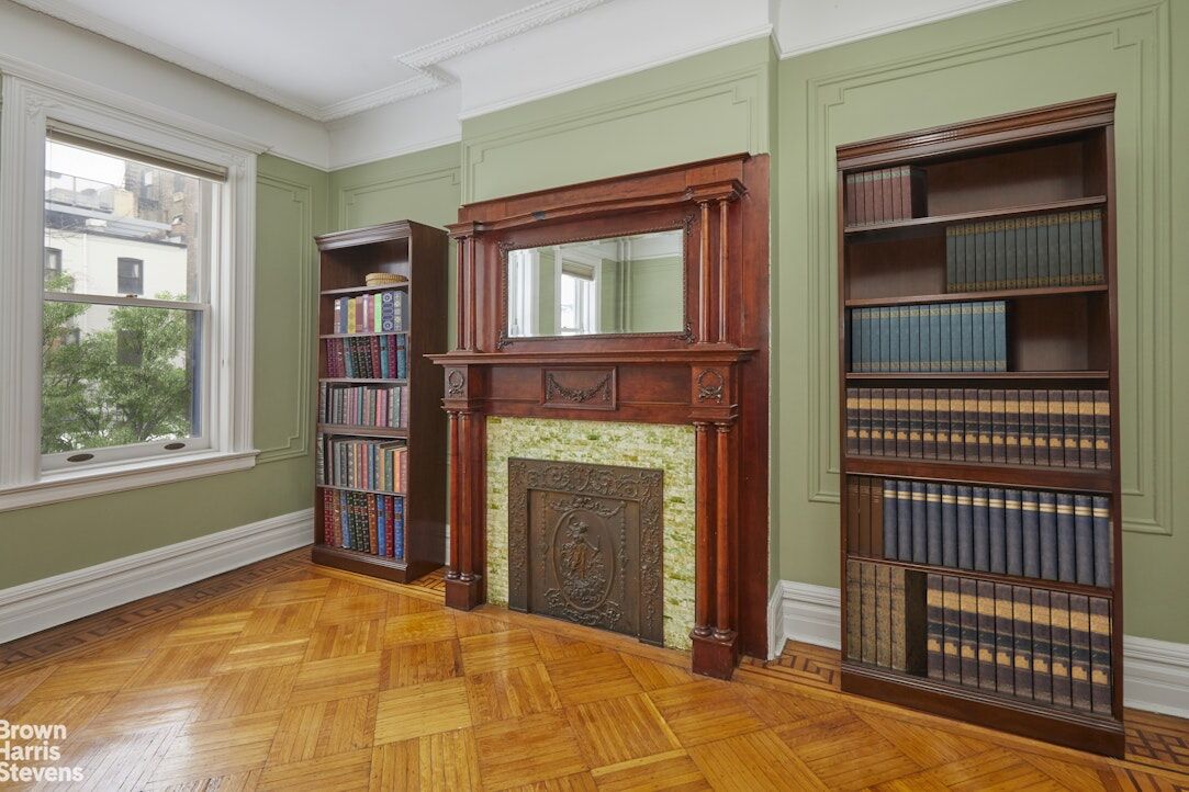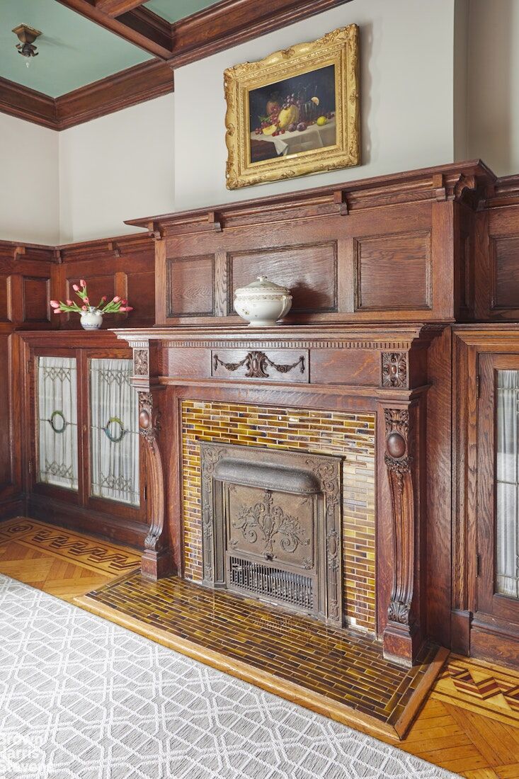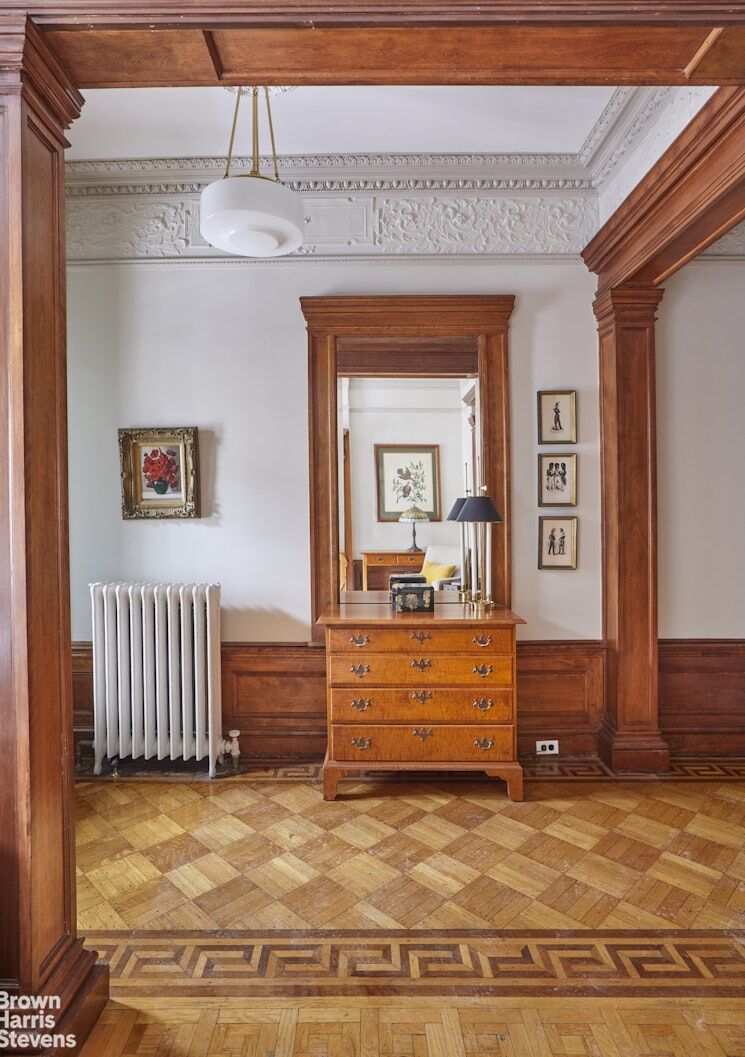 The parlor floor of the house includes a formal living room, anchored by a stunning decorative marble fireplace, features beautifully maintained plaster moldings and woodwork while the dining room includes the original built ins with stained glass doors, a coffered ceiling and decorative fireplace making it a perfect spot for quiet dinners at home or formal entertaining. The renovated kitchen features Sub Zero and Wolf appliances with an eat-in area and glass French doors leading to a garden patio ideal for summer entertaining.