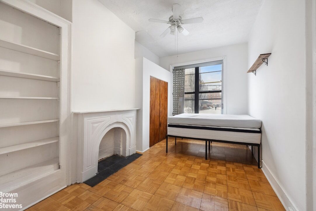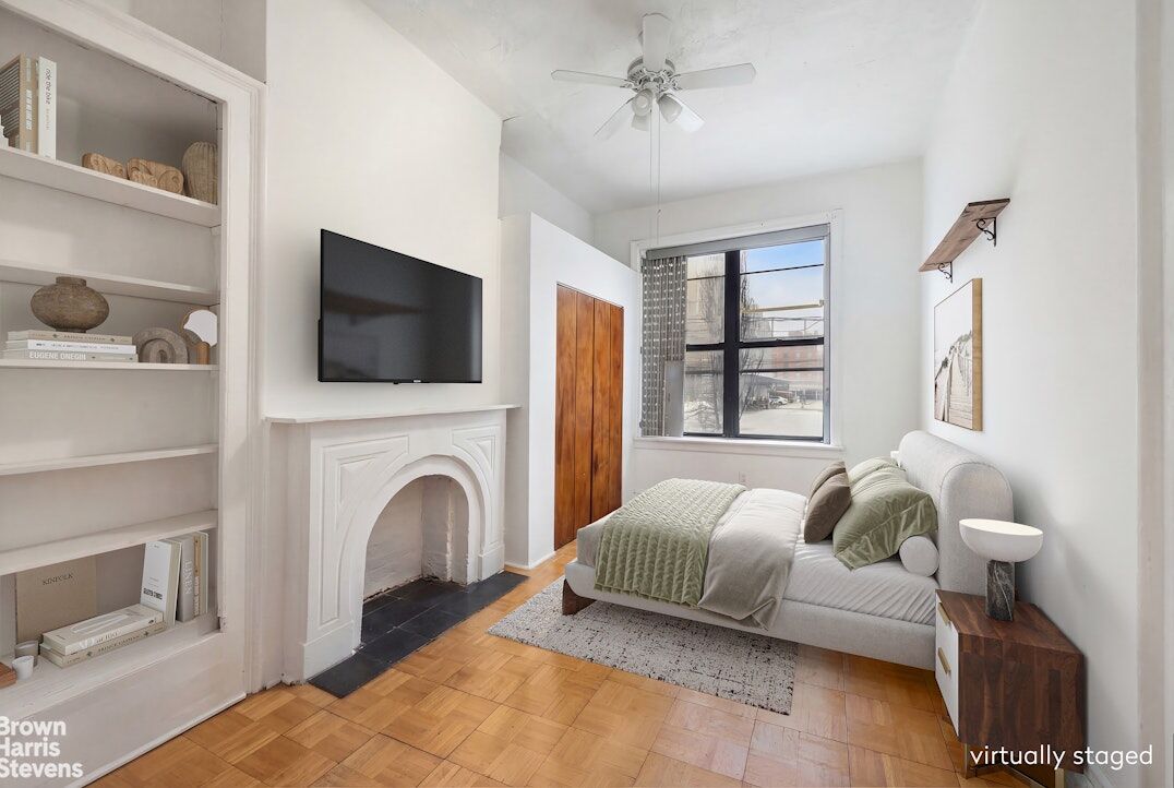 The large bedroom provides generous space and natural light, with a decorative fireplace, while a separate bonus room could be used as a home office or dressing room.