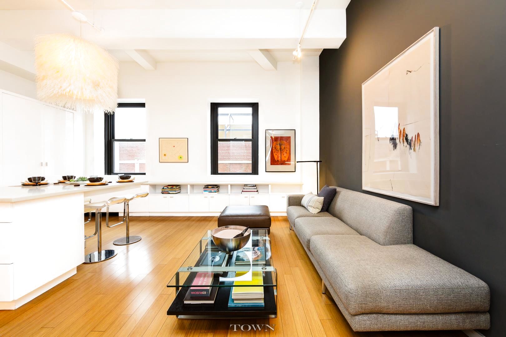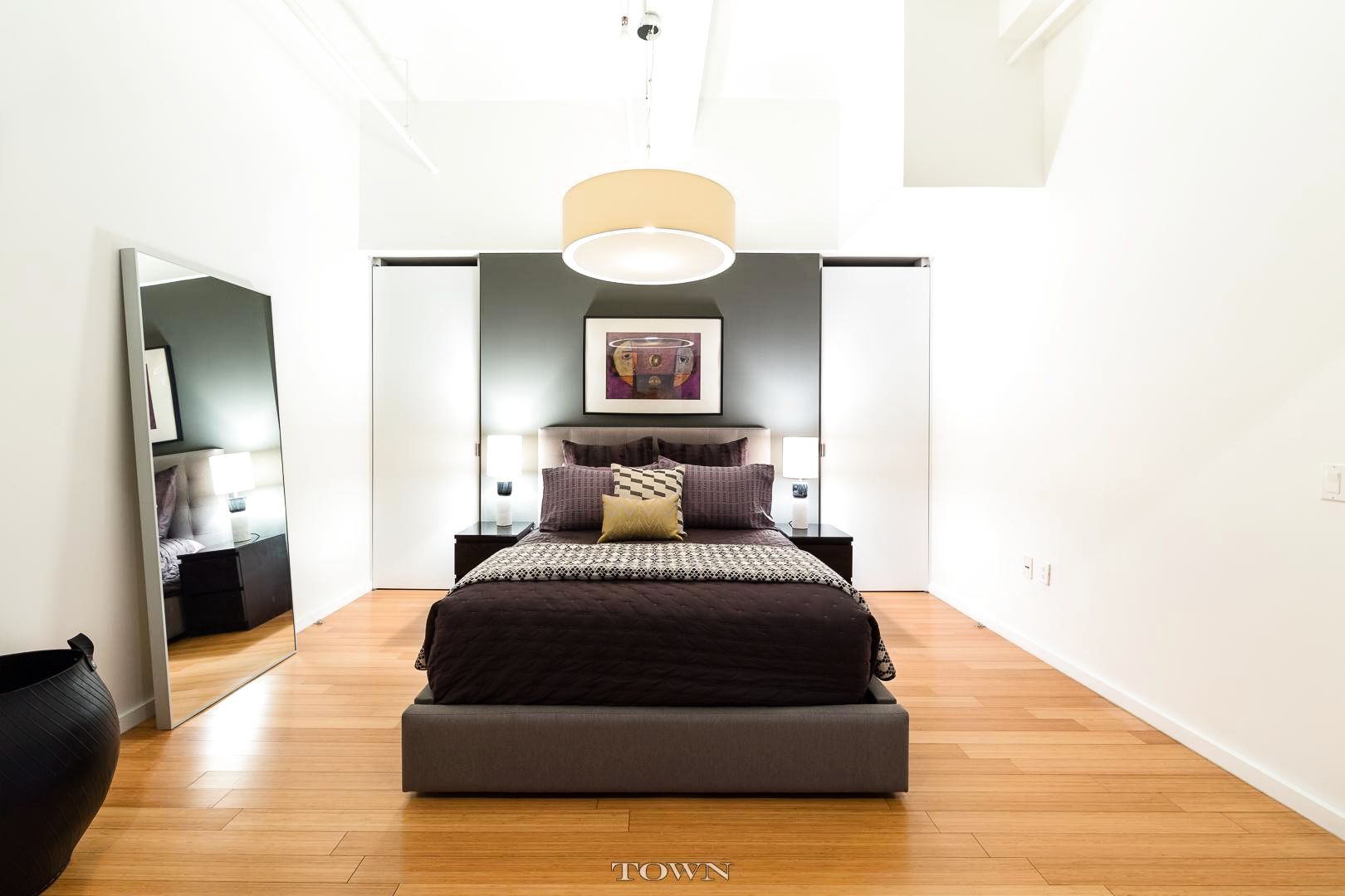 This gorgeous LOFT has 12-foot ceilings and was carefully and thoughtfully renovated to incorporate tons of storage space, a hidden entertainment system and sleek built-ins and shelving.