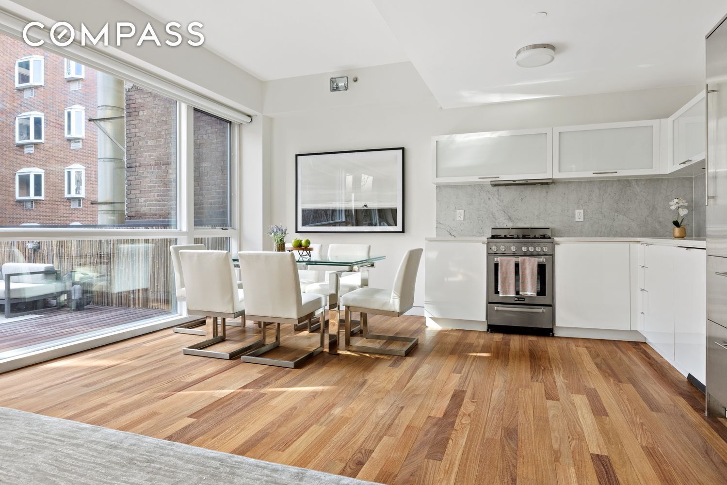 This expansive floorplan consists of the entire 2nd floor and offers desirable east and west exposures. Enter the apartment through a private elevator landing which includes an oversized closet. Through the foyer is a well appointed living and dining area which seamlessly opens up to the private outdoor terrace. The oversized terrace awaits for seamless entertaining and relaxation. Large floor to ceiling windows allows for abundant natural light throughout the entire apartment outfitted with hardwood floors. The chef's kitchen is equipped with stainless steel appliances, Carrara marble back splash, custom cabinetry, gas stovetop, and dishwasher perfect for entertaining.