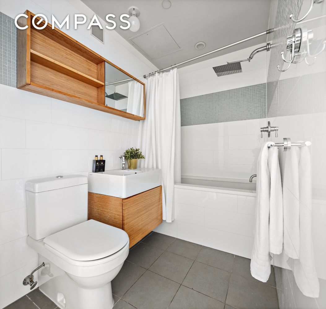 Through the hallway head to the tranquil owner’s suite to discover a well proportioned room which can comfortably fit a king-sized bed. An ensuite bathroom awaits with a large closet, soaking tub and stall shower. The secondary bedroom with spacious closet space offers access to a 2nd private balcony to enjoy spectacular sunset views of Manhattan. Central HVAC, washer/dryer, and electric shades, add effortless comfort and ease to this exceptional apartment. A large storage space is also included with the unit.