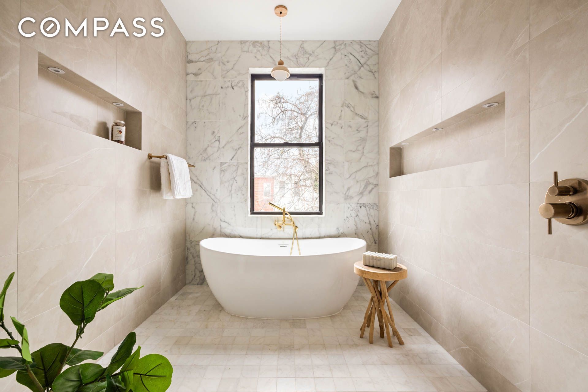 Introducing 599 Van Buren Street - a distinguished two-family townhouse with 6 bedrooms and 6 bathrooms, set along a picturesque, tree-lined stretch in the heart of Bushwick. Blending classic Brooklyn townhouse character with thoughtful contemporary design, this residence unfolds across more than 3,800 square feet of generous living space, soaring ceilings, and abundant natural light throughout. The parlor level welcomes you with grand proportions and beautifully preserved details, including a wood-burning fireplace. Tall windows frame the block’s leafy charm, while rich hardwood floors and refined millwork create an atmosphere that feels both elegant and inviting. The main living and dining areas flow seamlessly together, ideal for both intimate evenings at home and larger-scale entertaining. Toward the rear, a well-appointed kitchen serves as the heart of the home — designed with custom cabinetry, premium Bosch and Fisher & Paykel appliances, and ample counter space for everyday living. Large glass doors open to a private deck and landscaped garden below, extending the living space outdoors and offering a tranquil retreat for dining, lounging, or gardening. On the second floor, sun-filled bedrooms provide comfort and privacy, with well-proportioned layouts and ample storage. The primary bedroom suite offers a serene escape with a large walk-in custom closet, two arched built-ins with drawers, complemented by a thoughtfully finished en-suite bathroom that balances timeless materials with modern fixtures like a soaking tub and double showerheads. The third floor offers another bedroom with a full bathroom, a fun playroom, and a kitchenette, leading up to the rooftop for additional outdoor space and exciting views of Brooklyn. The two-bedroom, one-bathroom, garden-level offers additional flexibility, whether envisioned as a potential income-producing rental unit, guest quarters, or home office. A finished basement with a half bathroom provides even more versatility for media, fitness, or storage needs. Situated moments from neighborhood favorites, such as Ornithology and Santa Panza, and convenient transportation, 599 Van Buren Street represents an opportunity to own a turnkey townhouse that honors Brooklyn’s architectural heritage while embracing the ease of contemporary living.