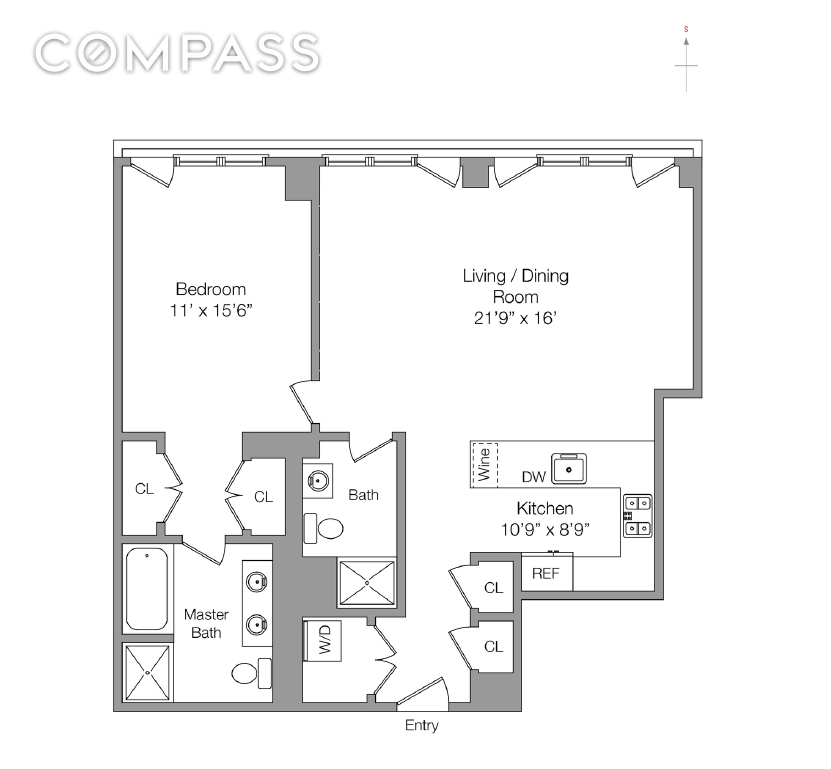 Totaling 992 square feet of highly usable space, 5B feels like a loft but offers the luxury and functionality of new construction. Enter the home through an intimate foyer with two coat closets and a stacked washer and vented dryer. Beyond the entryway is a massive, open U-shaped kitchen with Poggenpohl cabinetry, a professional-grade Viking appliance package, and a 24-bottle wine refrigerator. The breakfast bar seats up to six and flows into a 22-foot-wide living and dining room with stunning floor-to-ceiling glass casement windows, approximately 9.5-foot ceilings, and the option to carve out a small second bedroom, guest room, or nursery. There is also a beautifully appointed full bathroom with a walk-in shower off the living room.