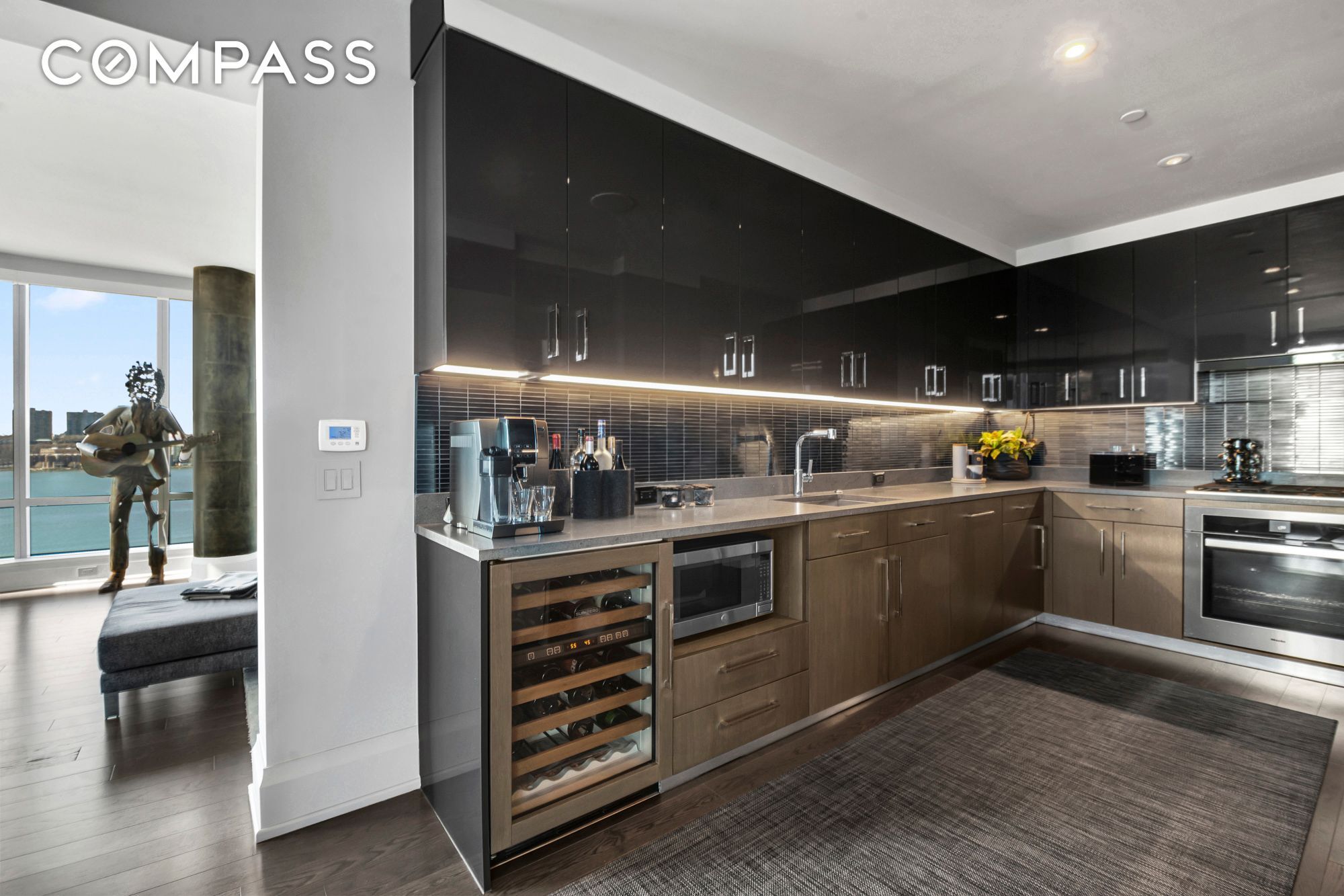 A gracious foyer welcomes you into an expansive living and dining area framed by floor-to-ceiling windows, flooding the space with natural light and showcasing stunning river vistas. Wide-plank oak flooring with a custom dark stain runs throughout, complementing the home’s sophisticated design.