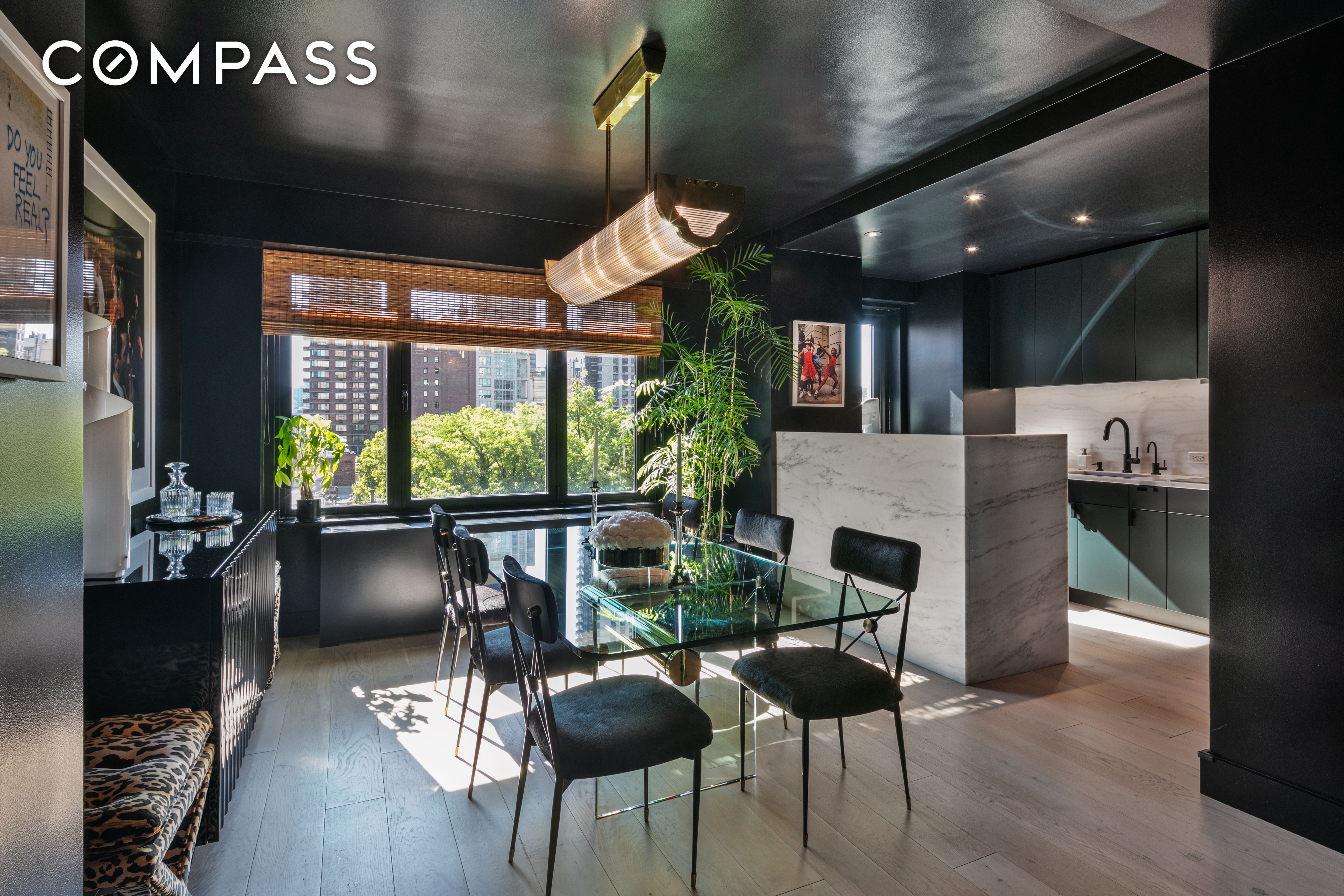 Perfect for entertaining, the large dining room is flanked by the open kitchen with Imperial Danby marble, with a raised marble slab to hide the kitchen work surfaces, custom black lacquer cabinetry and hardware, Miele appliances, and a wine cooler. On the other side is the bar with custom bronze doors and a Nero Marquina marble countertop.