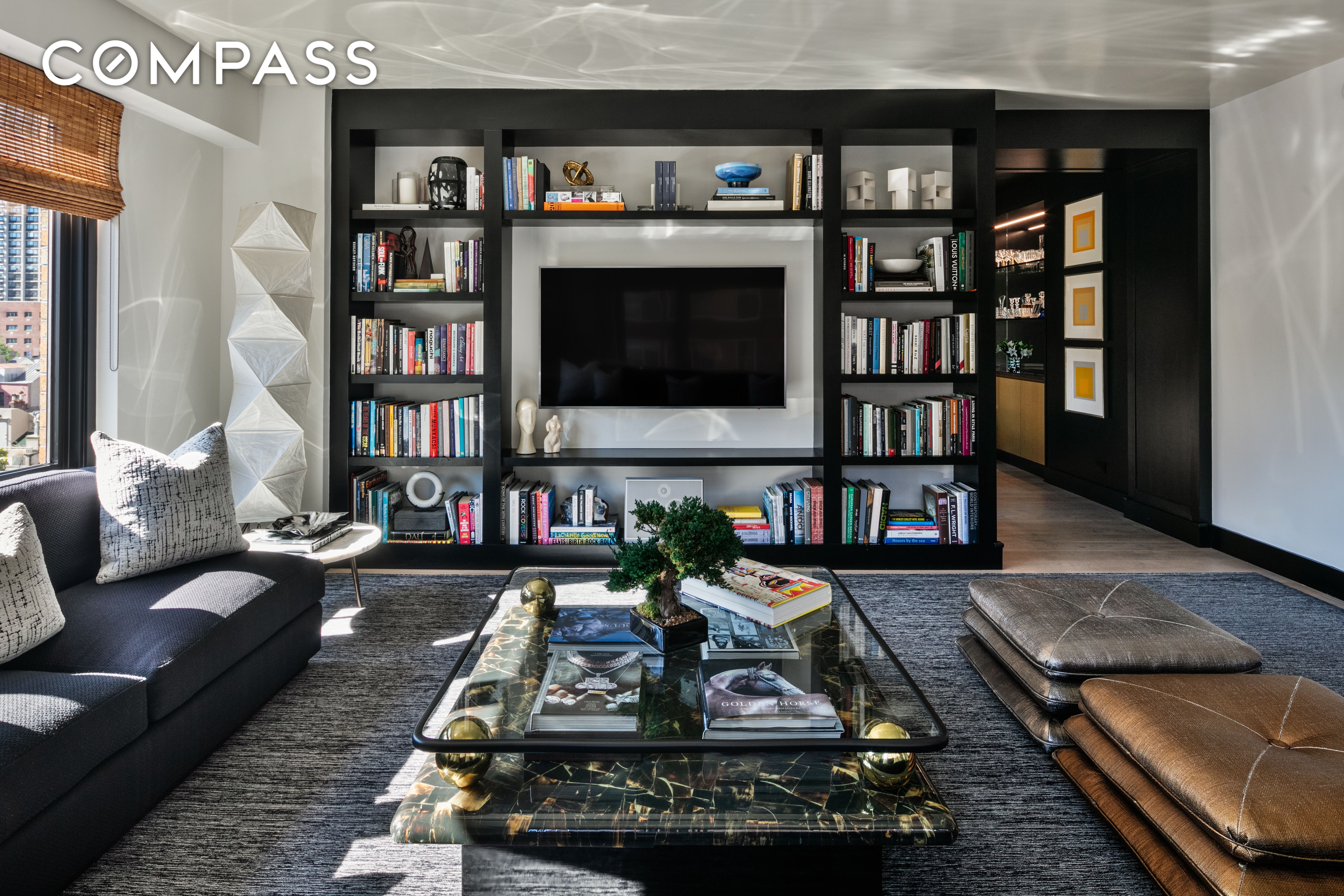 The expansive corner living room, includes two large scale windows, and a built in floor-to-ceiling millwork bookcase.