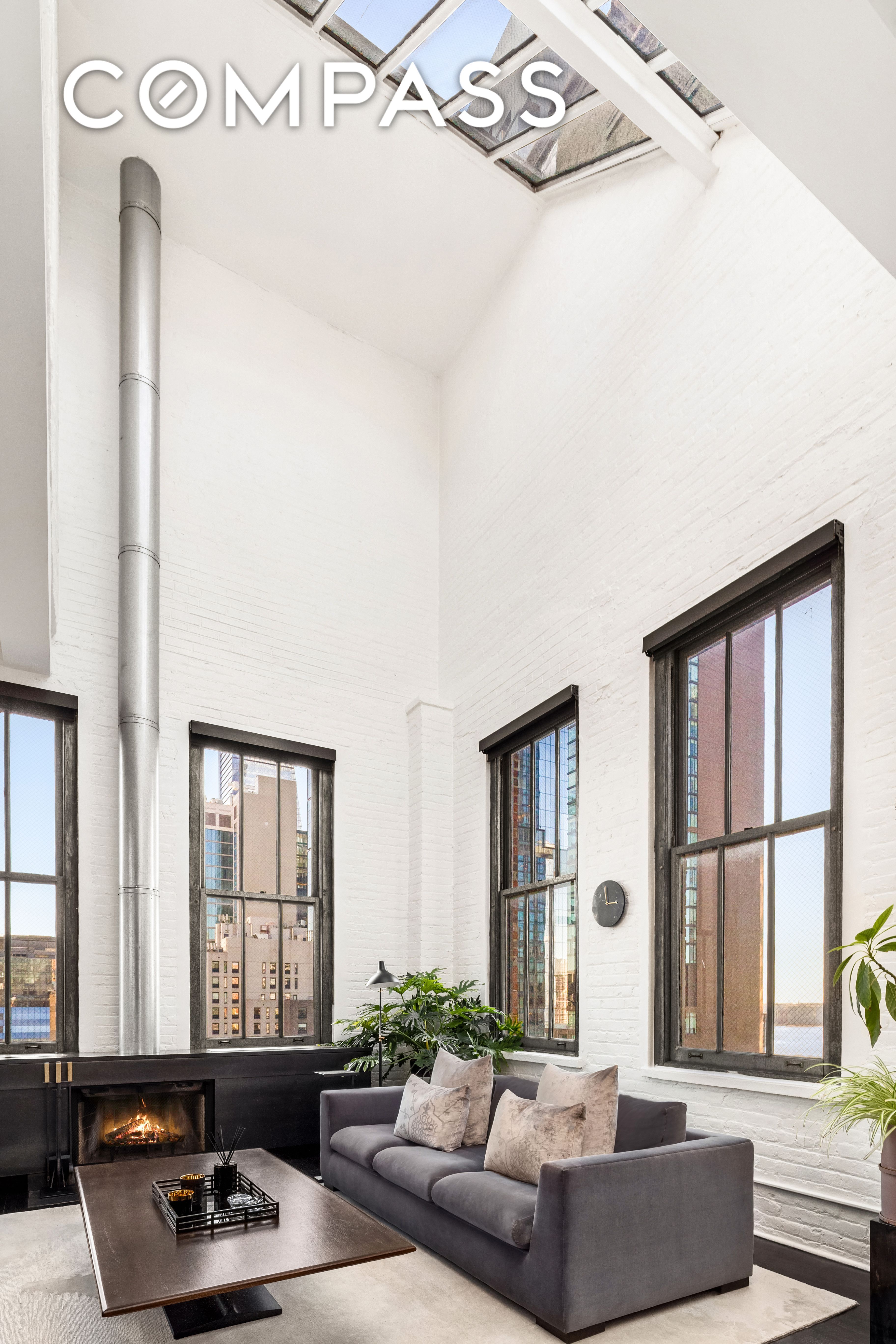 Spanning approximately 2,600 square feet, this architecturally distinctive condo offers sweeping views from the Empire State Building and the New Yorker sign to the Hudson River. The expansive living and entertaining space is defined by soaring 14+ foot ceilings, oversized picture windows, skylights, and a wood-burning fireplace—creating a dramatic yet inviting setting.