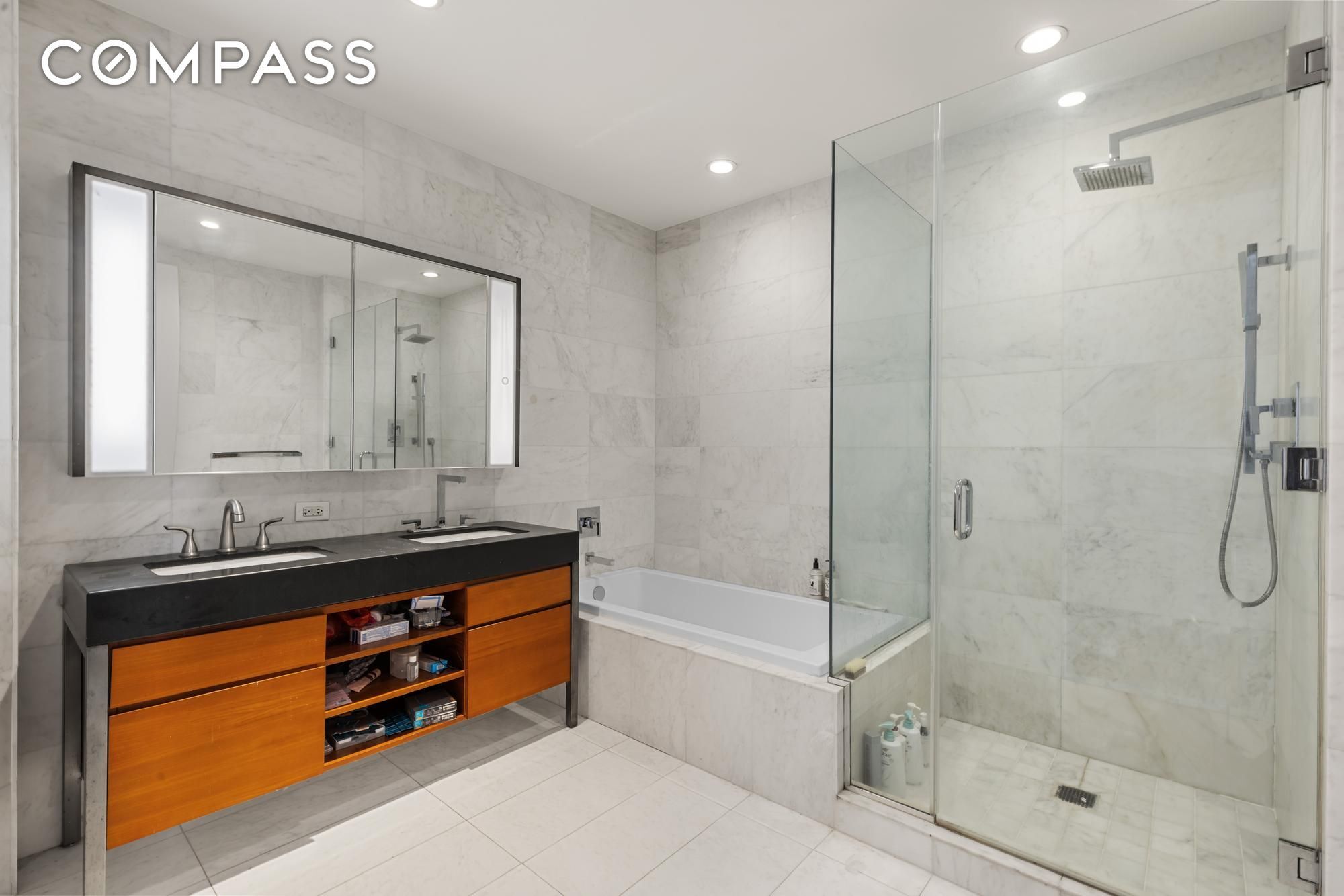 The primary suite is a true retreat, offering a massive walk-in closet and a spa-like ensuite bathroom. Designed with solid wood cabinets, honed black dynasty countertops, and honed empress white marble walls and floors, the bathroom includes dual vanity sinks, a deep soaking tub, and a separate glass-encased standing shower with a rainfall showerhead. The spacious second bedroom is complemented by a guest bathroom featuring matching high-end finishes and its own rainfall shower.