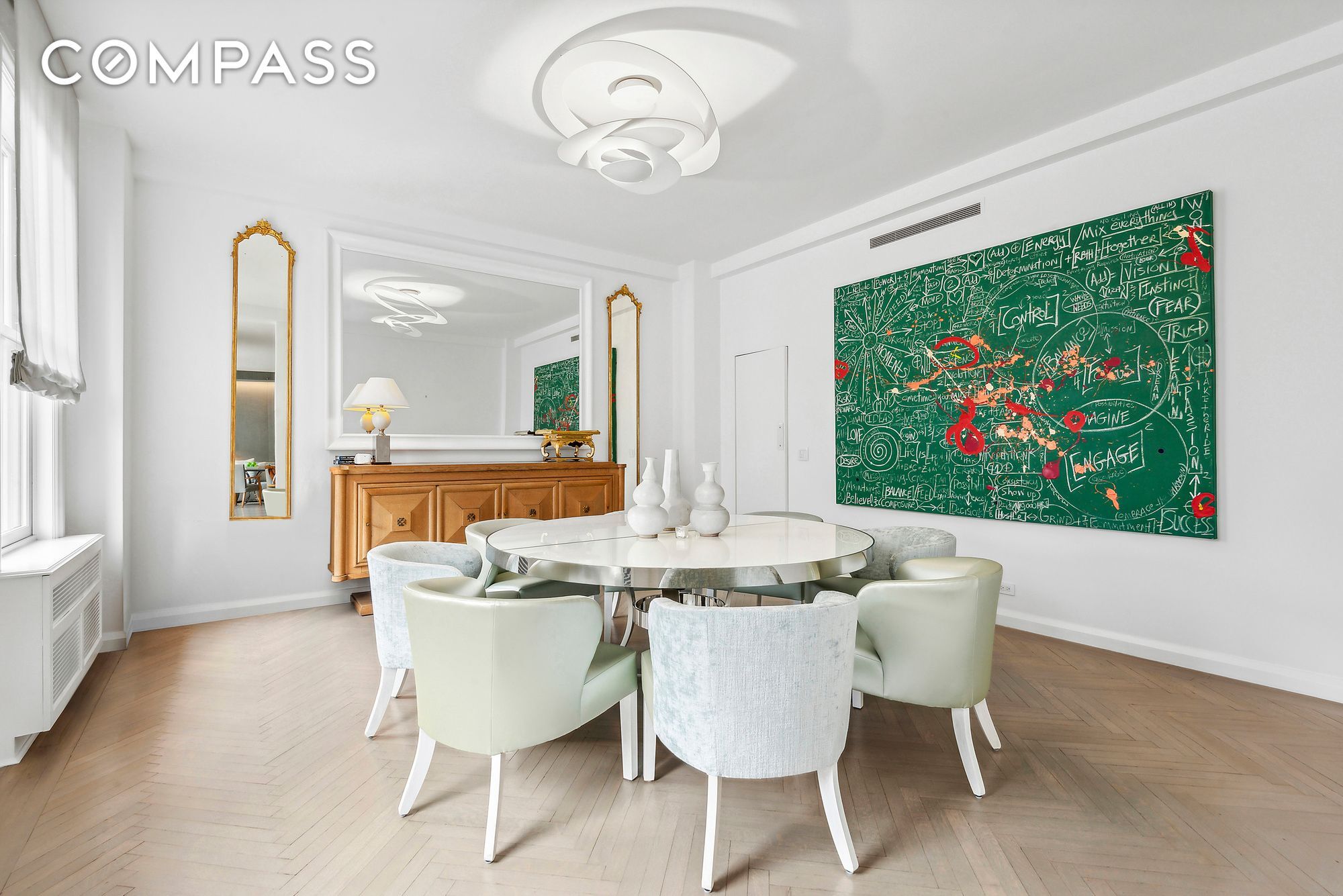 The breathtaking living room with 10’ ceilings and oversized windows flows naturally into a dining room that is made for entertaining. The open and windowed chef’s kitchen is outfitted with all top-of-the-line appliances including dual Miele dishwashers and a Viking range.
