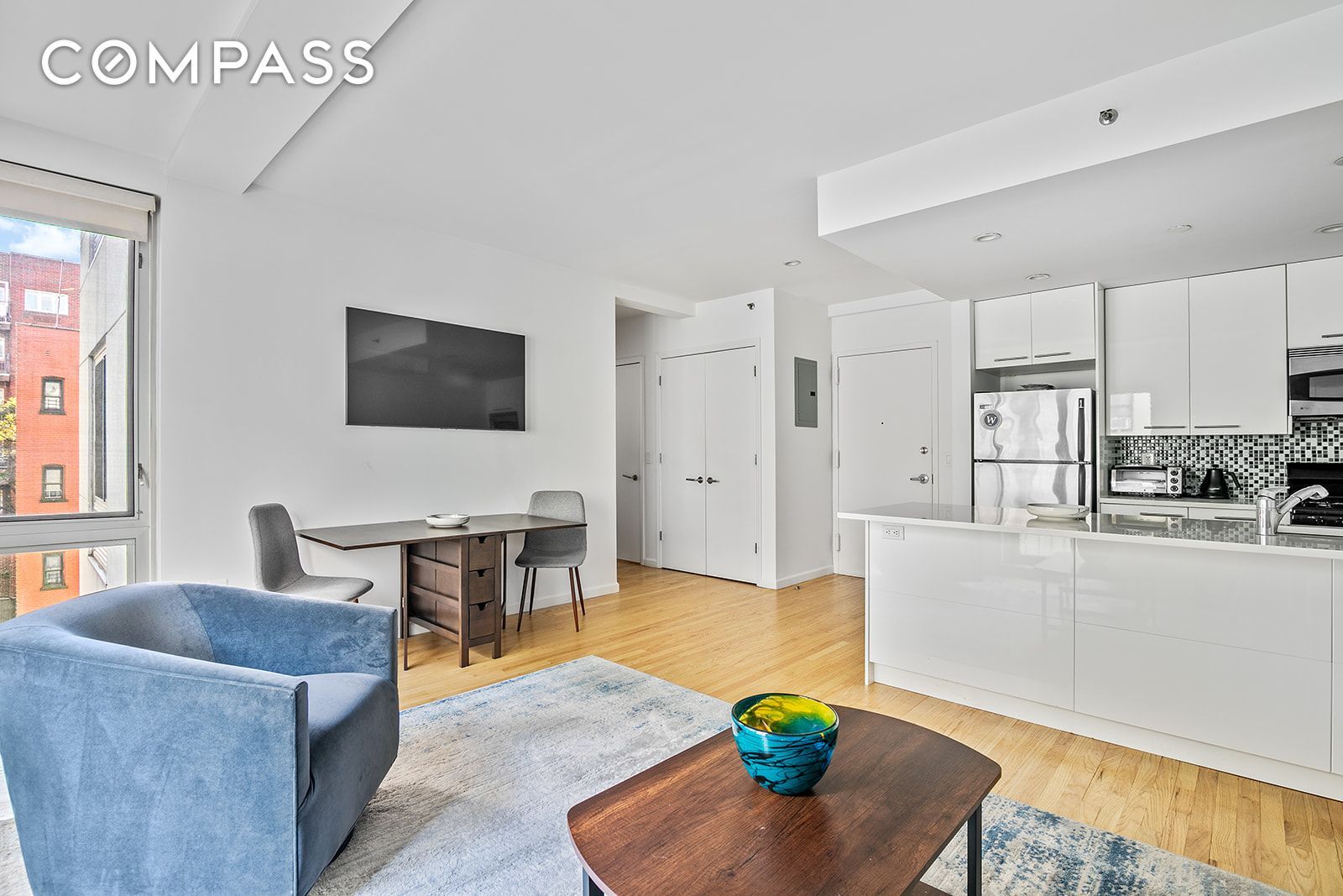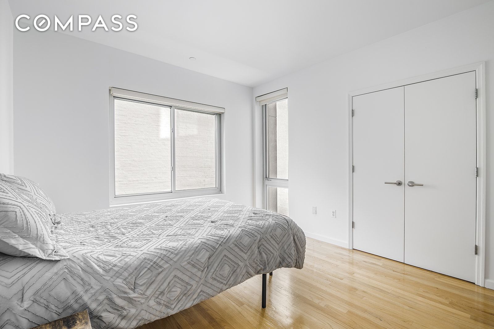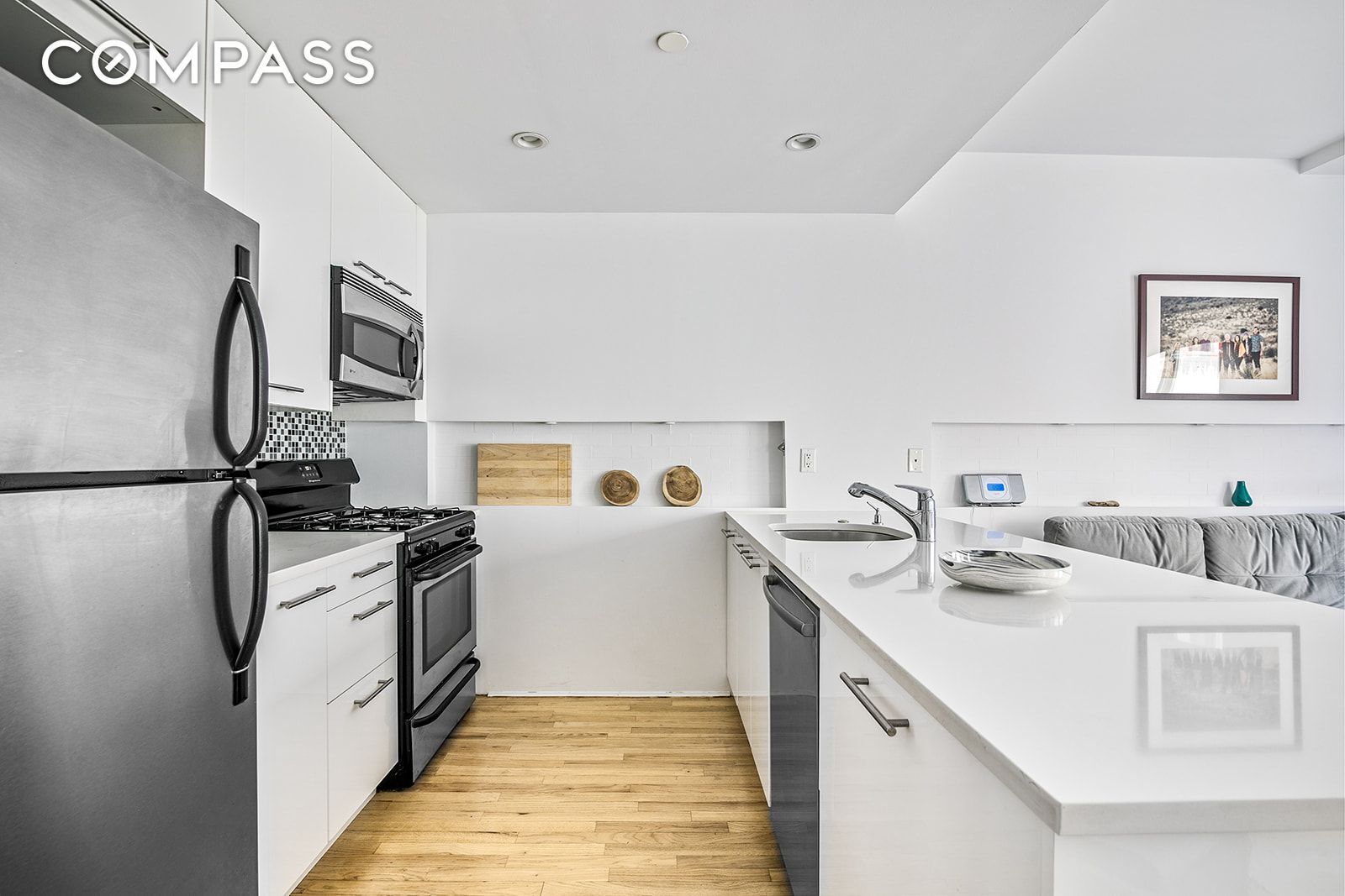 Welcome to this stunning 1-bedroom, 1-bathroom condo with PRIVATE PARKING INCLUDED located at 34 Crooke Ave in the heart of Prospect Park South and located just a stones throw from Prospect Park. This 650 square foot residence offers a sophisticated urban lifestyle in a low-rise building with modern amenities. Upon entering, you are greeted by a bright and airy living space featuring oversized windows that flood the home with natural light. The open layout seamlessly flows into the kitchen, complete with a breakfast bar for casual dining. Step outside onto your own private Juliet balcony. The bedroom boasts ample closet space and easy access to the chic full bathroom. This unit also includes a washer/dryer for added convenience. Residents of this building enjoy access to a common roof deck, perfect for entertaining and enjoying panoramic city views. Additional amenities include a gym, health club, and resident's lounge. For security and peace of mind, the building offers a video intercom system. With central AC and heating, an attached garage and private storage, this condo offers the ultimate in comfort and convenience. Plus, with an elevator for easy access, this home seamlessly combines luxury and practicality. Don't miss the opportunity to make this stylish condo your own and experience the best of Brooklyn living. Schedule a showing today and envision yourself in this modern urban retreat.