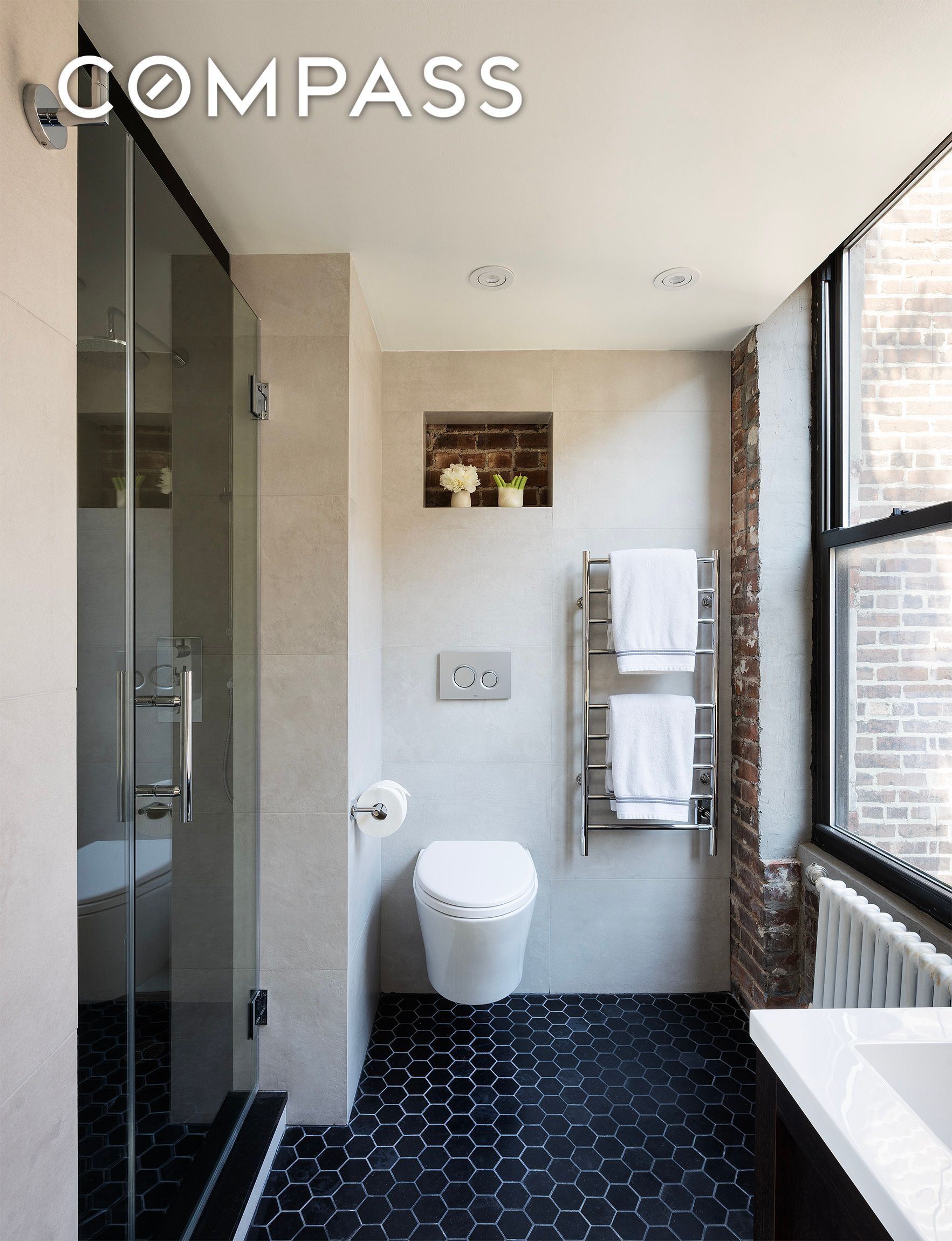 The newly gut-renovated spa-like bathroom is clad in porcelain stone with black marble flooring, and features a glass-enclosed shower, Toto toilet, radiant heated floors, a heated towel rack, and Signature Hardware fixtures.