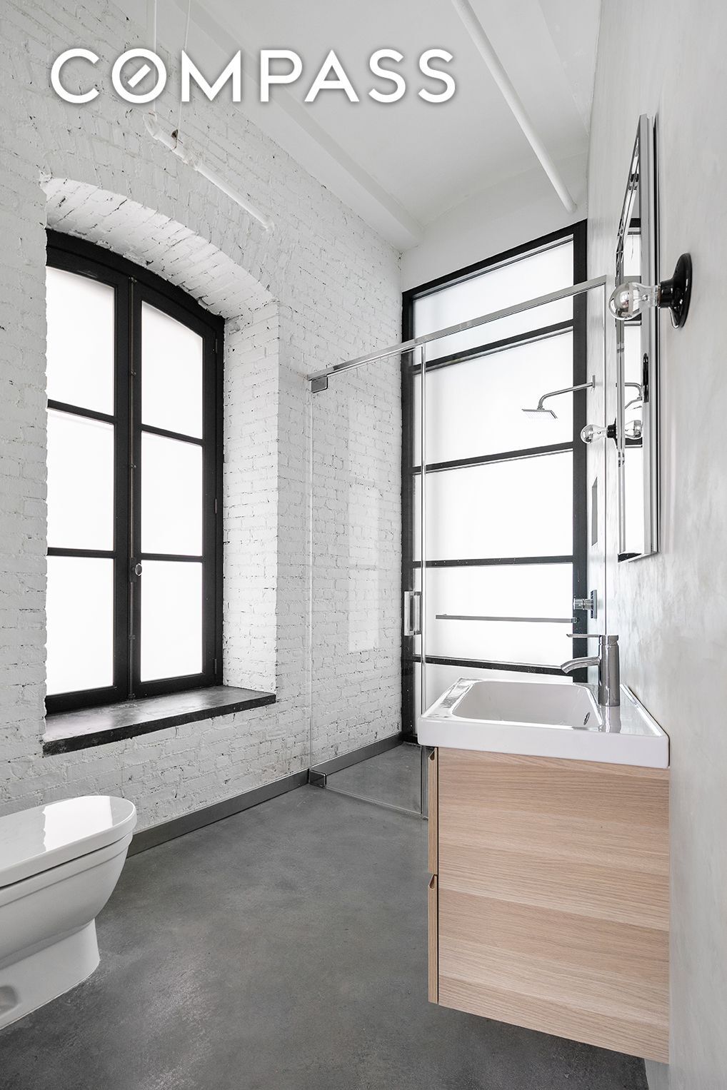 Enter the home through an extended foyer hallway and immediately note polished pre-war details including walls of exposed brick and oversized arched windows. Ample storage and coat closets define this entry hallway and an oversized window allows the space access to natural light. The entry hall leads to an expansive open living and dining room, featuring space for multiple sitting areas plus a spacious dining area. The industrial-style kitchen is clad in stainless steel and complete with high-end appliances, including a Miele Induction stove, Miele dishwasher, Sub-Zero refrigerator and separate Dacor Double Wall oven. This grand space is encompassed by 6 oversized windows set behind lovely arched sills.