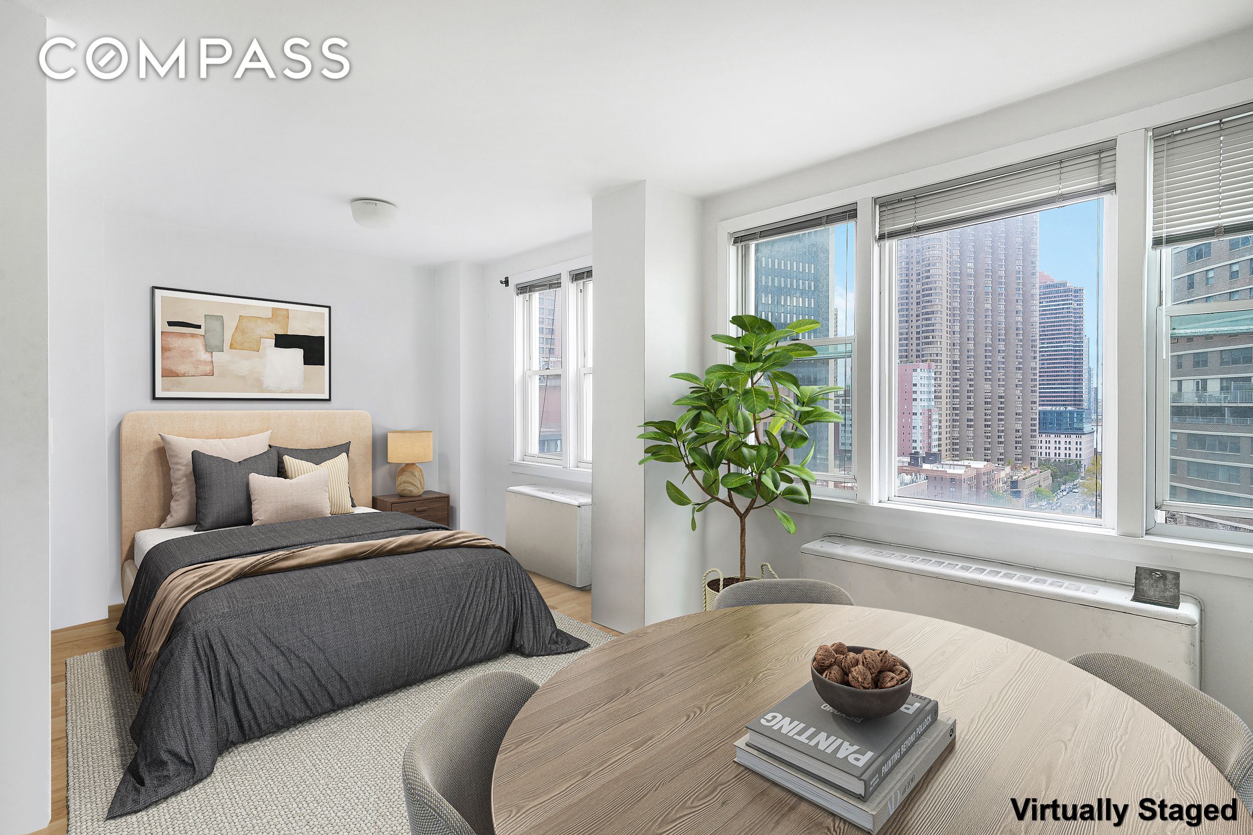 Move right into this mint-condition Murray Hill alcove studio with a doorman and open city views. This spacious furnished apartment has been renovated with high-end finishes throughout. The kitchen features beautiful cabinetry, countertops, and appliances, including a dishwasher and built-in microwave; the bathroom showcases luxurious fixtures as well as sleek wall and floor tiling, and there are lovely new hardwood floors. The windowed sleeping alcove easily and completely fits a queen-sized bed and nightstand. New blinds on each window allow you to shade the bright eastern light streaming into this high-floor apartment. The generous living room has separate lounging and dining areas, and three large closets offer plenty of storage space. Central laundry and bicycle storage in the basement.