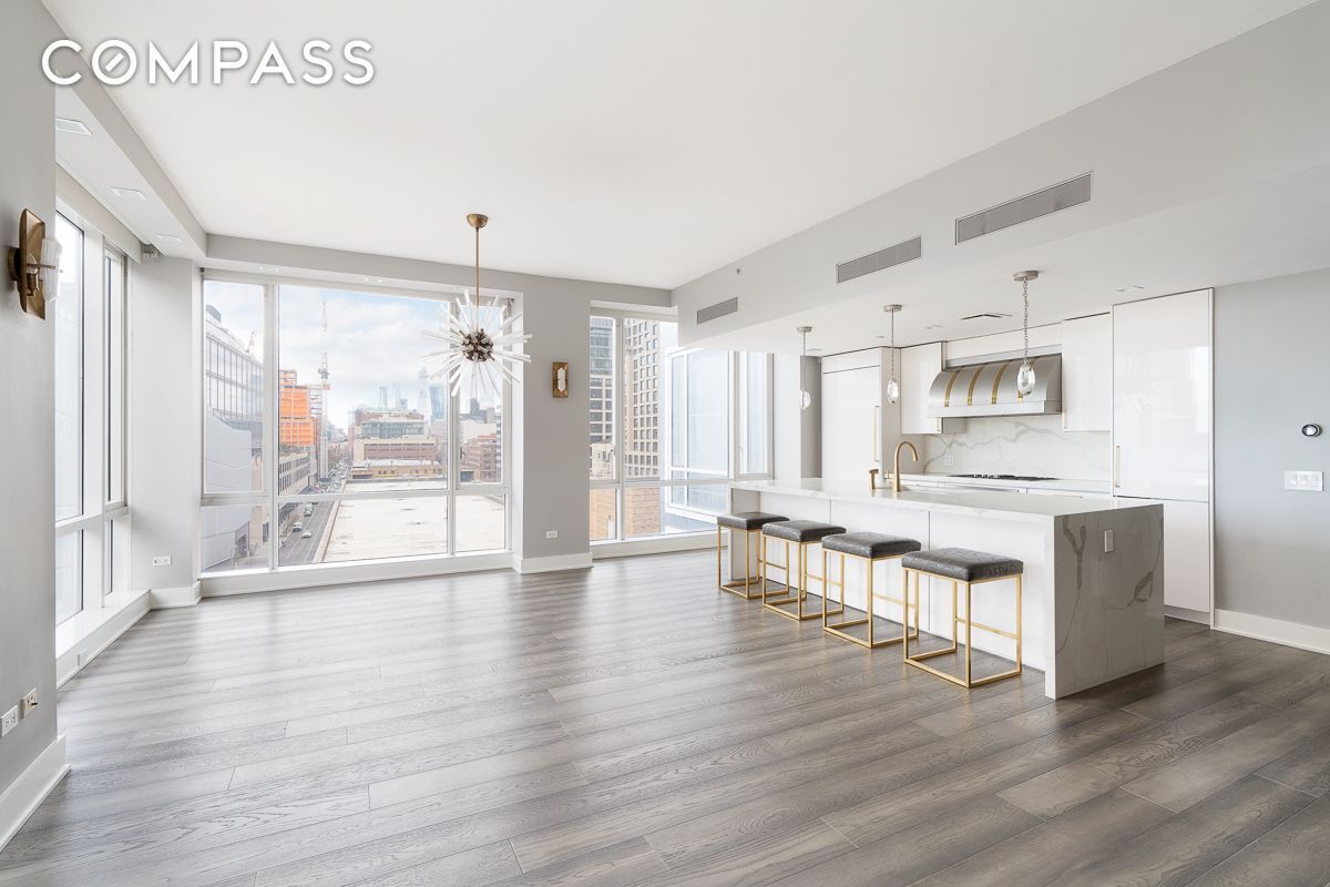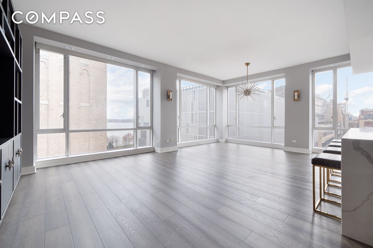 This beautifully designed loft-like home with Hudson River views is the ideal three bedroom, three and one half bath apartment in one of downtown’s best full service buildings. The apartment has been fully renovated top to bottom and spans 2,037 sq feet with ten foot ceilings, floor to ceiling walls of glass, two zone central heat and air, motorized solar shades throughout, custom-designed closets, Oak floors throughout and a split layout with large primary suite on the North end, second and third bedrooms on the South end.