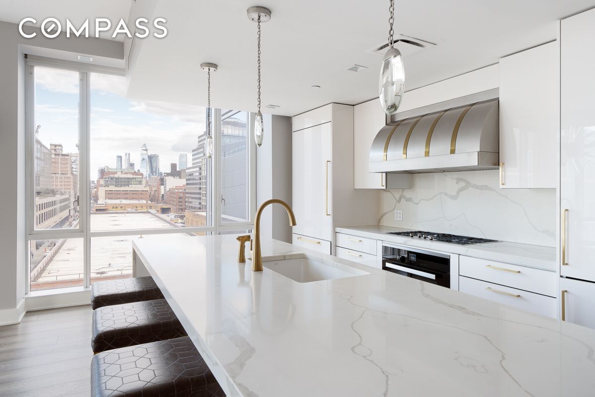 The large, open kitchen with white lacquer cabinets features all Miele appliances that include 36” refrigerator, gas range cooktop and oven, dishwasher and beautifully designed custom brass and stainless range hood. You can watch the ships go by while cooking or entertaining in this gorgeous kitchen!