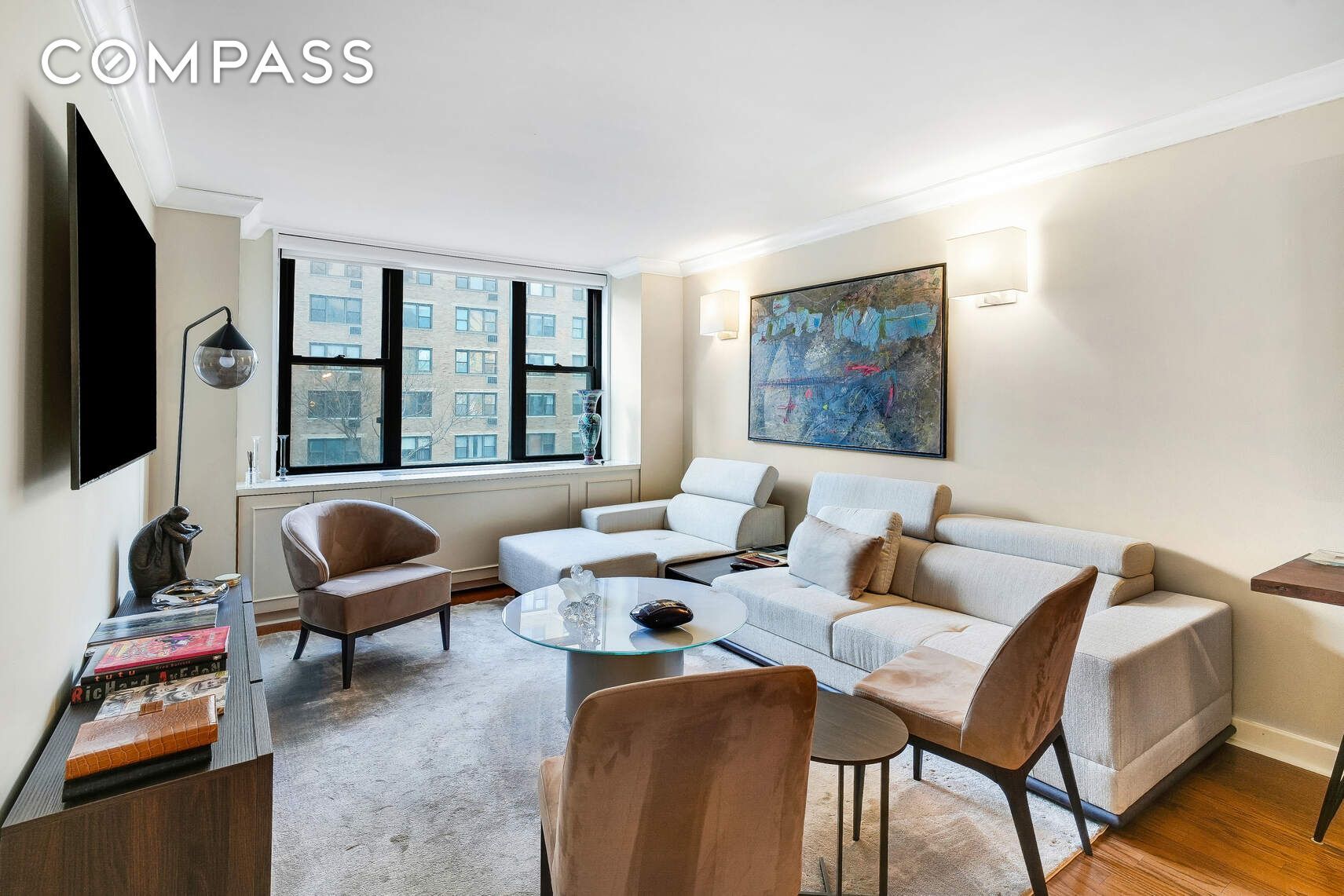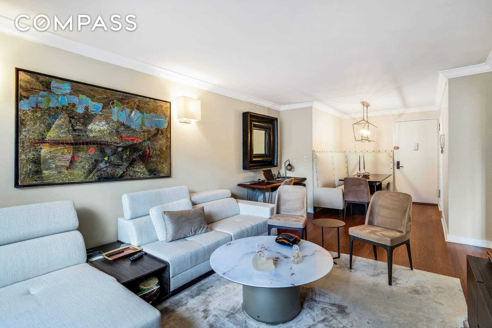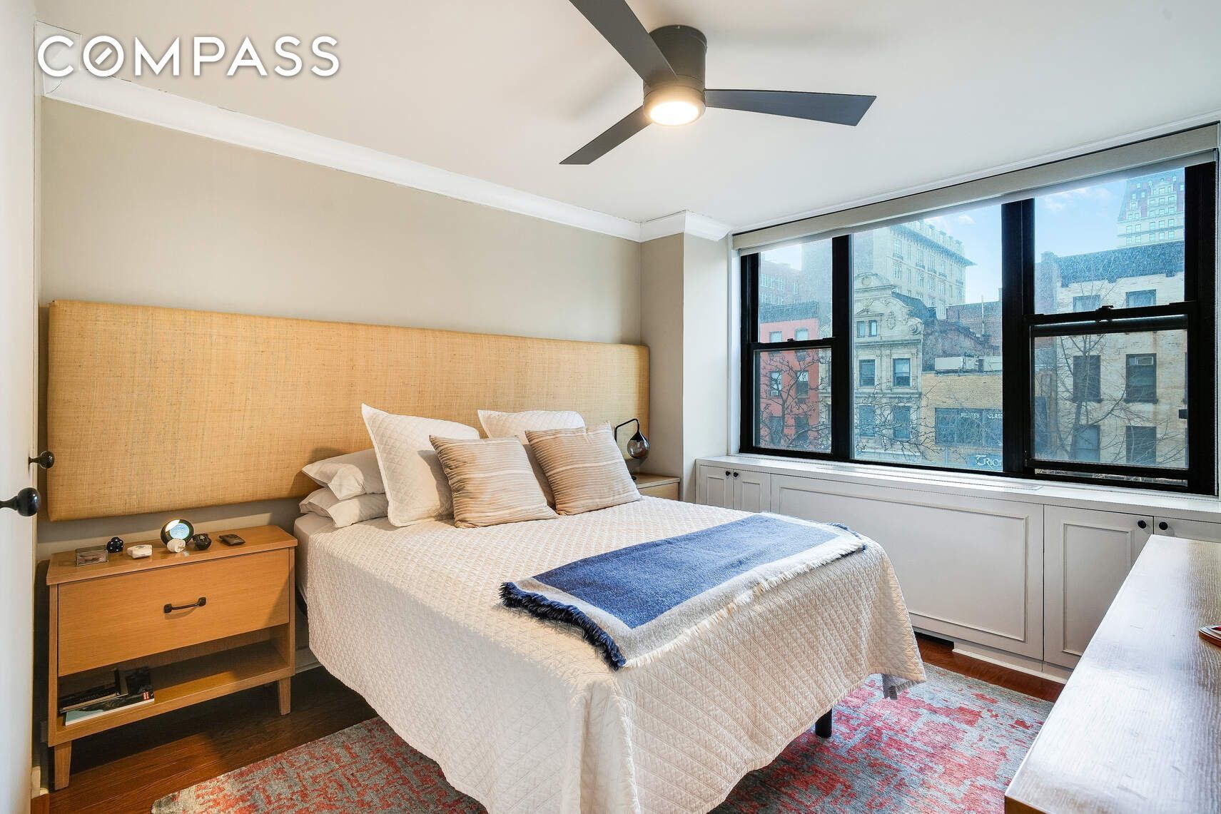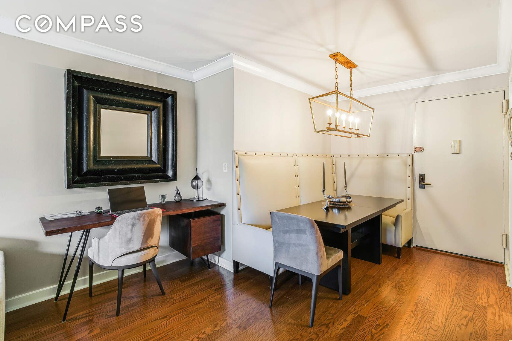 Terrific one bedroom opportunity at the very popular Park Towers in Gramercy Park! Perfect for a primary residence or pied-a-terre. A large living room offers ample space for living plus dedicated area for dining, and a separate office nook is a super convenient WFH option. The kitchen features stainless steel appliances, granite countertops and wood cabinetry. The bedroom easily accommodates a queen size bed and dresser and the renovated bath shines with classic white subway tile throughout and expansive, mirrored medicine cabinet. You’ll find plenty of storage with three large closets, all outfitted and ready for use. Central A/C, new floors and new windows throughout, offering lovely western light and views of sky overhead. Smart under-window cabinetry conceals central A/C and offers additional storage in both the living room and bedroom.