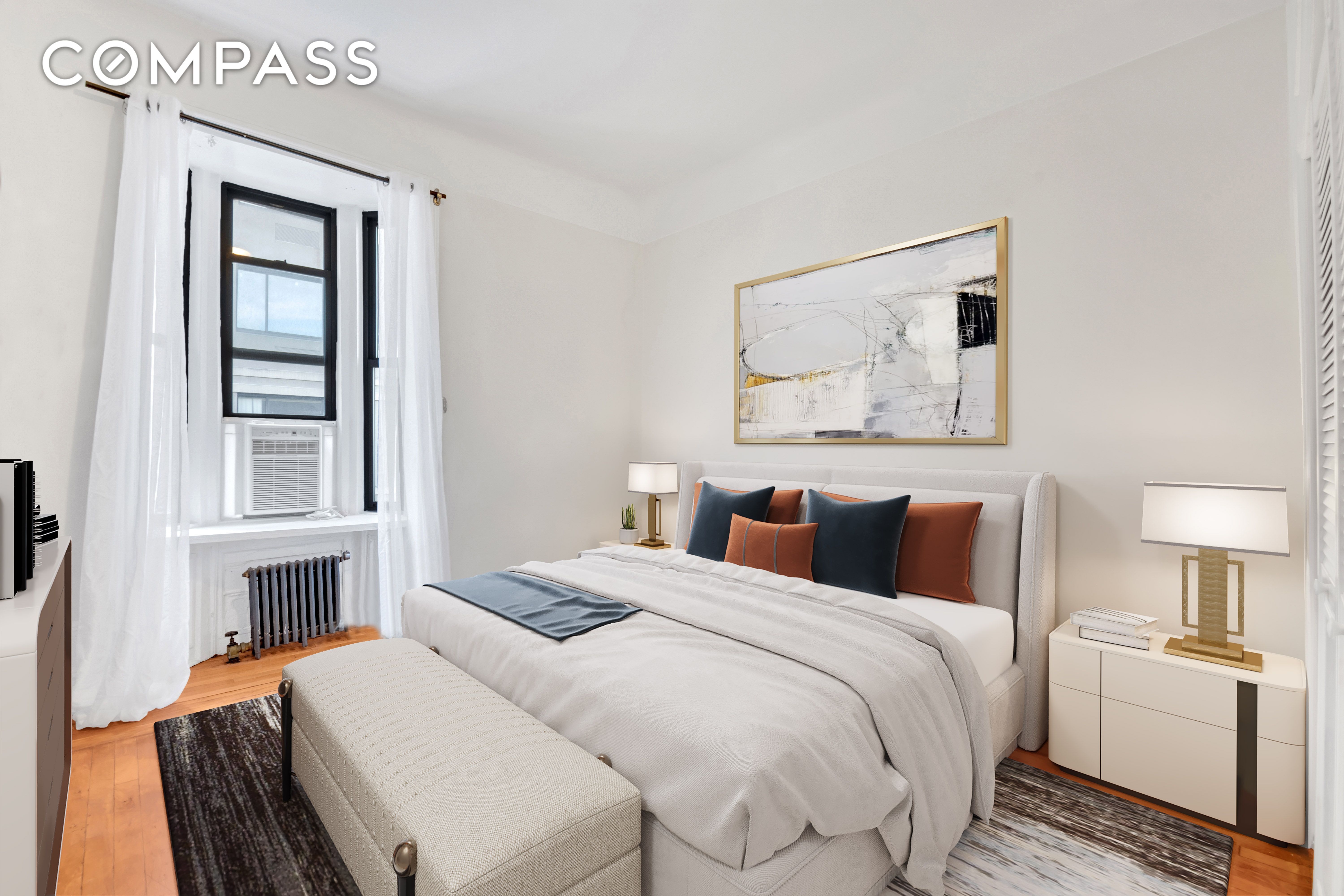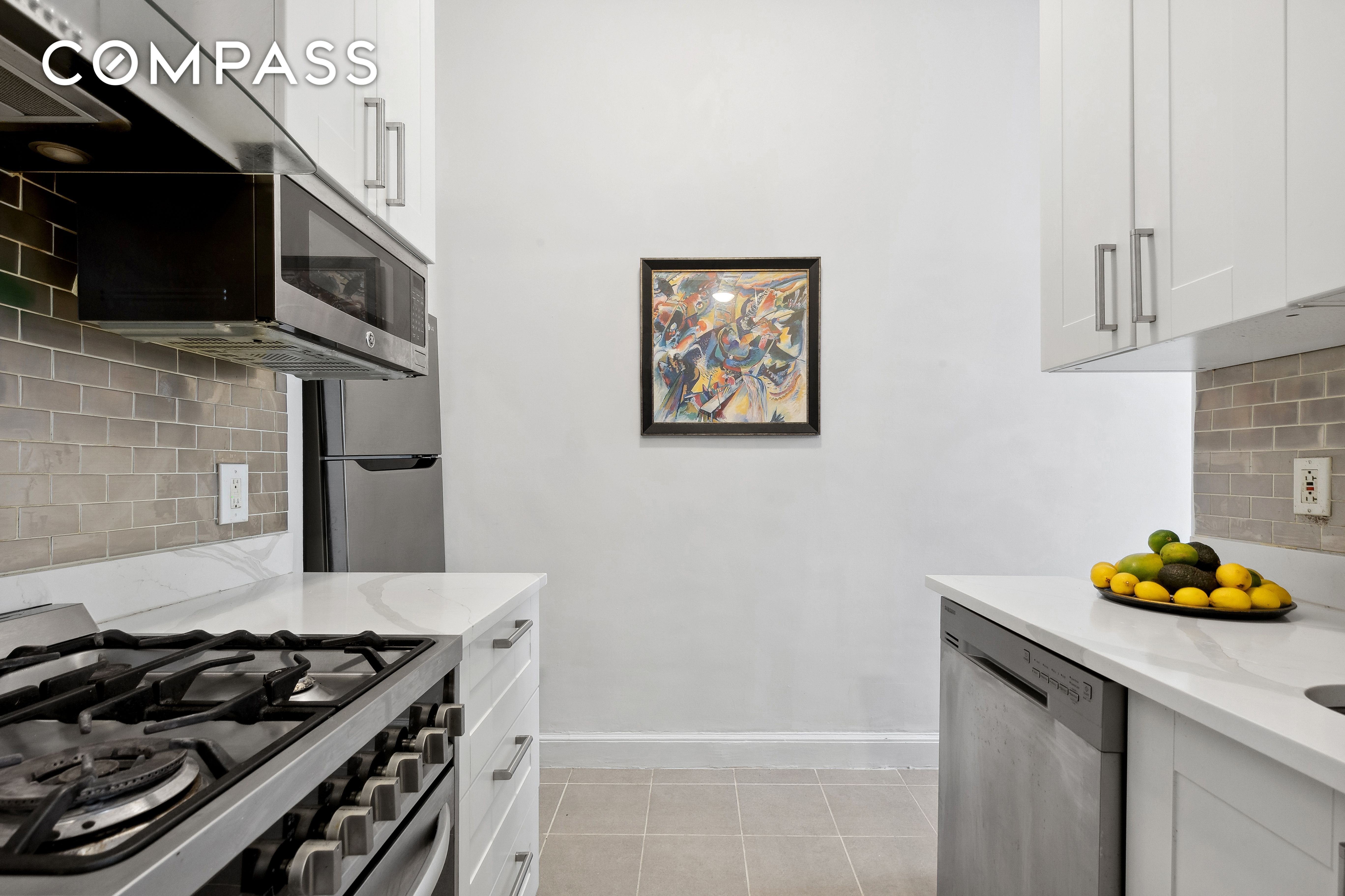 The gut-renovated kitchen has white cabinetry, quartz counters, stainless-steel backsplash & appliances (incl. d/w). The king-size bedroom offers a floor-to-ceiling double closet, and the windowed bath blends classic subway tile with modern style.