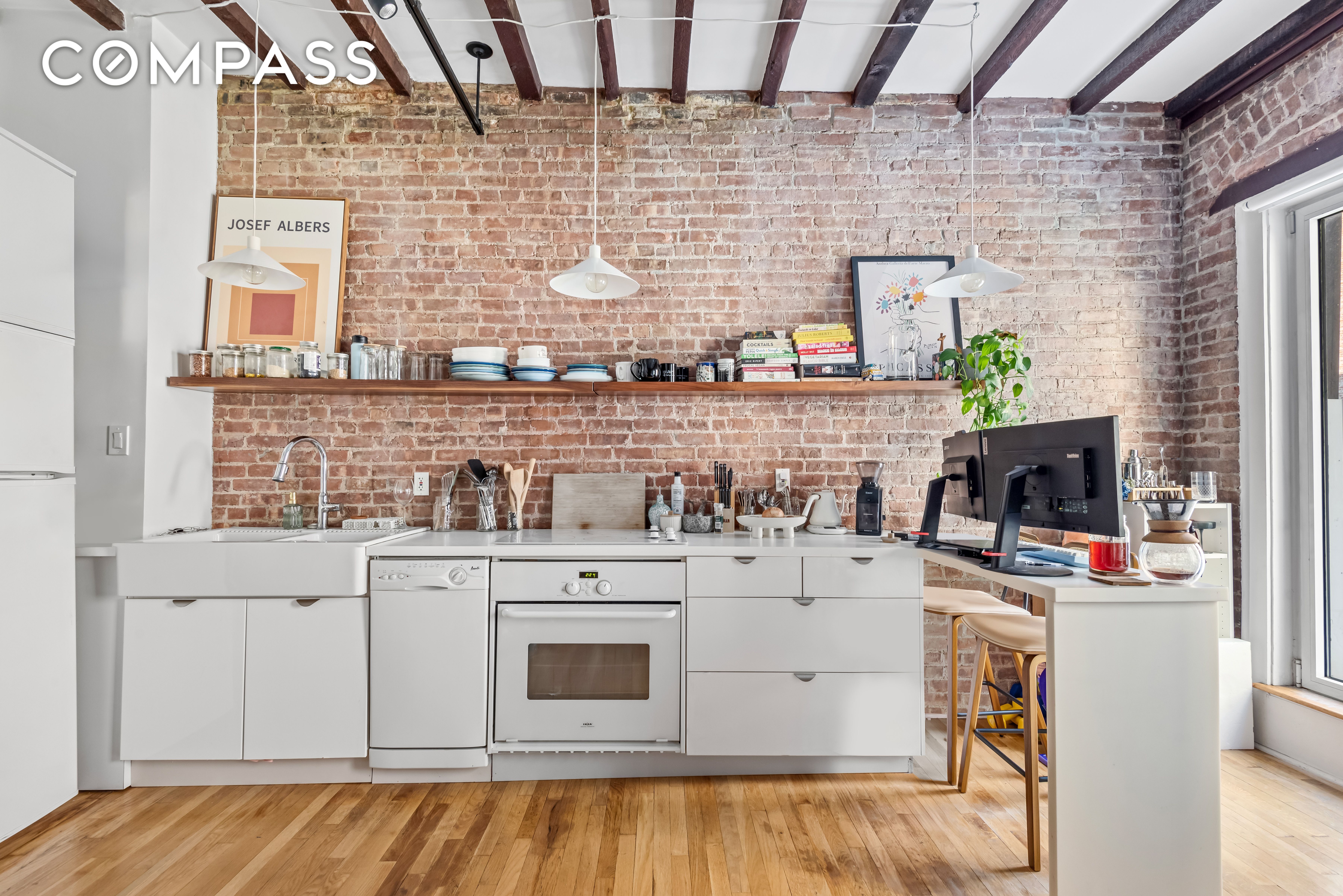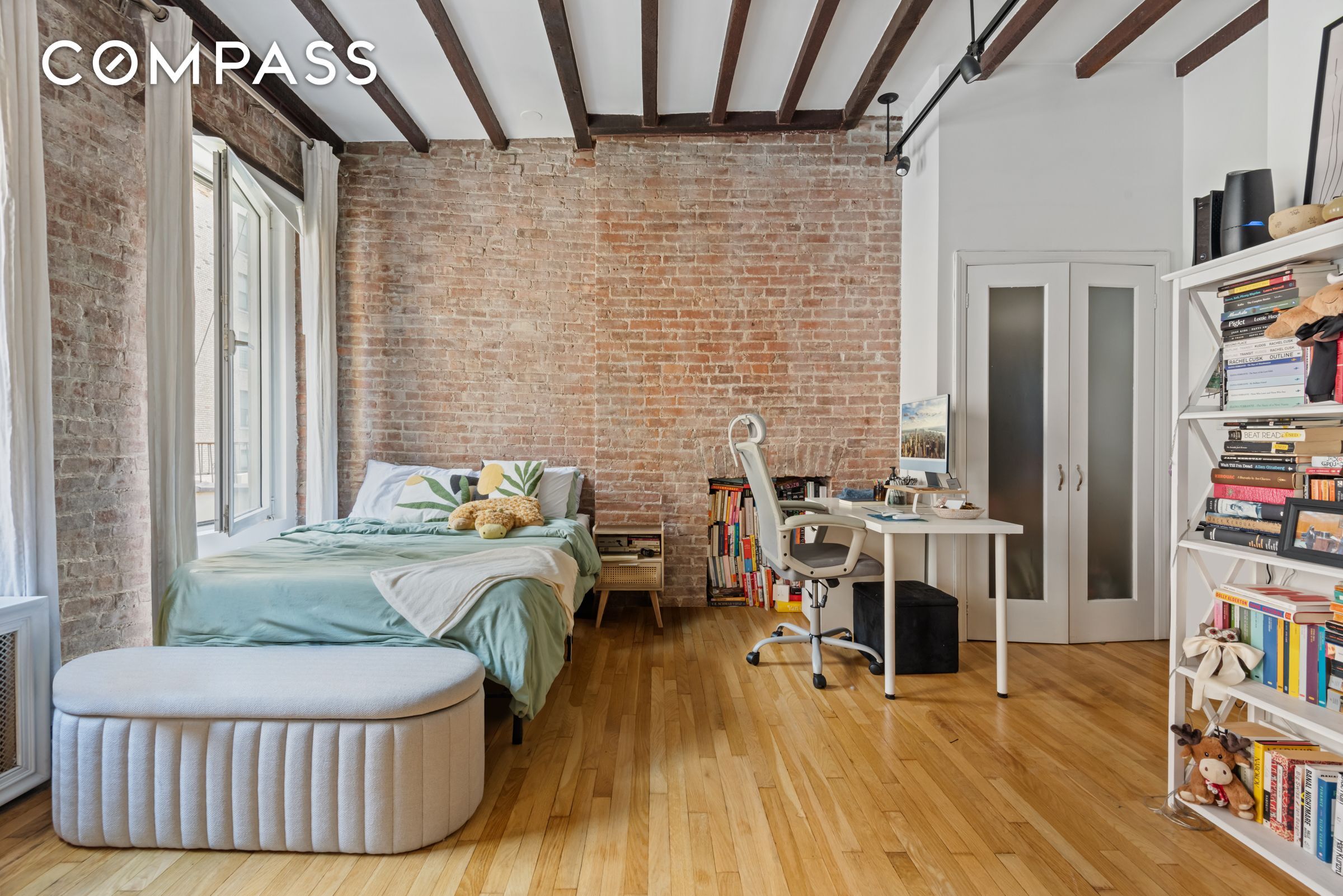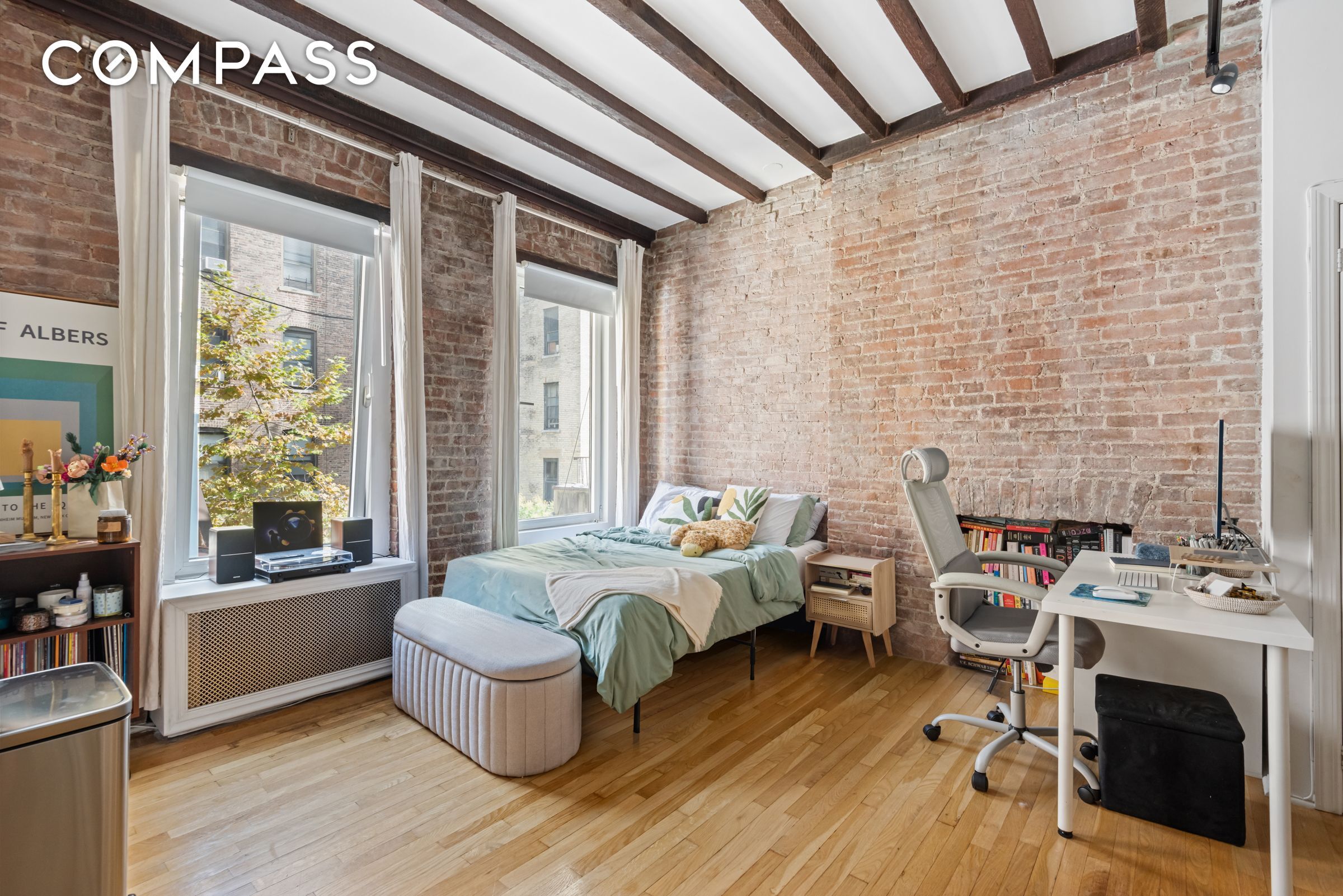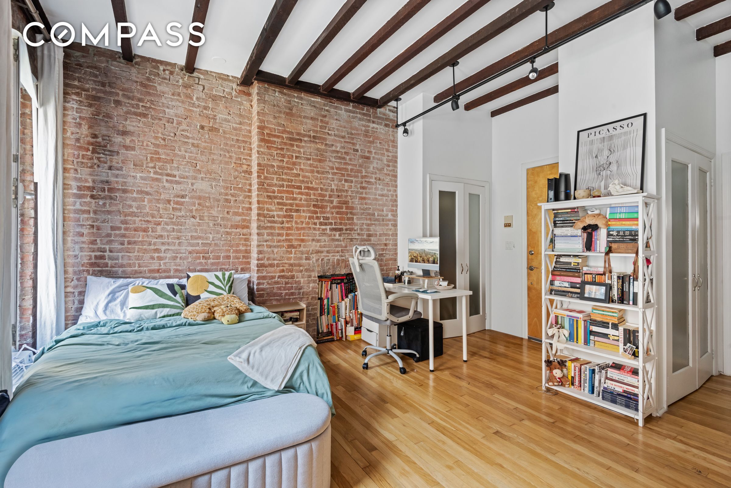 This level houses two distinct studio apartments. The south-facing studio features original hardwood floors, a kitchenette, and a bathroom. The north-facing studio is a renovated free-market unit which boasts exposed brick, wood-beamed ceilings, and a private terrace—a rare and special retreat in the city. Unit 3 is rented at market rate, while Unit 4 is currently unoccupied and used by the owner. Ceiling height: 9'6".