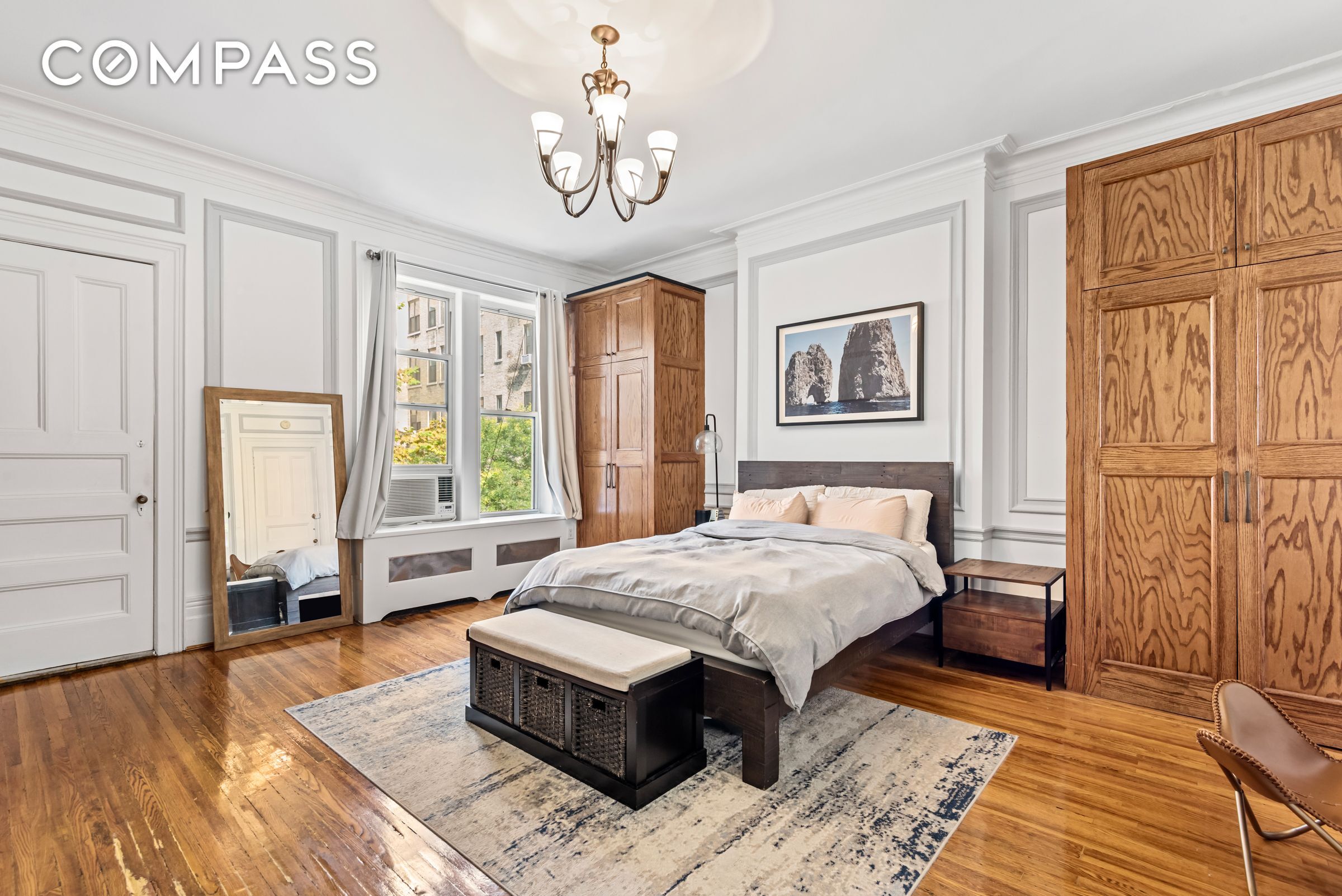 A sunlit, free-market one-bedroom residence exuding Parisian charm. Highlights include a large sitting room, ample closet space, and a well-appointed kitchen with custom cabinetry, modern appliances, and in-unit laundry. The oversized bedroom at the rear features intricate molding, custom-built armoires, and classic hardwood floors. Ceiling height: 10'3".
