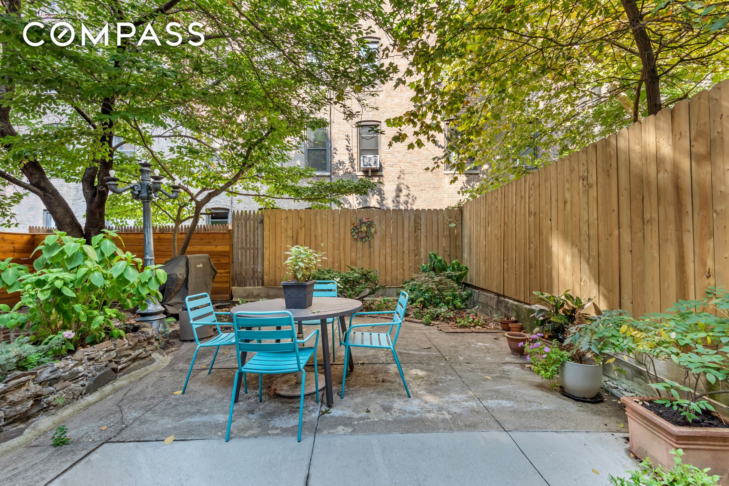 A true sanctuary, this expansive duplex features a private garden and elegant living spaces. The garden level offers a charming one-bedroom, one-bath layout, along with a skylit eat-in kitchen and dining area that opens onto a lush 31' x 19' private garden—perfect for summer entertaining. A spiral staircase leads to the grand second floor, where soaring 11'2" ceilings frame a spacious primary suite with original plaster ceiling details, an en-suite bath with a soaking tub, and an inviting sitting room.