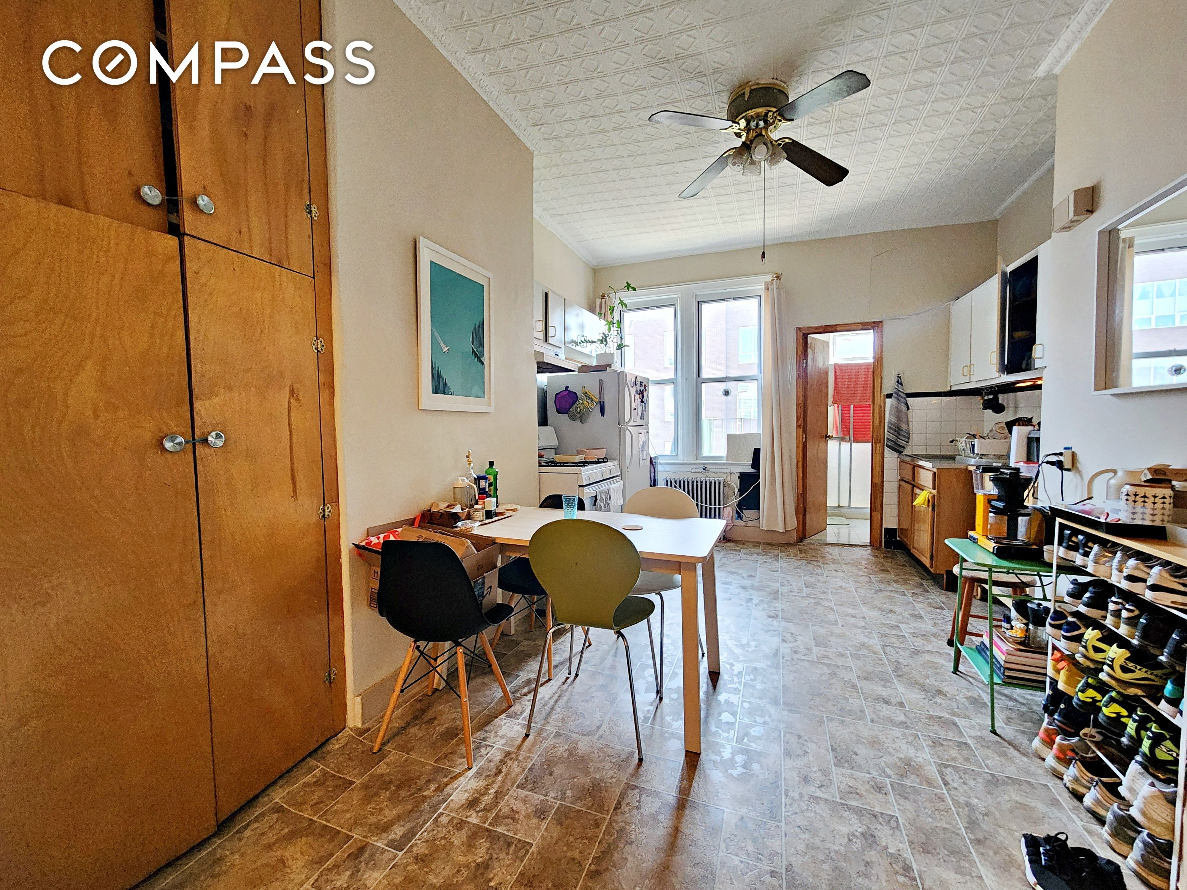 Extra large railroad one bedroom with soaring ceilings, eat in kitchen, king size bedroom, home office, well sized living room, and so much more! Good closet and storage space.
