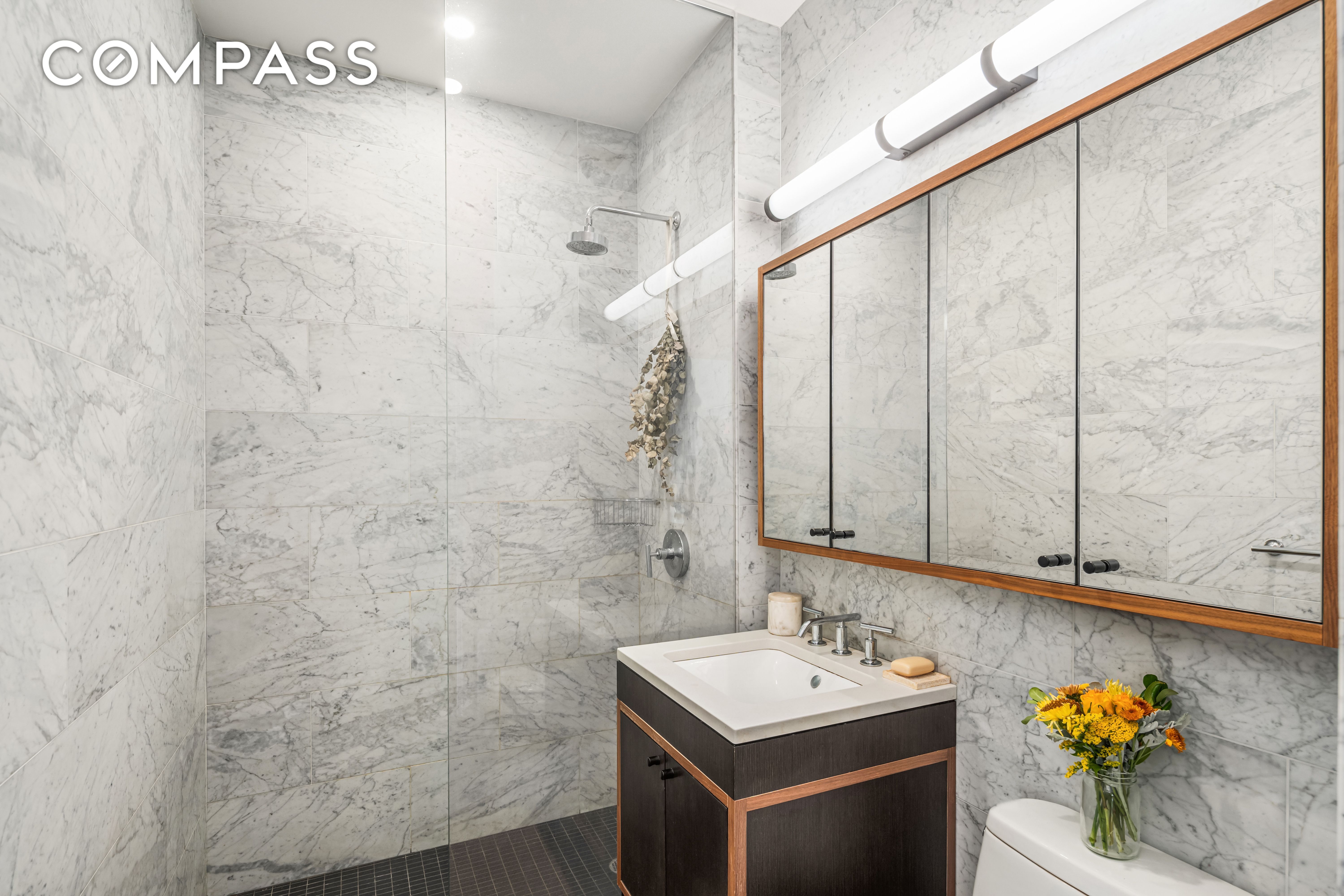 The bathroom features Pietre D’Italia mosaic floor tile, honed Carrara stone walls, Kohler fixtures and a walnut vanity with custom light pendants. The home also features custom window shades, tobacco smoked oak herringbone flooring and has an LG washer/dryer combo.