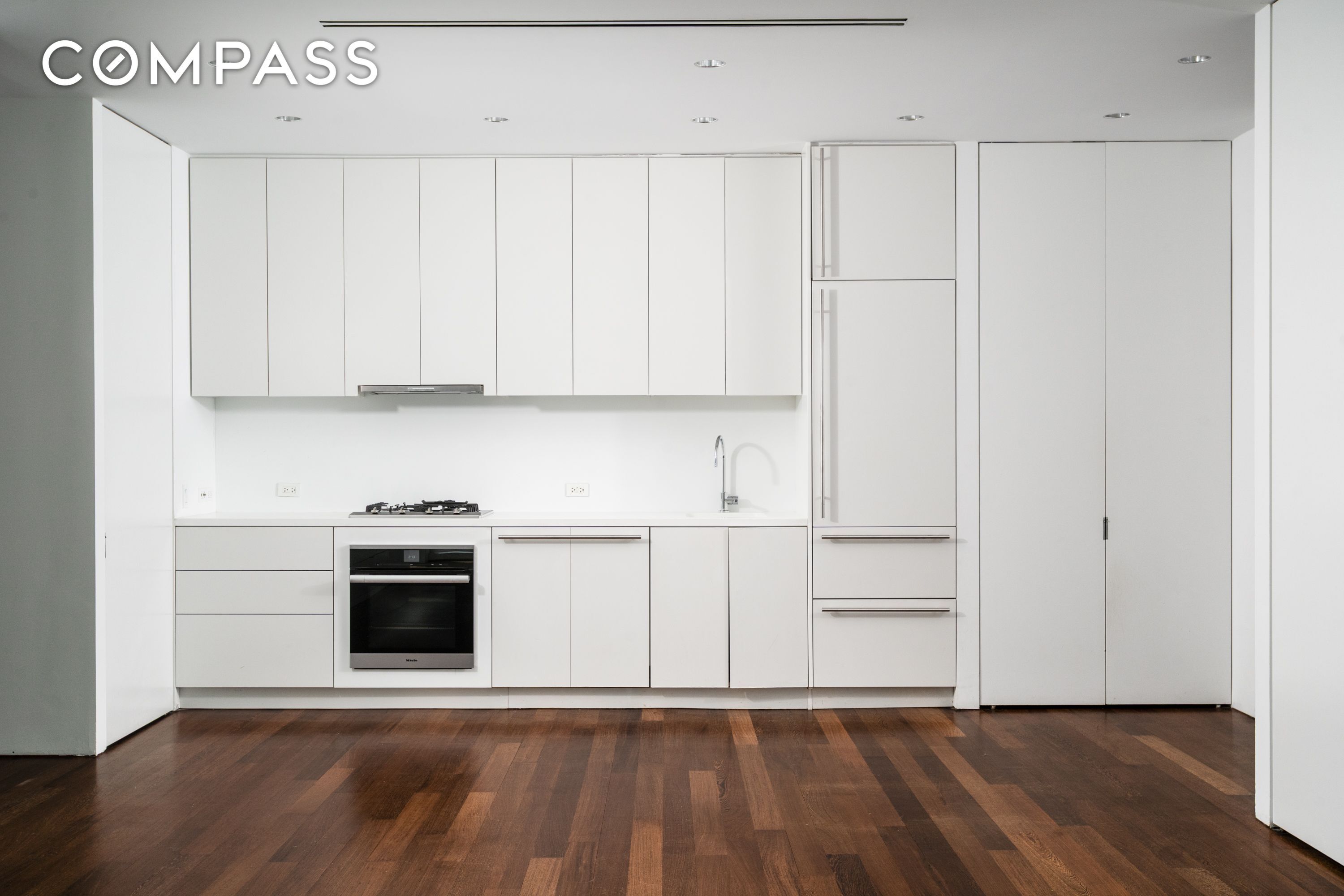 The open-concept kitchen is a vision of minimalist design, featuring pristine white lines adorned with top-of-the-line appliances, a Subzero refrigerator, and Dornbracht fixtures, seamlessly flowing into a spacious living area. Here, wide plank wedge wood flooring creates a perfect environment for relaxation and entertainment.