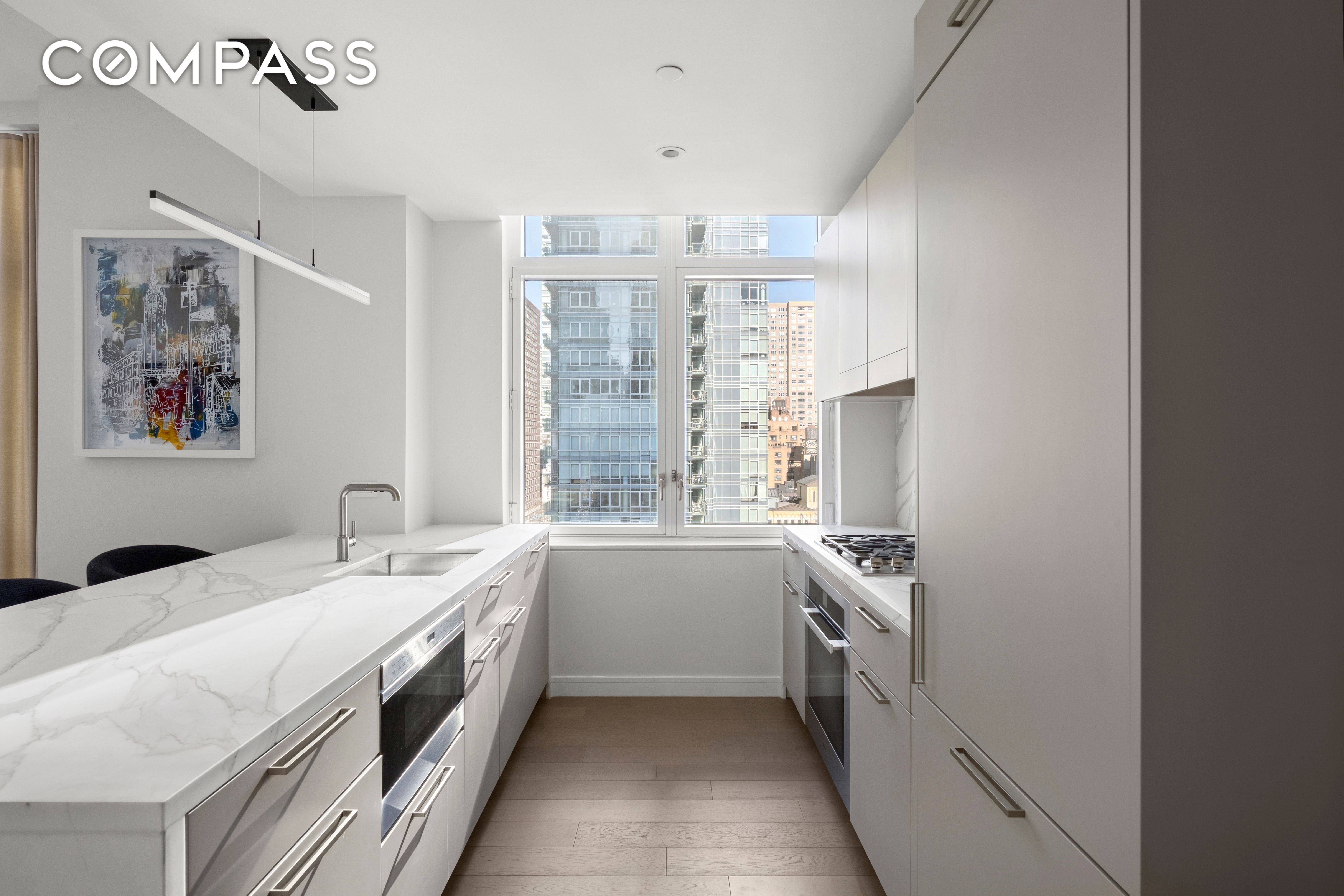 The windowed open kitchen is beautifully appointed with Poliform lacquered cabinetry with soft-close drawers, Calacatta Gold Lignano marble countertops and backsplash, and under-cabinet lighting. It is fully equipped with state-of-the-art appliances, including a Miele refrigerator; 4-burner Miele gas cooktop, electric oven, and exhaust hood; Miele dishwasher; and a Wolf stainless steel microwave. A stainless steel undermount sink is complemented by a Kohler faucet with spray and disposal.