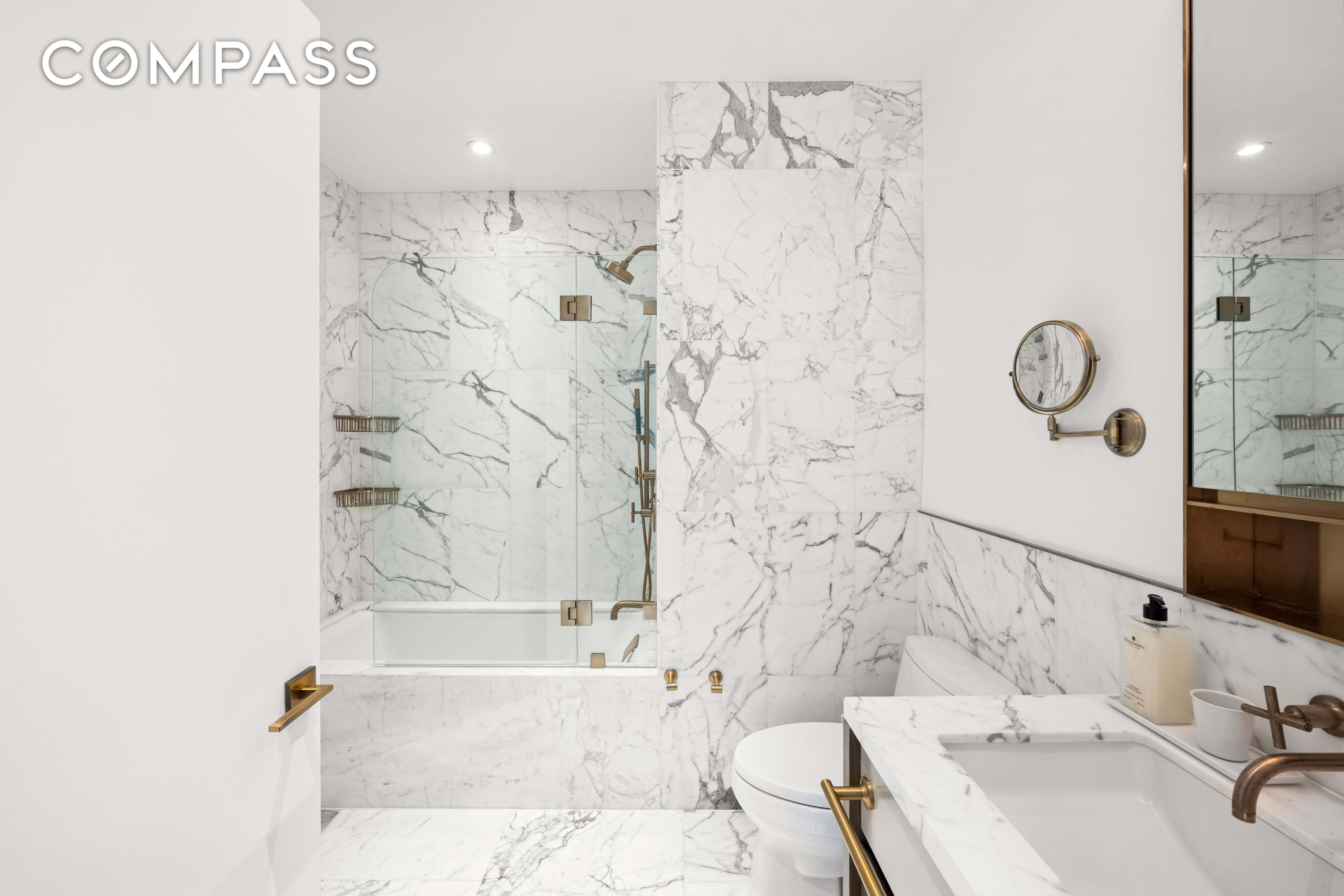 The expansive west-facing bedroom features two large closets and enjoys wonderful afternoon light. The luxurious bathroom is finished with white statuary marble walls and flooring, a white Kohler bathtub/shower, radiant heated floors, and a custom bleached-walnut vanity with marble countertop, storage drawers, and a medicine cabinet.