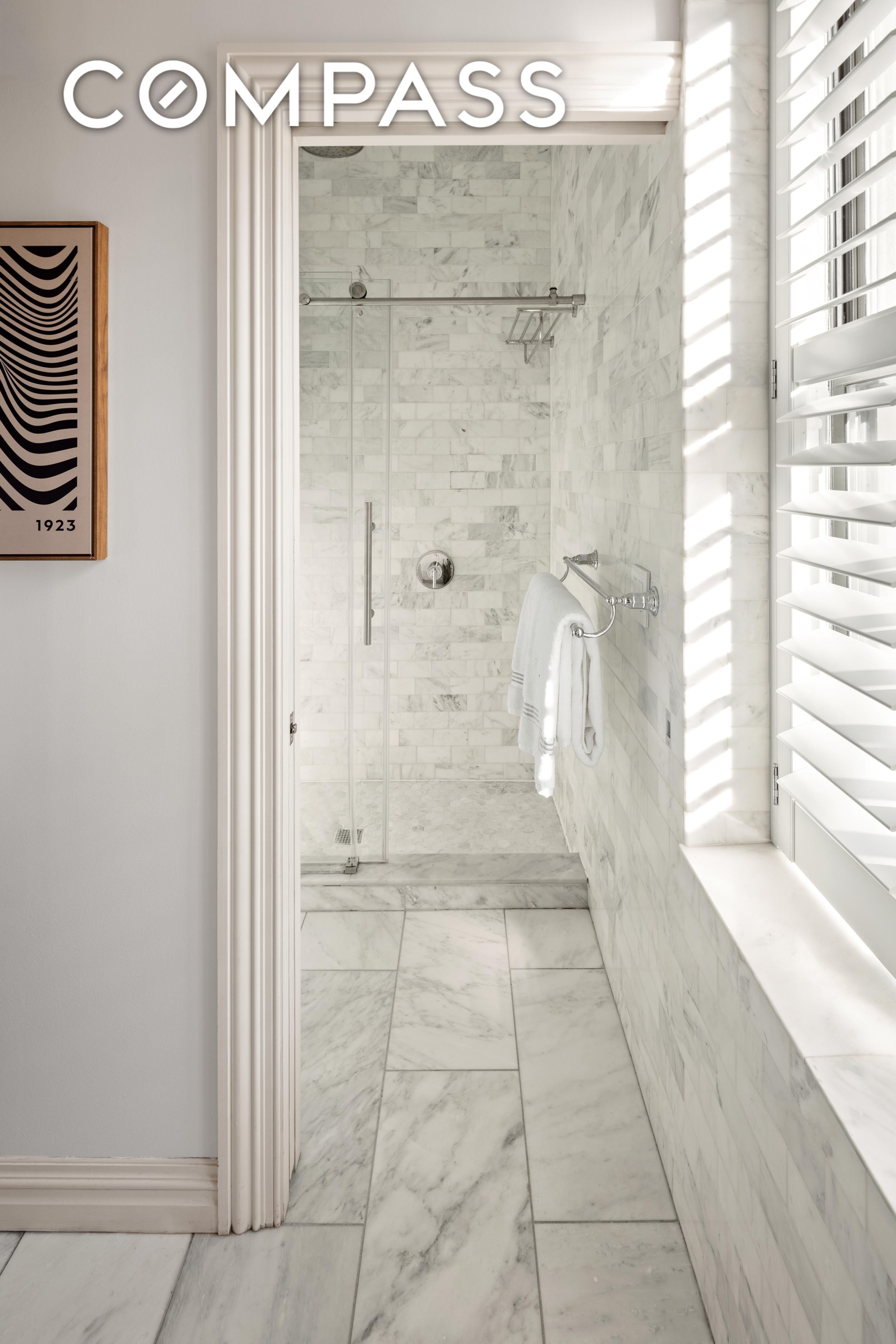 All three bedrooms are privately set at the rear of the home. The primary suite features large custom built-in closets and a marble-clad ensuite bathroom. The additional bedrooms enjoy sunny exposures, ample closet space, and access to a second full bathroom with modern finishes.