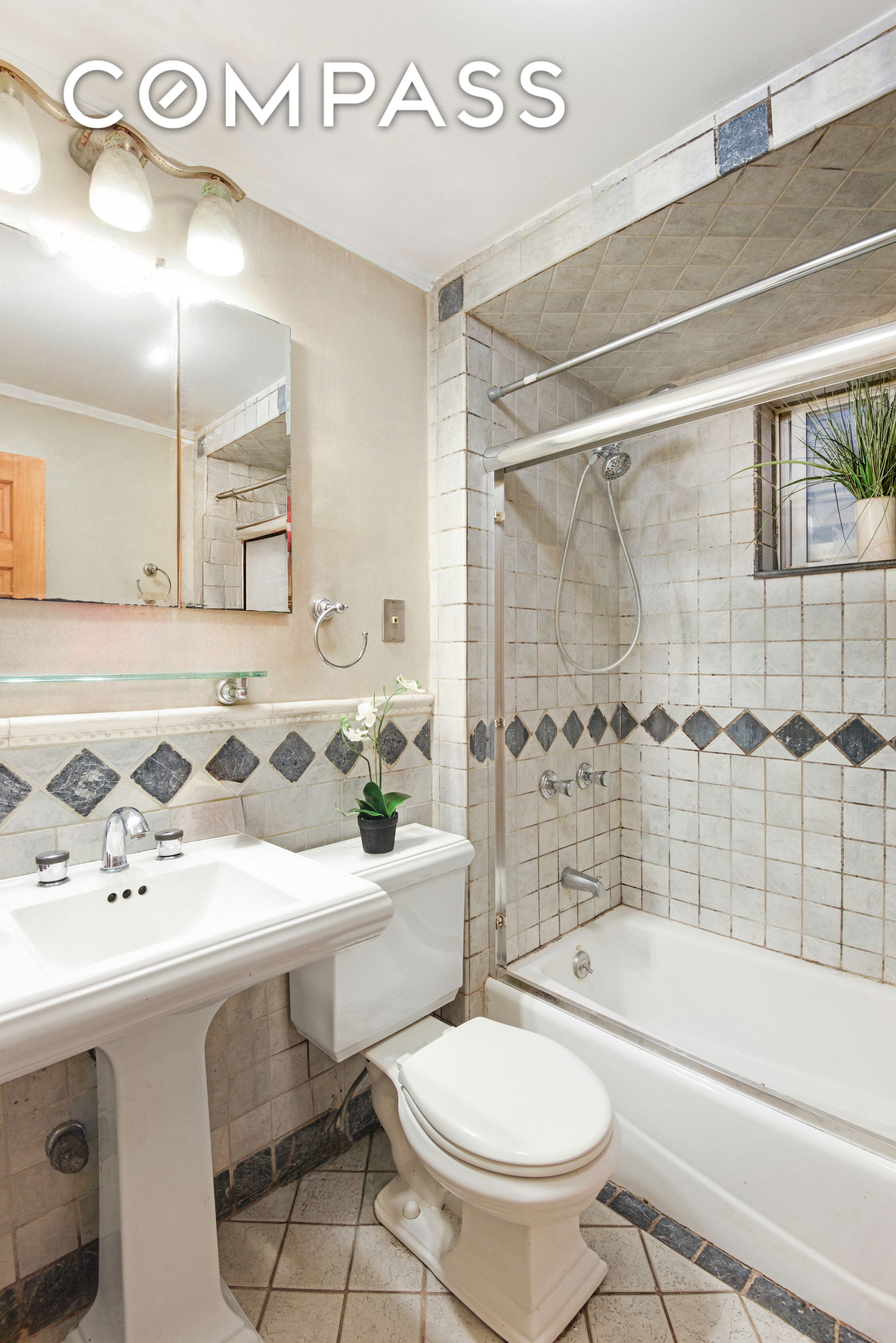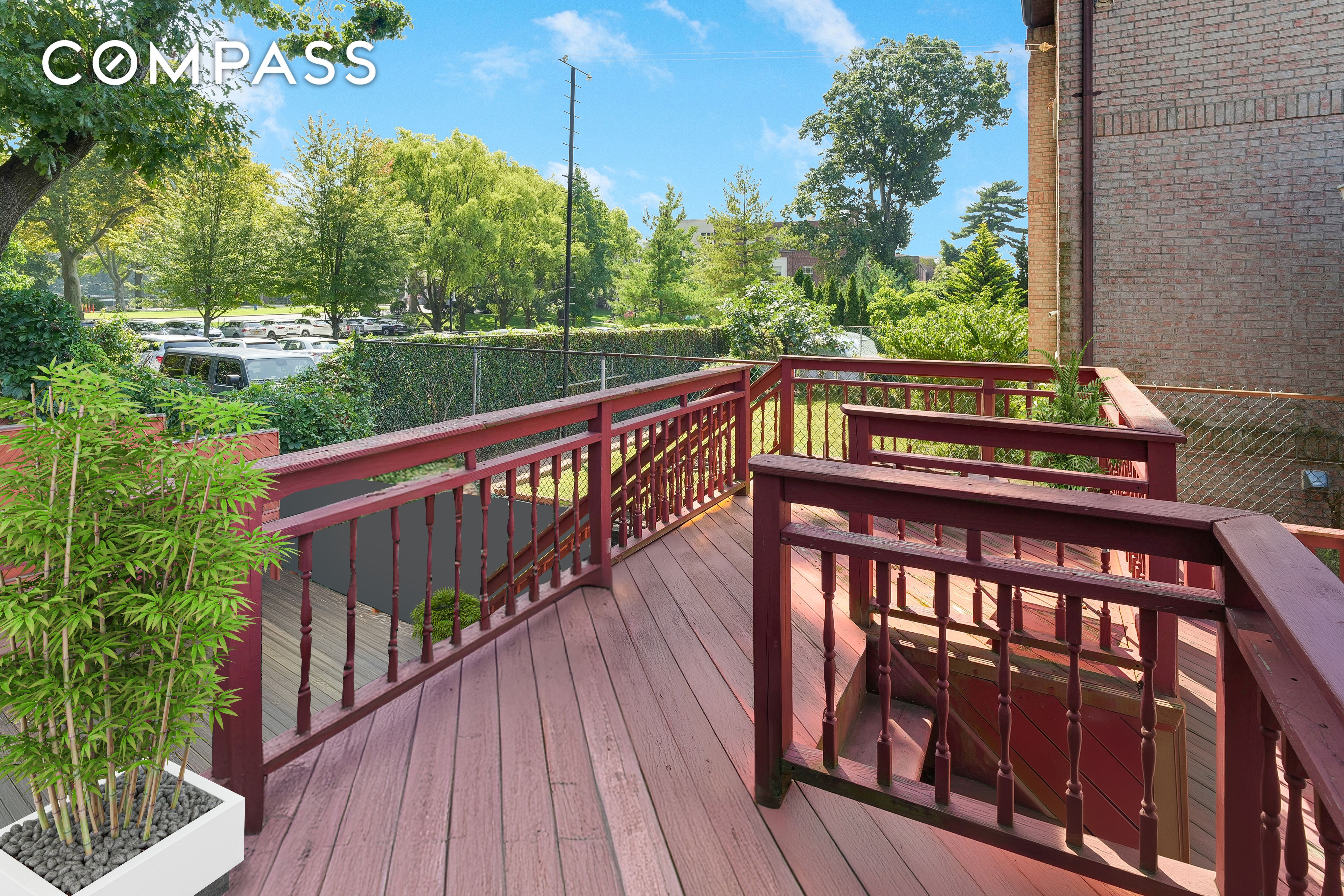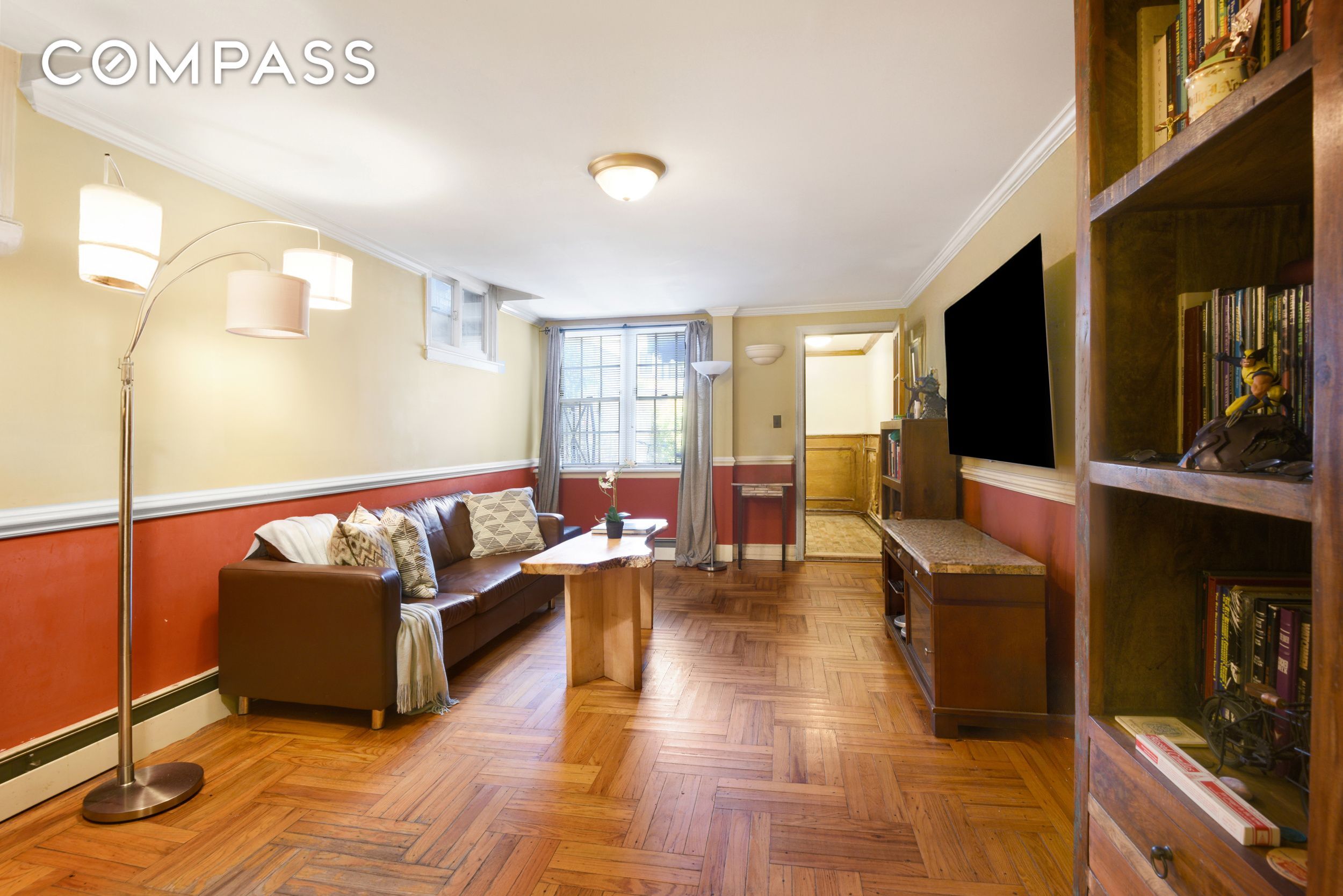 The garden-level first floor welcomes you through a private entrance into a bright and airy living and dining area. A spacious eat-in kitchen, beautifully appointed with rich cherry wood cabinetry and gleaming granite countertops, provides both style and functionality. From here, step out into your private backyard—an ideal oasis for relaxing or entertaining. The generous bedroom offers excellent closet space, while the bathroom features a crisp, white-tiled design with a window that fills the space with natural light.