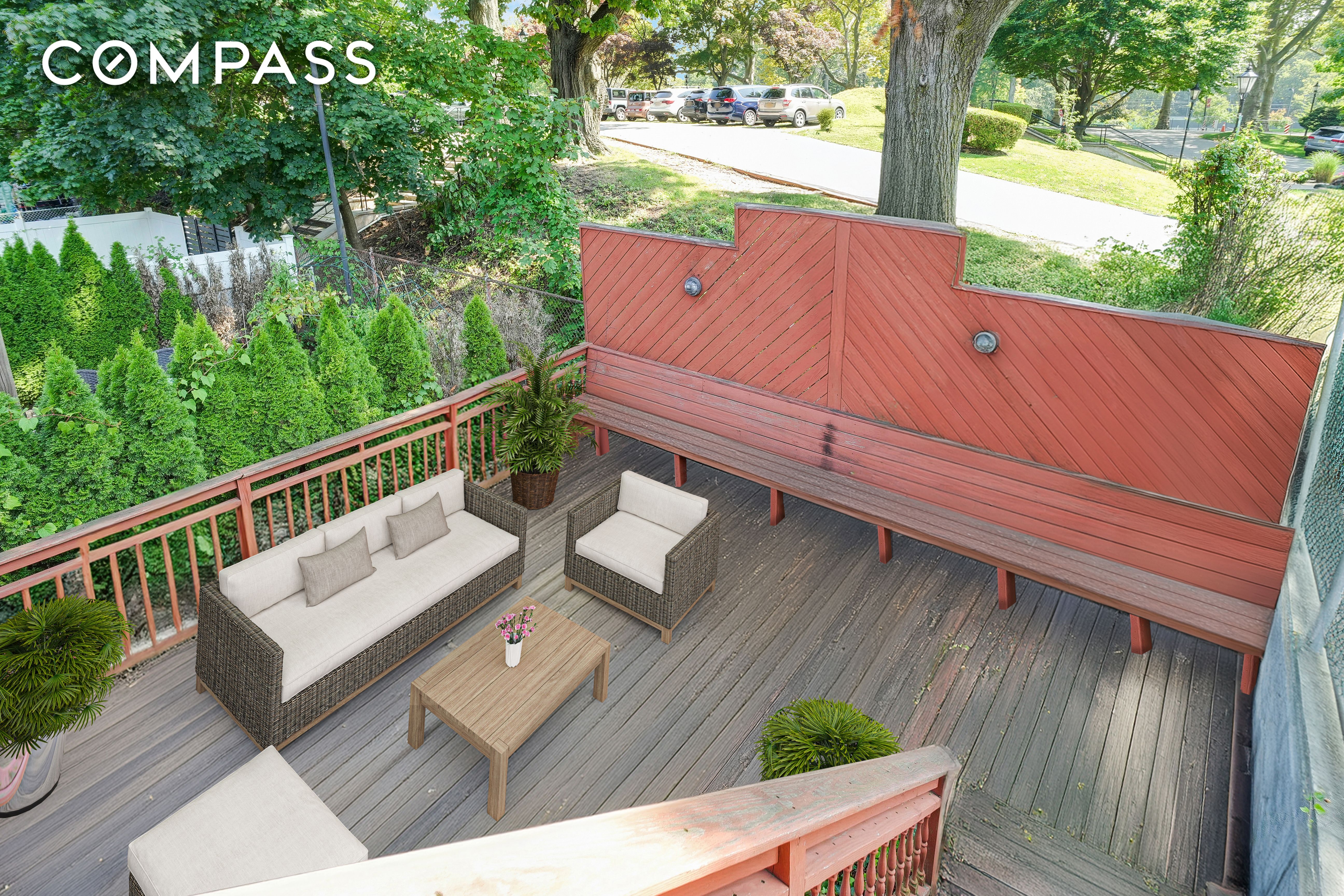 On the second level, charm and character abound. A sun-filled living room provides a warm gathering space, while the true eat-in kitchen with maple cabinetry invites culinary creativity. Unique architectural details, including a striking dome-shaped ceiling cutout and impressive ceiling height, add distinction. The expansive primary bedroom is drenched in natural light, while the second bedroom leads to a private deck overlooking the serene backyard—a perfect escape at the end of the day.